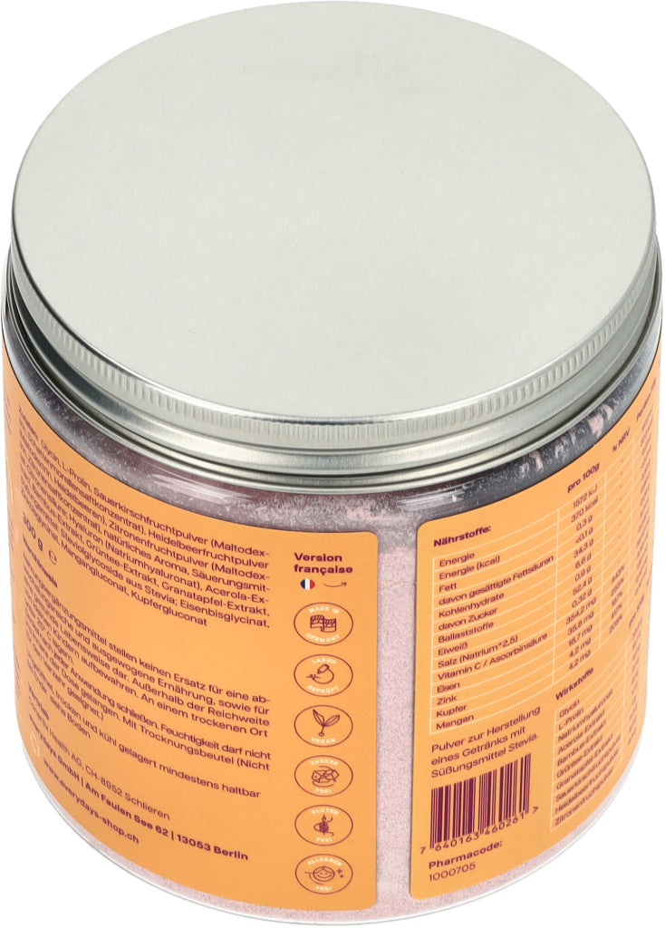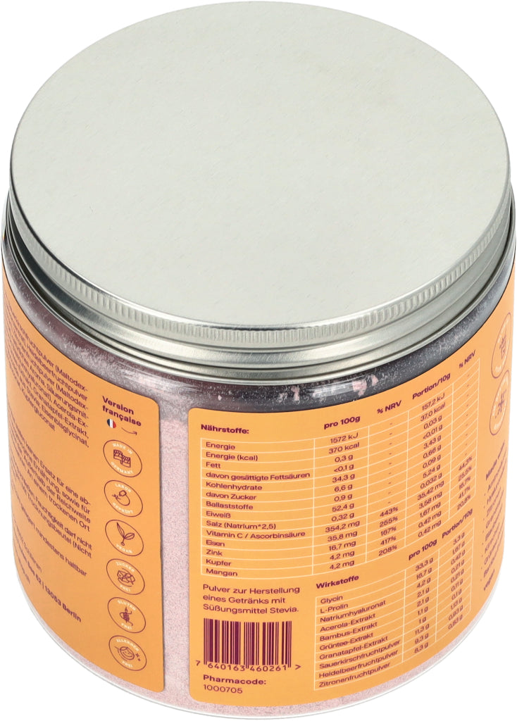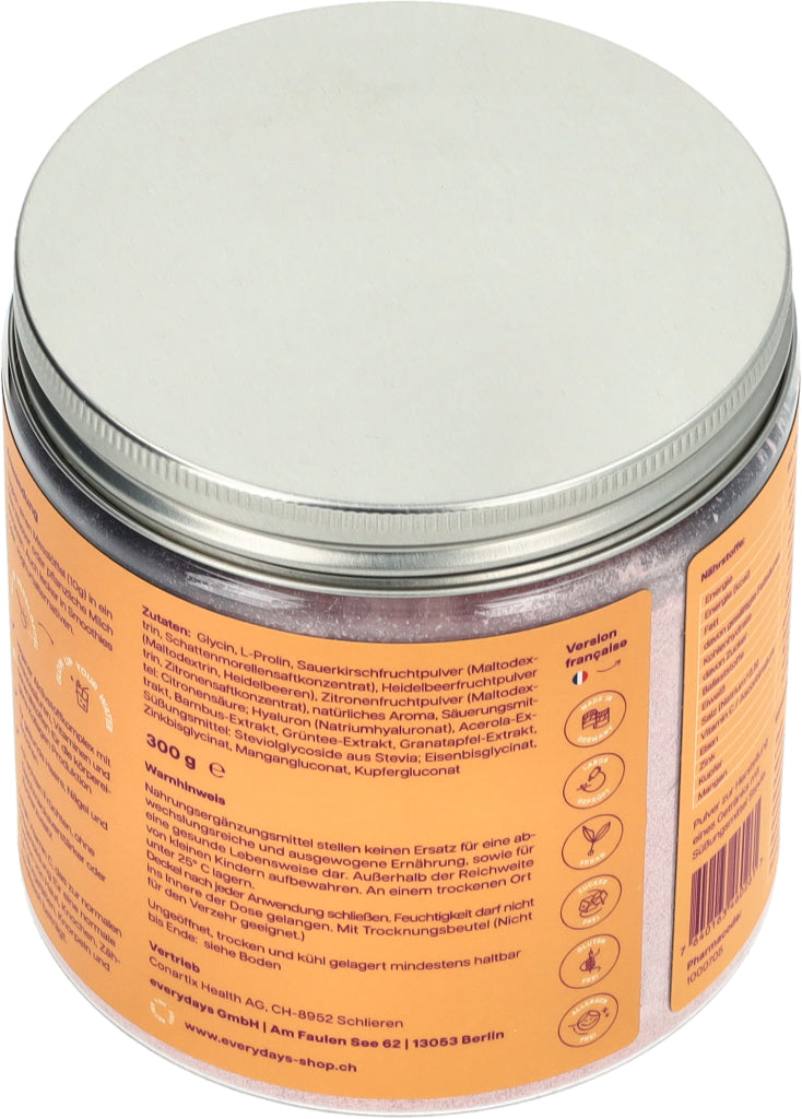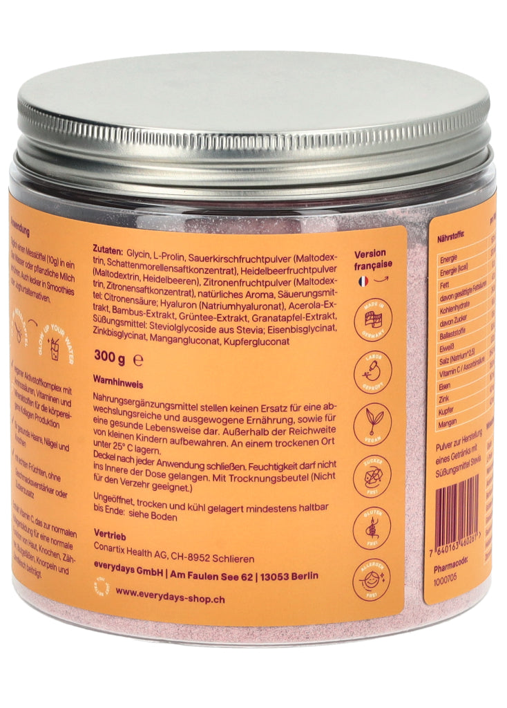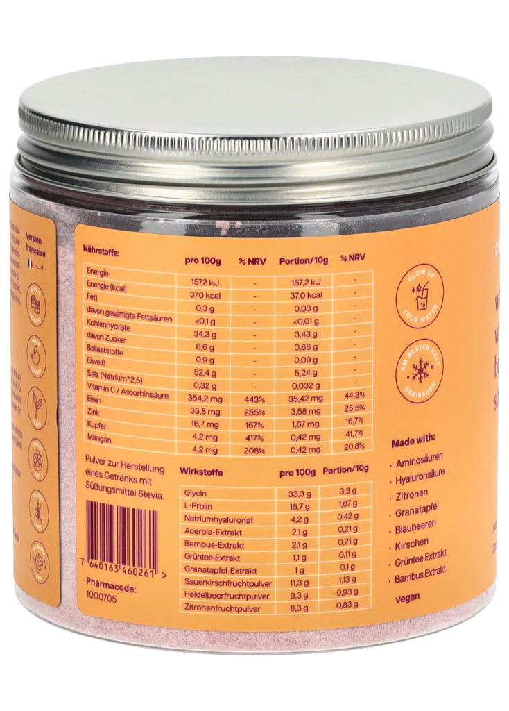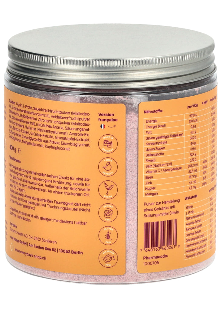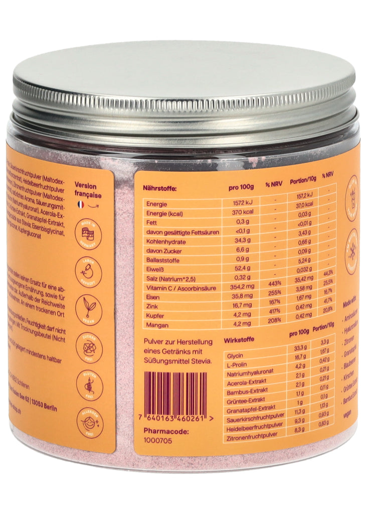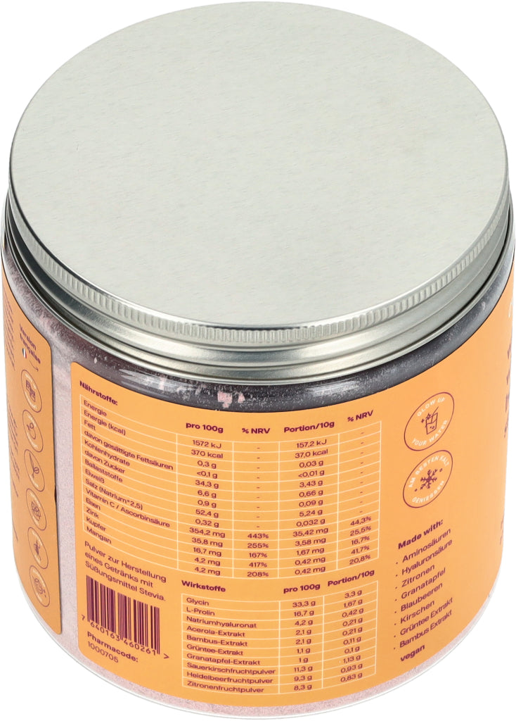 Glycin 3,30 g; L-Prolin 1,67 g; Niedermolekulares Natrium-Hyaluronat 420 mg; Acerola-Extrakt 0,21 g; Bambus-Extrakt 0,21 g; Grüntee-Extrakt 0,11 g; Granatapfel-Extrakt 0,10 g; Sauerkirschfruchtpulver 1,13 g; Heidelbeerfruchtpulver 0,93 g; Zitronenfruchtpulver 0,83 g;