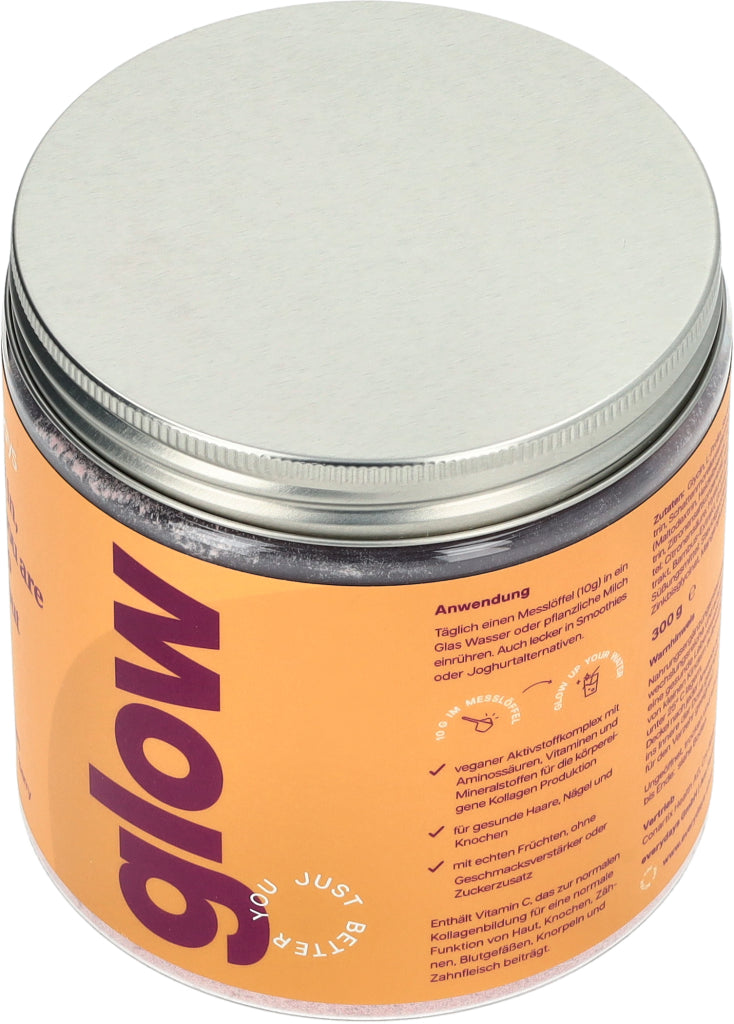 Kollagen besteht hauptsächlich aus Glycin, Prolin und Hydroxyprolin. Hydroxyprolin kann unser Körper mit Hilfe von Vitamin C aus Prolin selber herstellen. Er braucht zusätzlich Kupfer, Zink und Mangan für die Bildung von Bindegewebe, gesunder Haut, Haare und Nägel. Die Antioxidantien in Glow schützen unsere Zellen vor oxidativem Stress.