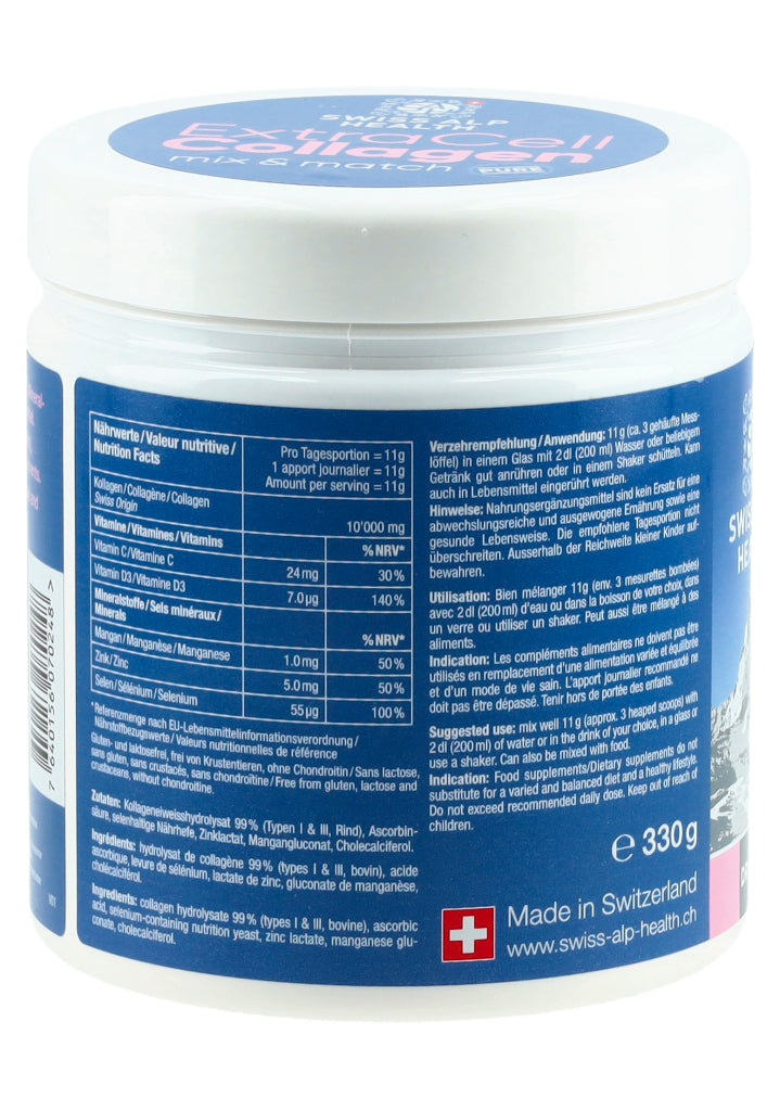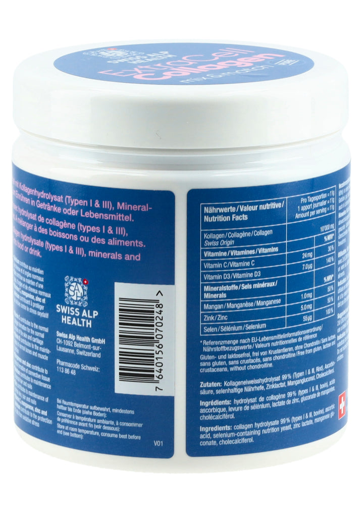 - schweizer Kollagenhydrolysat der Typen I und III: 10'000 mg pro Tagesdosis.