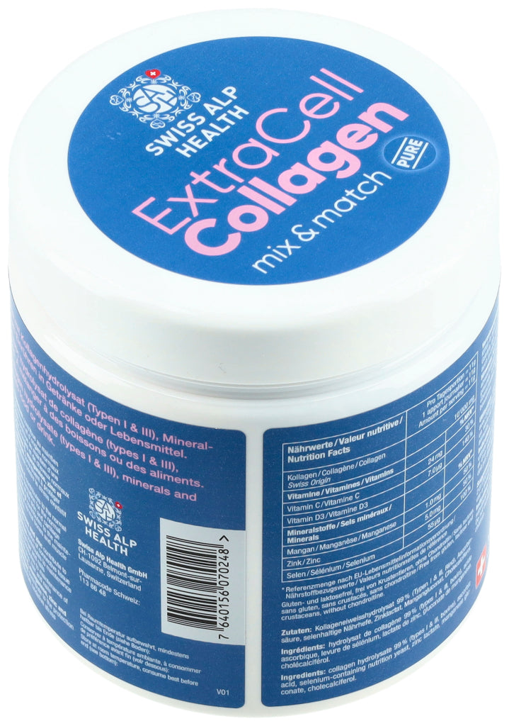 ExtraCellCollagen mix & match vereint spezifische Proteine (Kollagenpeptide der Typen I und III), Mineralstoffe und Vitamine.