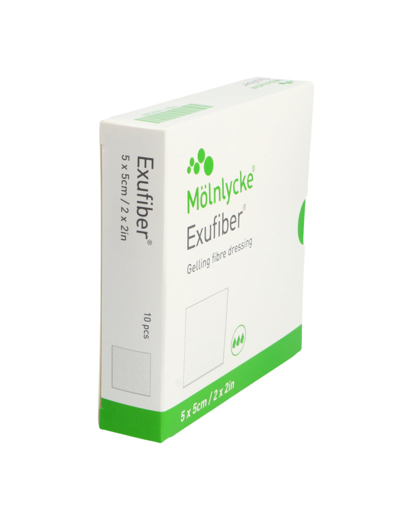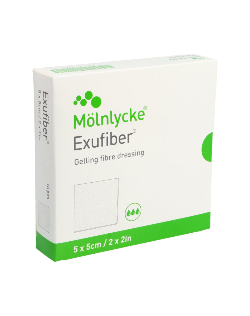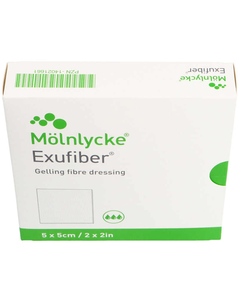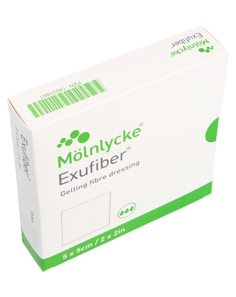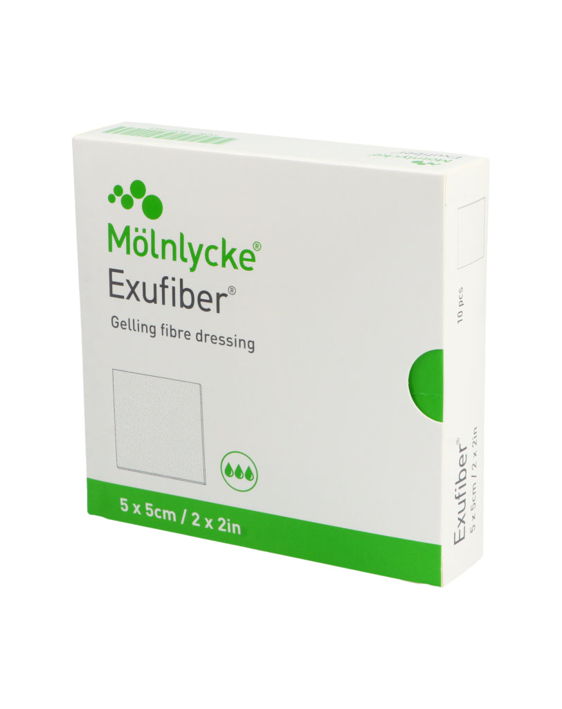Die mechanisch aneinander befestigten Fasern bestehen aus einem starken synthetischen Material, das bei Kontakt mit Flüssigkeit geliert und diese sicher einschliesst. Dadurch erzielt Exufiber höhere Flüssigkeitsretentionsraten als viele andere Verbände auf dem Markt. Die dicht gepackten Fasern halten bakterienhaltiges Exsudat zurück, um zu verhindern, dass die Bakterien wieder in das Wundbett gelangen.