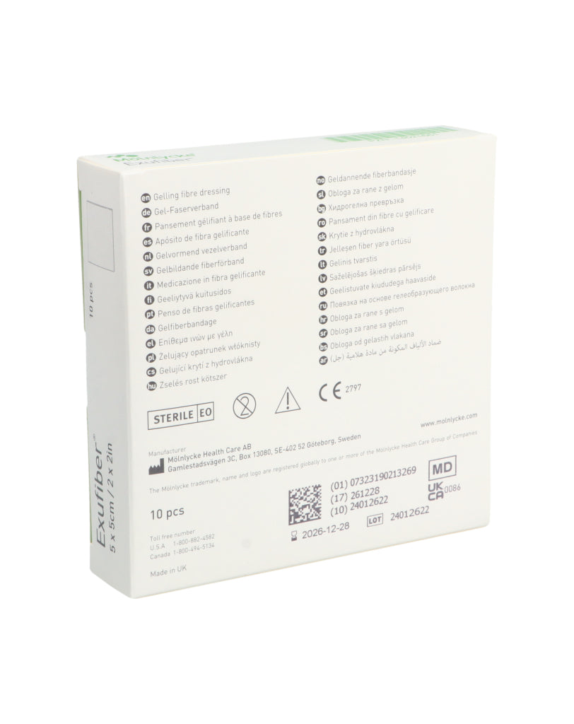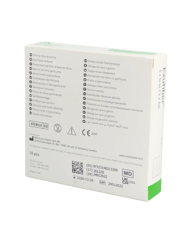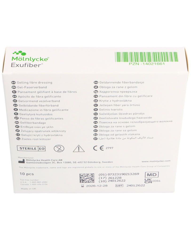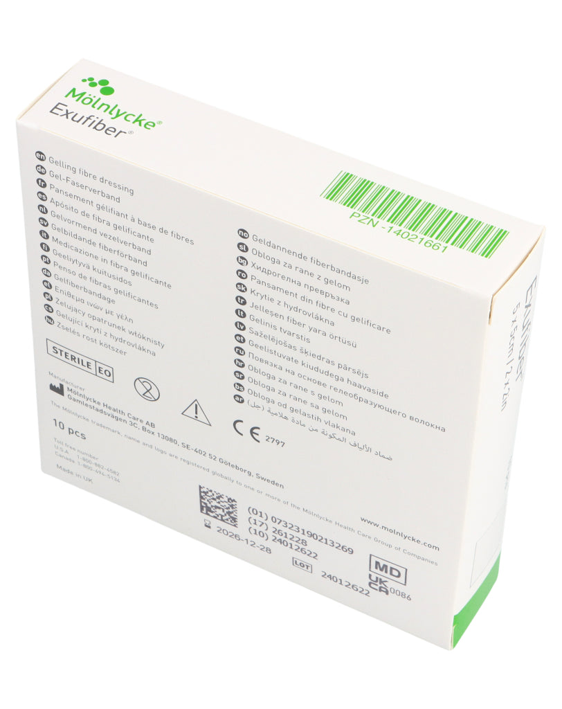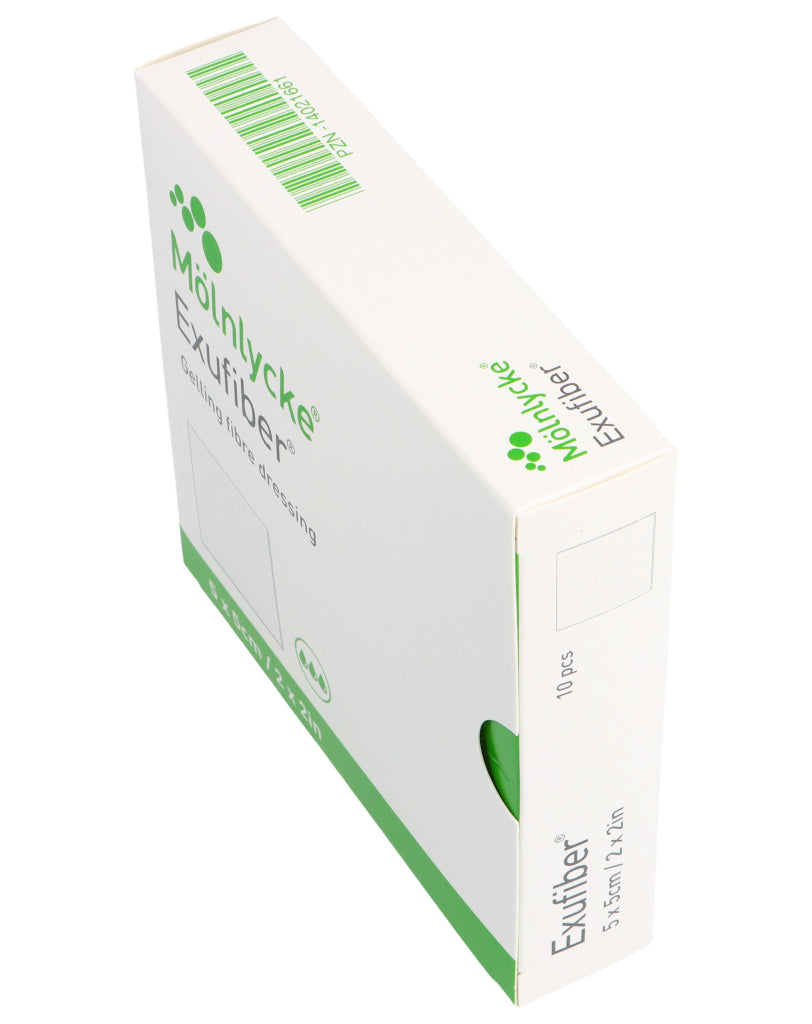 Die mechanisch aneinander befestigten Fasern bestehen aus einem starken synthetischen Material, das bei Kontakt mit Flüssigkeit geliert und diese sicher einschliesst. Dadurch erzielt Exufiber höhere Flüssigkeitsretentionsraten als viele andere Verbände auf dem Markt. Die dicht gepackten Fasern halten bakterienhaltiges Exsudat zurück, um zu verhindern, dass die Bakterien wieder in das Wundbett gelangen.