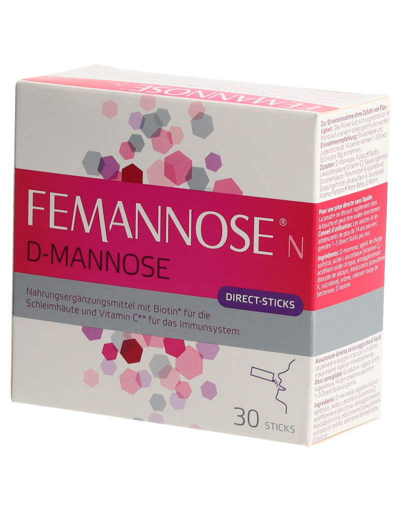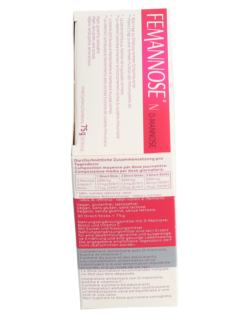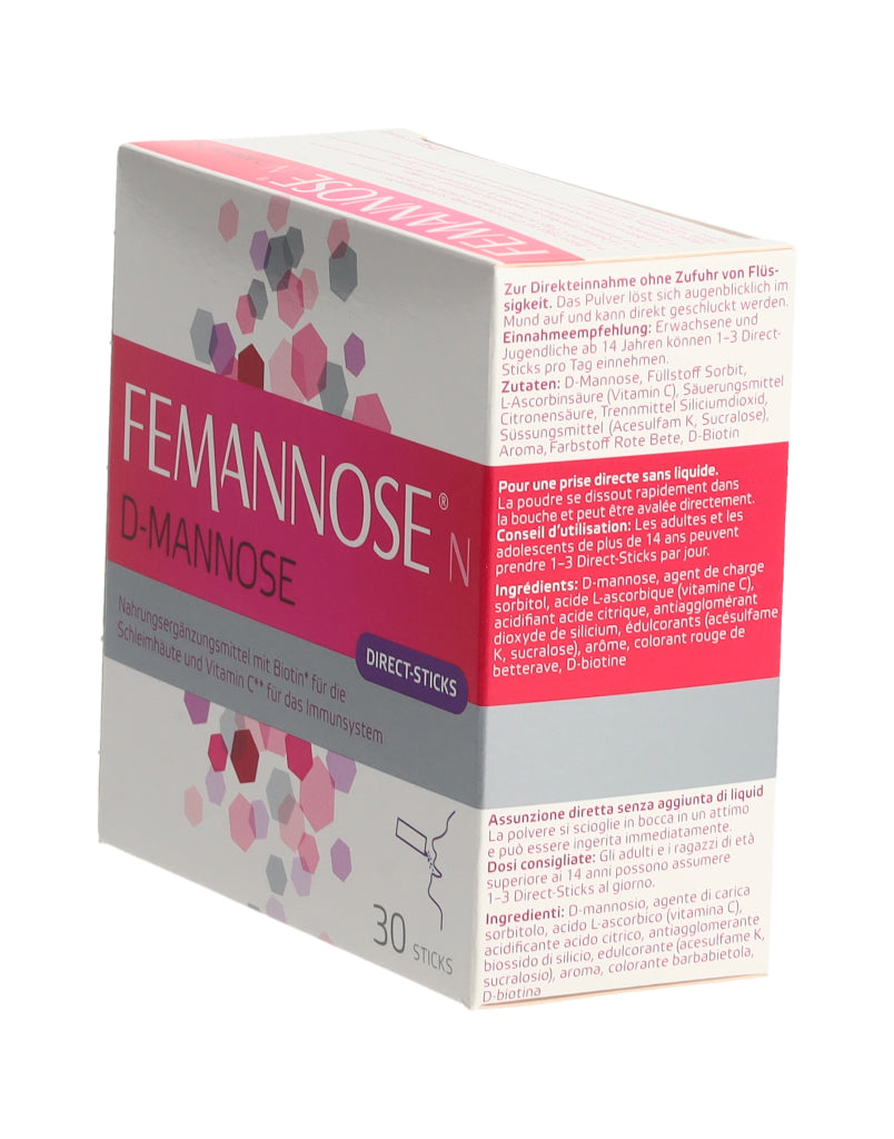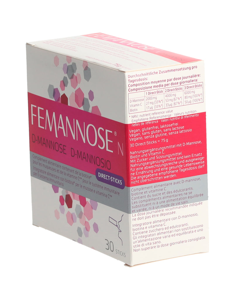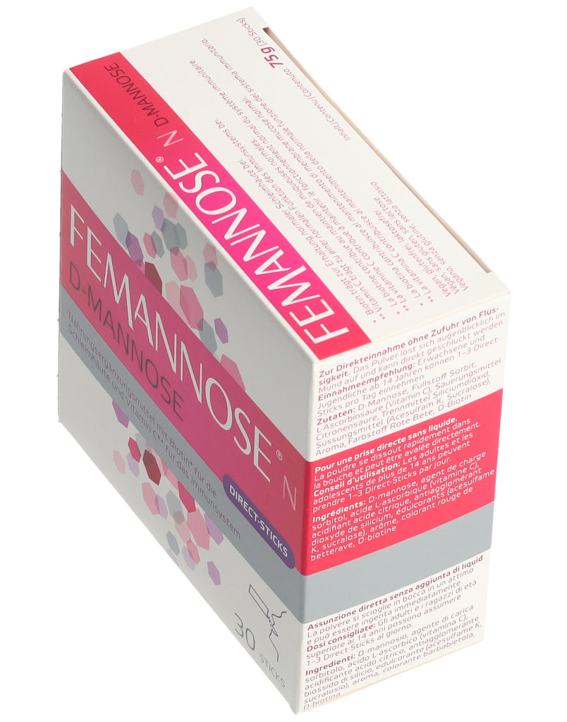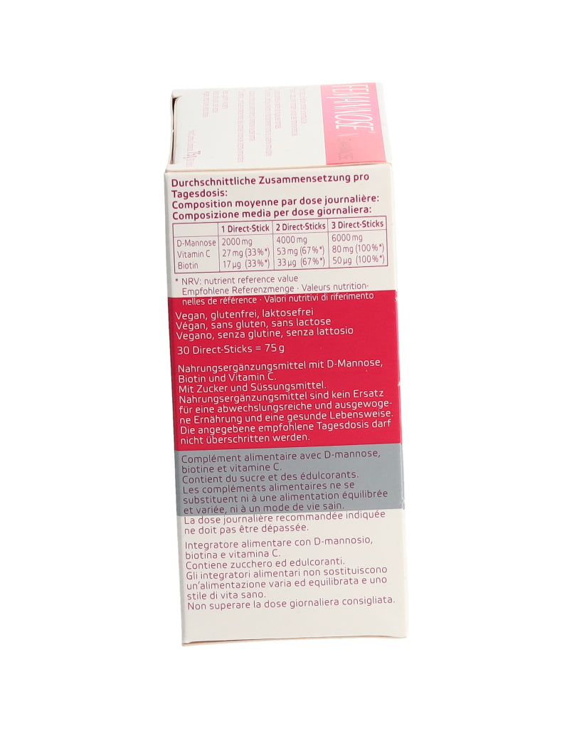 D-Mannose, Füllstoff Sorbit, L-Ascorbinsäure (Vitamin C), Säuerungsmittel Citronensäure, Trennmittel Siliciumdioxid, Süssungsmittel (Acesulfam K, Sucralose), Aroma, Farbstoff Rote Bete, D-Biotin. Pro Direct-Stick: D-Mannose: 2000mg.