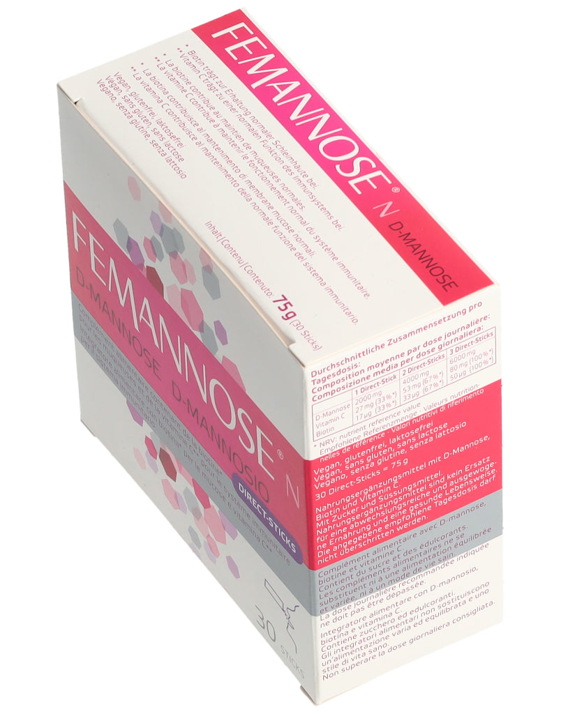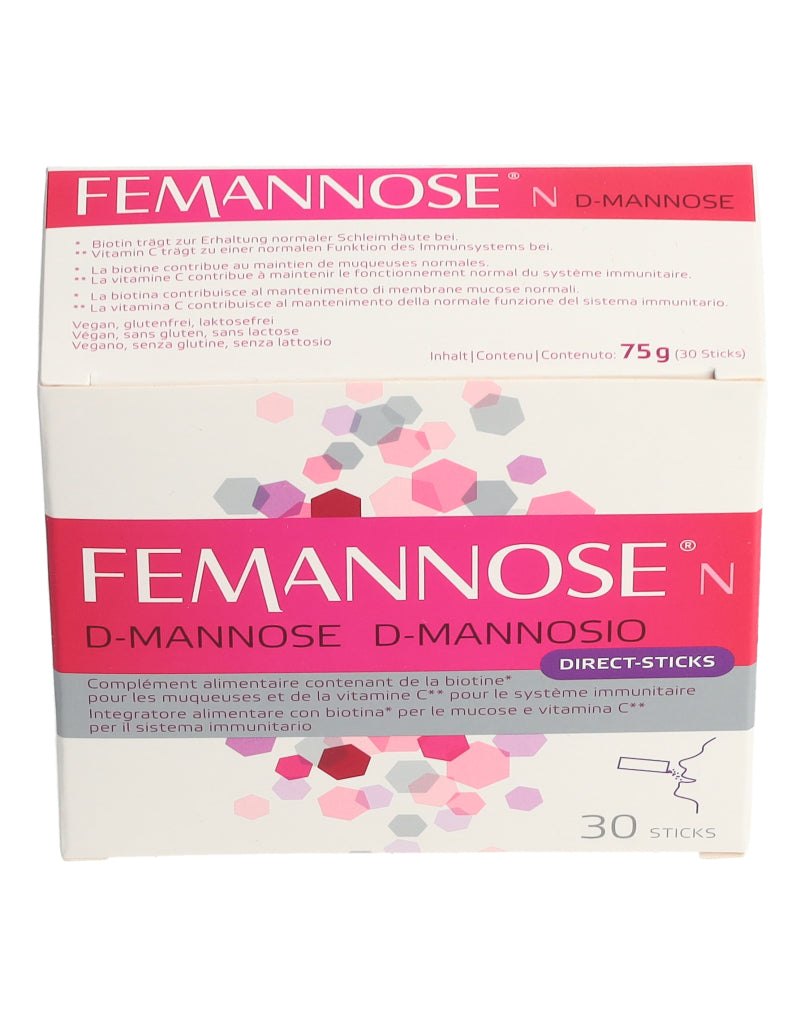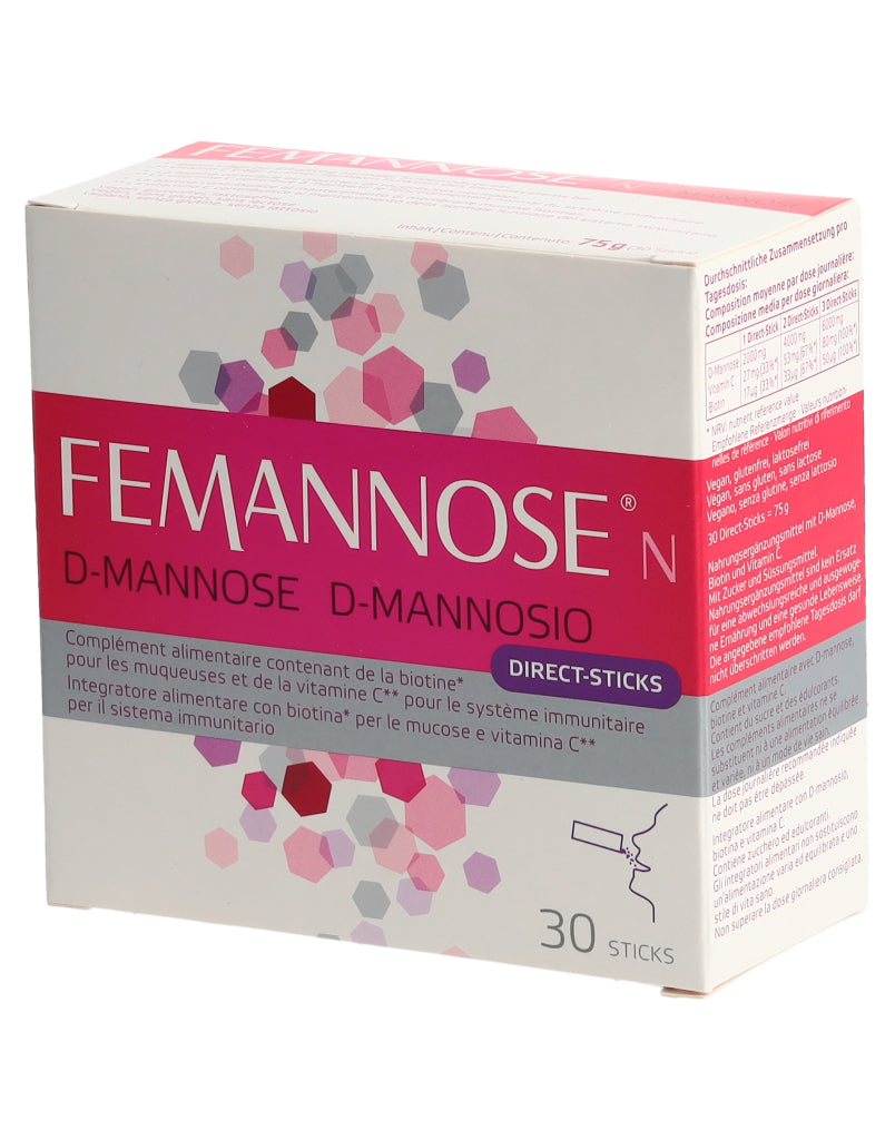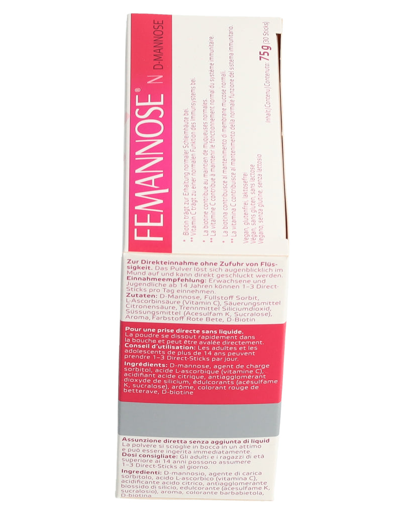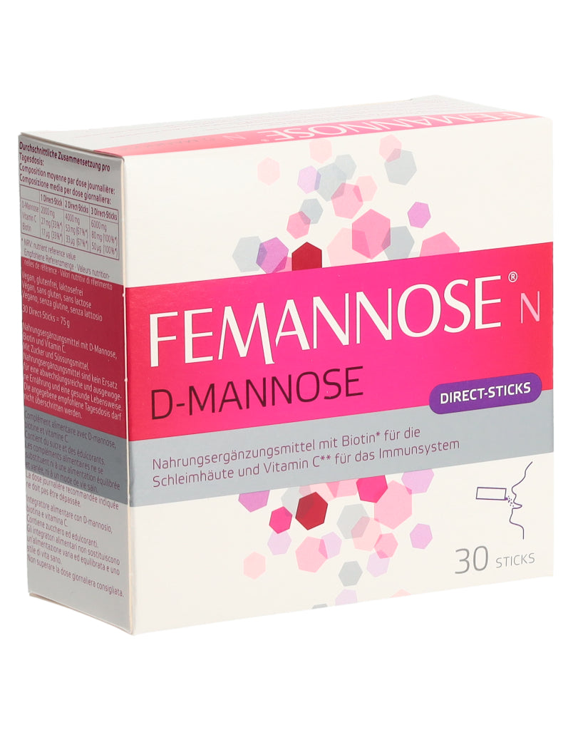 D-Mannose, Füllstoff Sorbit, L-Ascorbinsäure (Vitamin C), Säuerungsmittel Citronensäure, Trennmittel Siliciumdioxid, Süssungsmittel (Acesulfam K, Sucralose), Aroma, Farbstoff Rote Bete, D-Biotin. Pro Direct-Stick: D-Mannose: 2000mg.