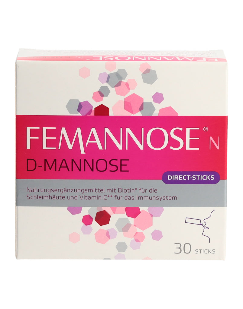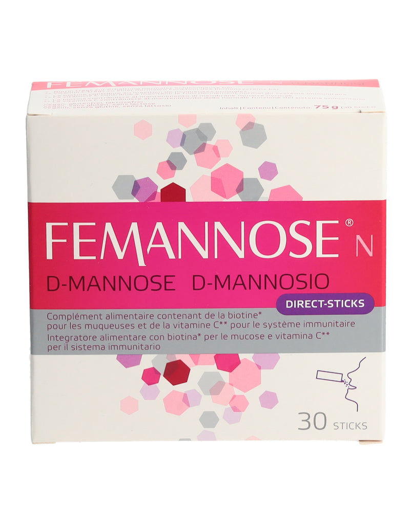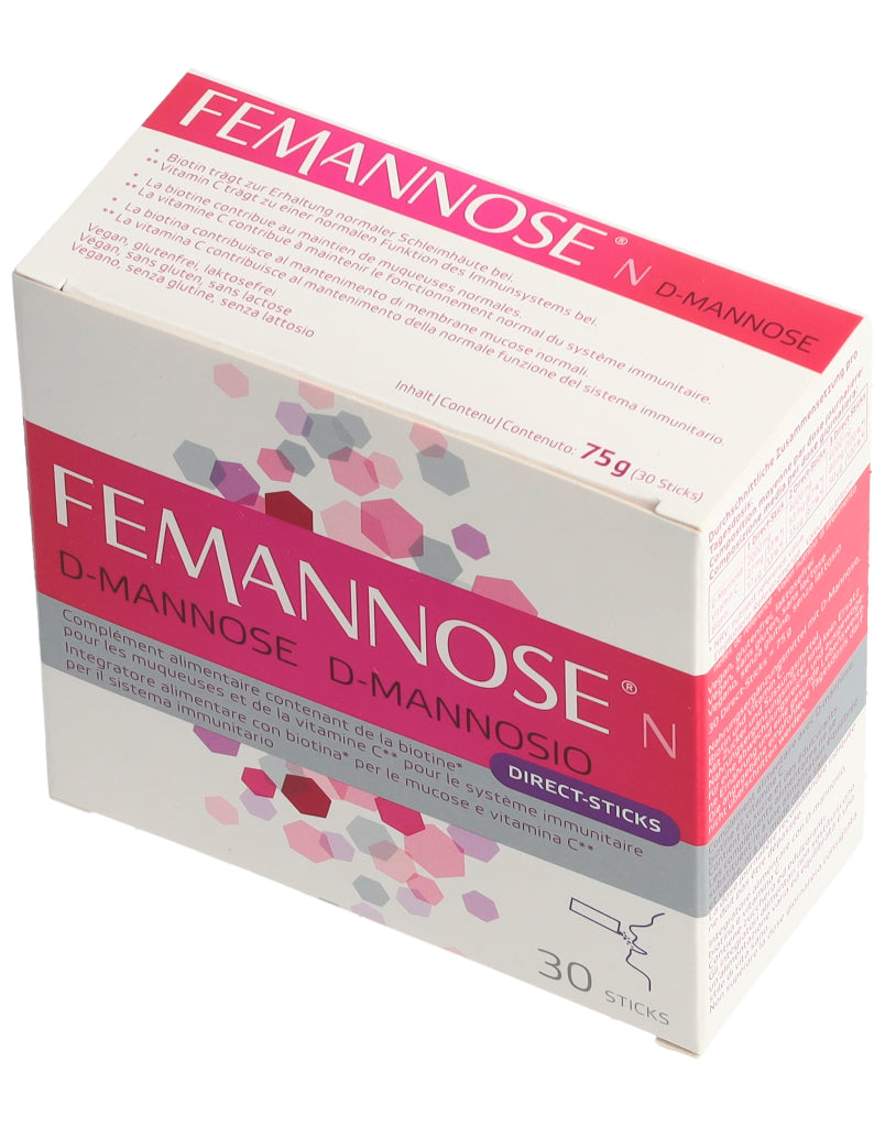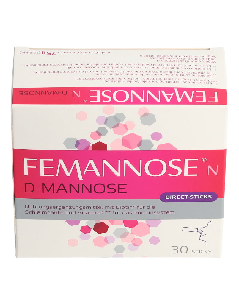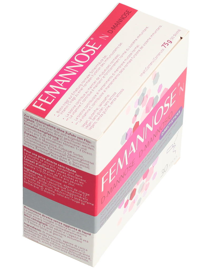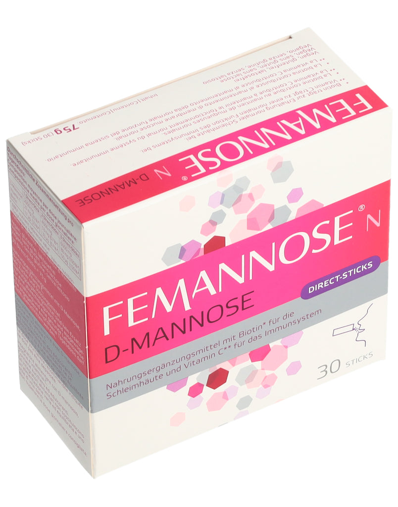 D-Mannose, Füllstoff Sorbit, L-Ascorbinsäure (Vitamin C), Säuerungsmittel Citronensäure, Trennmittel Siliciumdioxid, Süssungsmittel (Acesulfam K, Sucralose), Aroma, Farbstoff Rote Bete, D-Biotin. Pro Direct-Stick: D-Mannose: 2000mg.