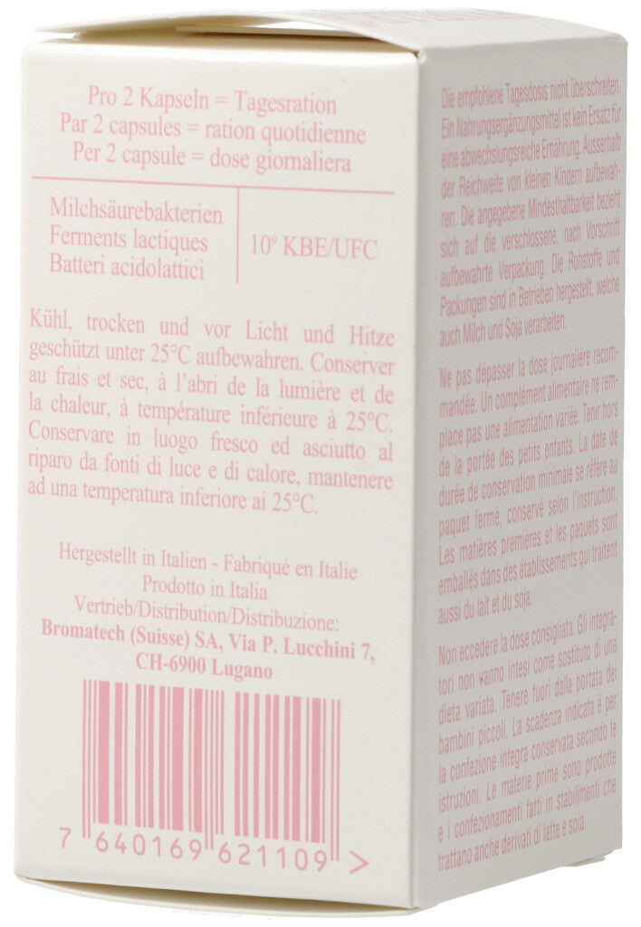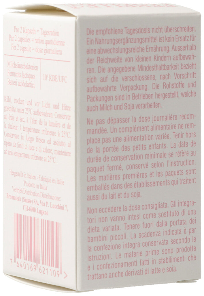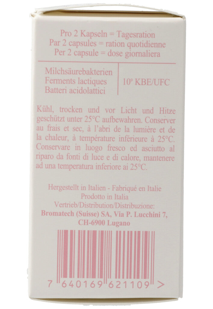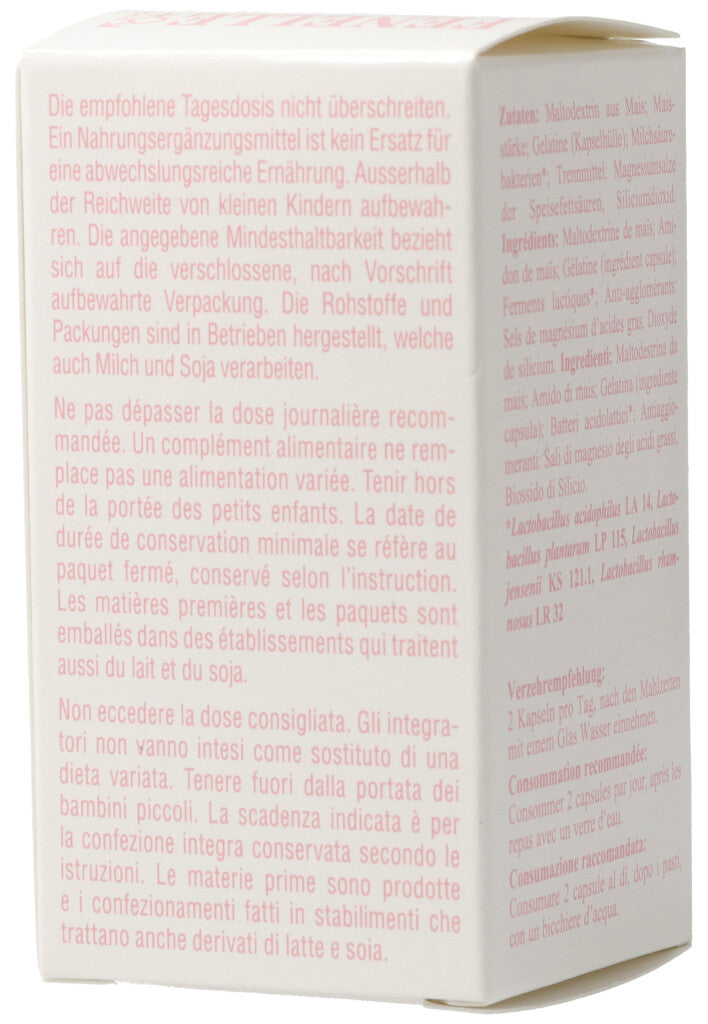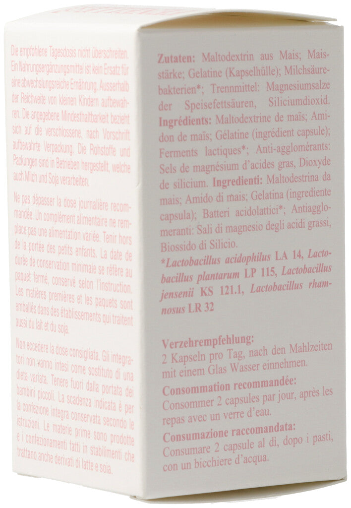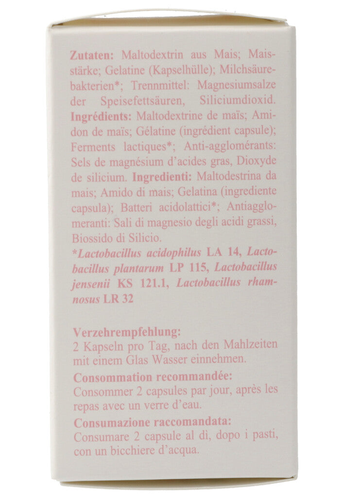 Zutaten: Maltodextrin aus Mais; Maisstärke; Gelatine (Kapselhülle); Milchsäurebakterien*; Trennmittel: Magnesiumsalze der Speisefettsäuren, Siliciumdioxid.