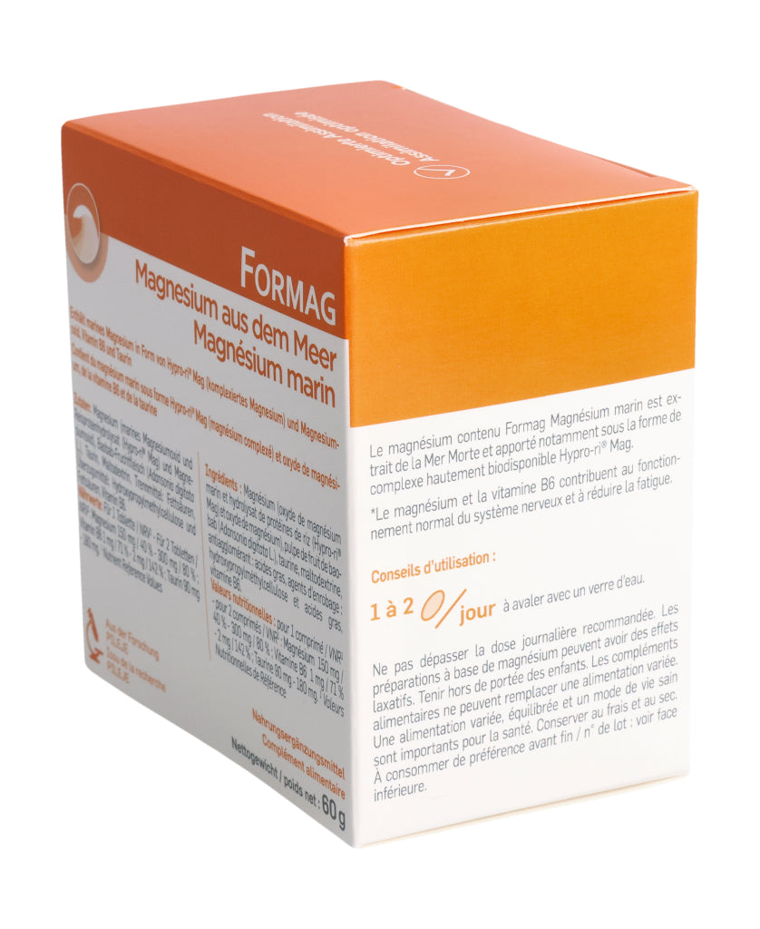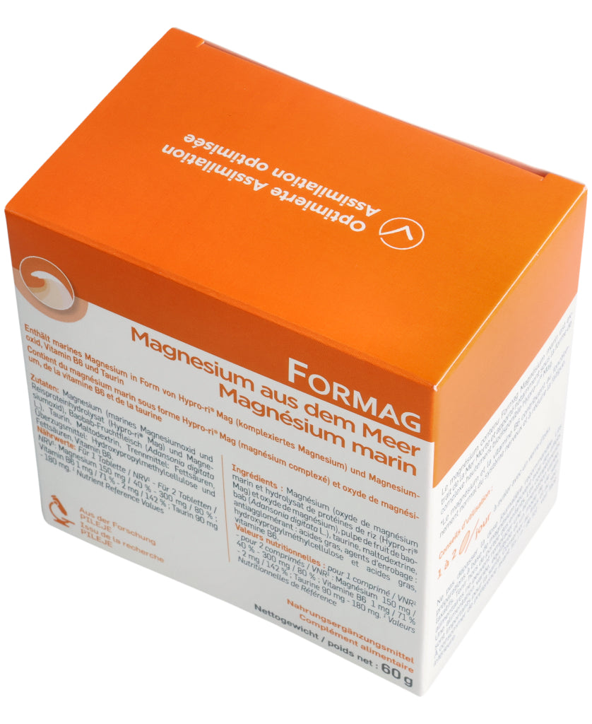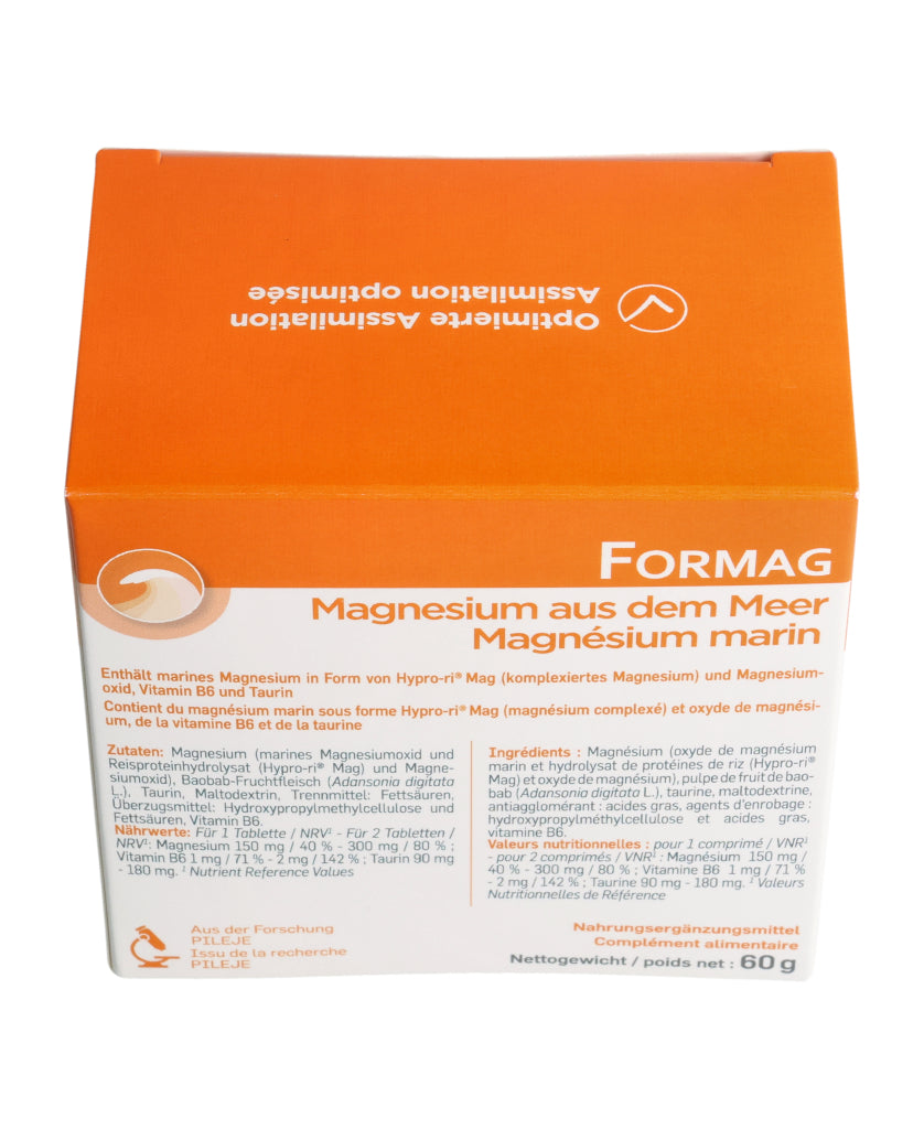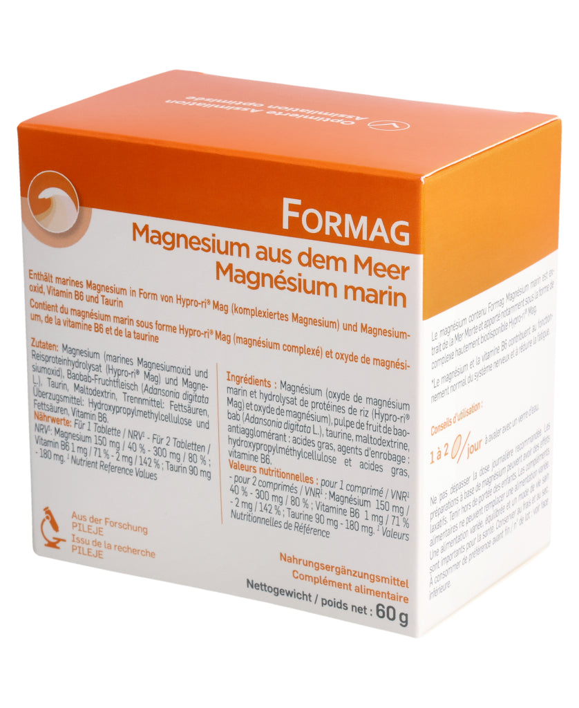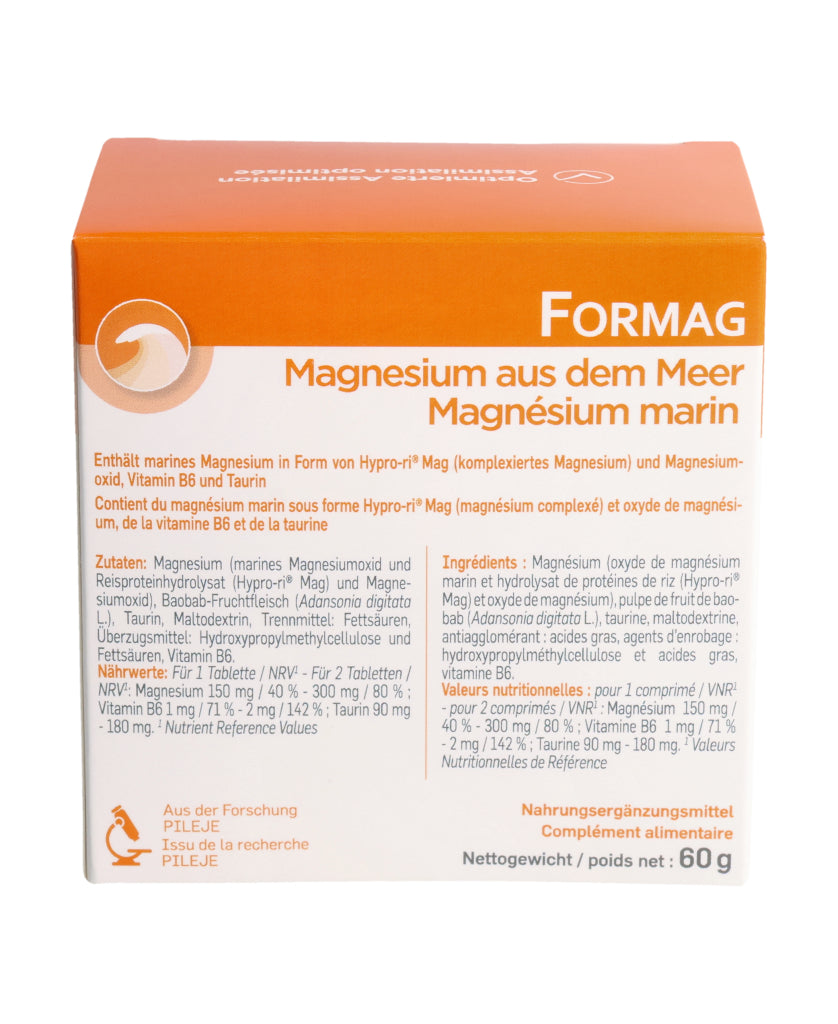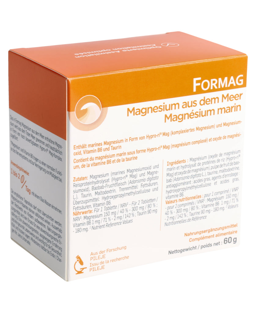 Magnesium (marines Magnesiumoxyd und Reisproteinhydrolysat (Hypro-ri ®Mag) Magnesiumoxyd) Baobab-Fruchtfleisch (Adansonia digitata L.), Taurin, Maltodextrine, Trennmittel: Fettsäuren, Überzugsmittel: Hydroxypropylméthylcellulose und Fettsäuren, Vitamin B6. Für 1 Tablette / 2 Tabletten Magnesium: 150 / 300 mg , 40 / 80%* Vitamin B6: 1 / 2 mg , 71 / 142%* Taurin: 90 / 180 mg NRV* Nutrient Reference Values".