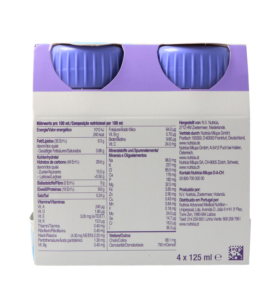 Lebensmittel für besondere medizinische Zwecke (bilanzierte Diät). Hochkalorisch (2,4 kcal/ml). Zur ausschliesslichen Ernährung geeignet.