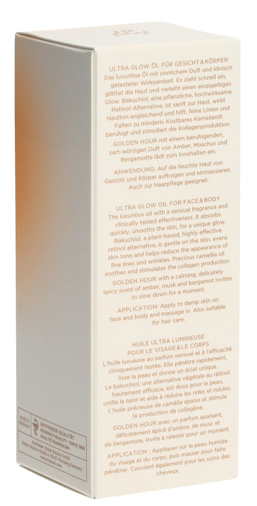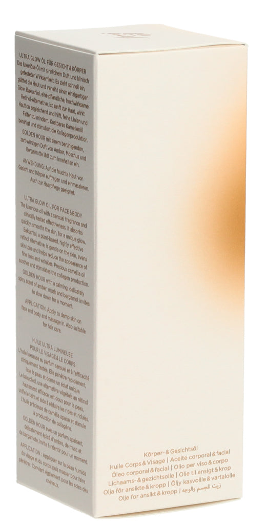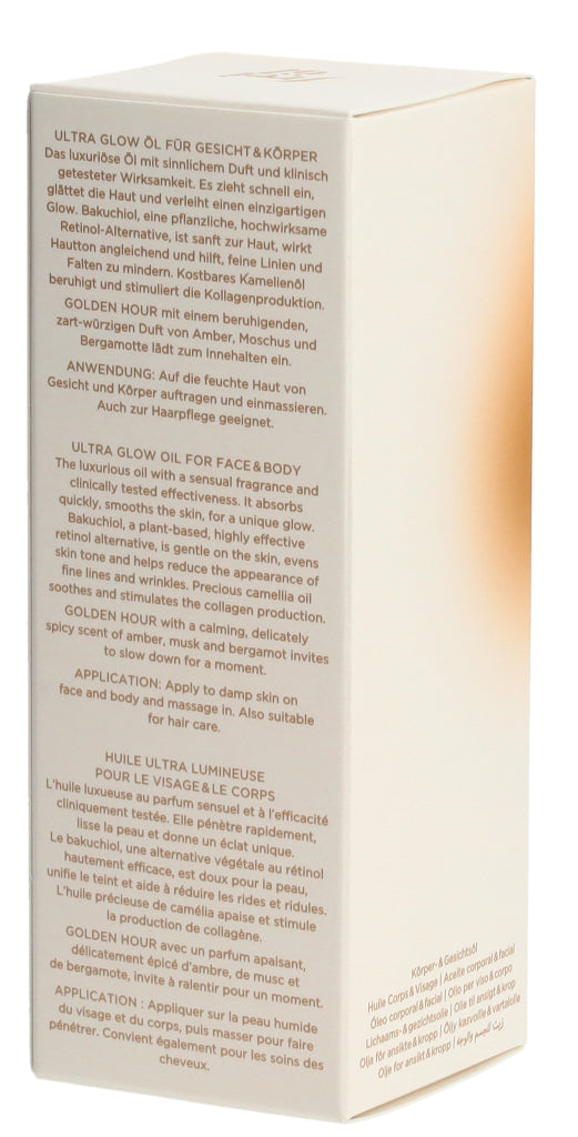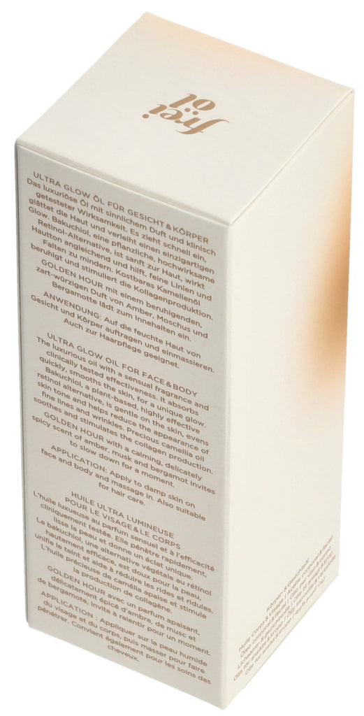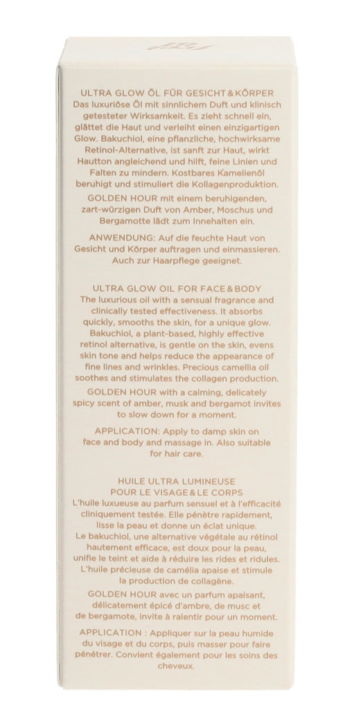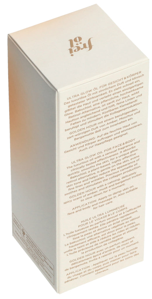 frei öl® Ultra Glow Öl ist ein luxuriöses Pflegeöl, das Gesicht, Körper und Haare verwöhnt. Mit seiner einzigartigen Duftkomposition und der Anti-Aging-Formel, die Bakuchiol und Kamelienöl enthält, sorgt es für einen strahlenden Teint und eine glattere Haut.