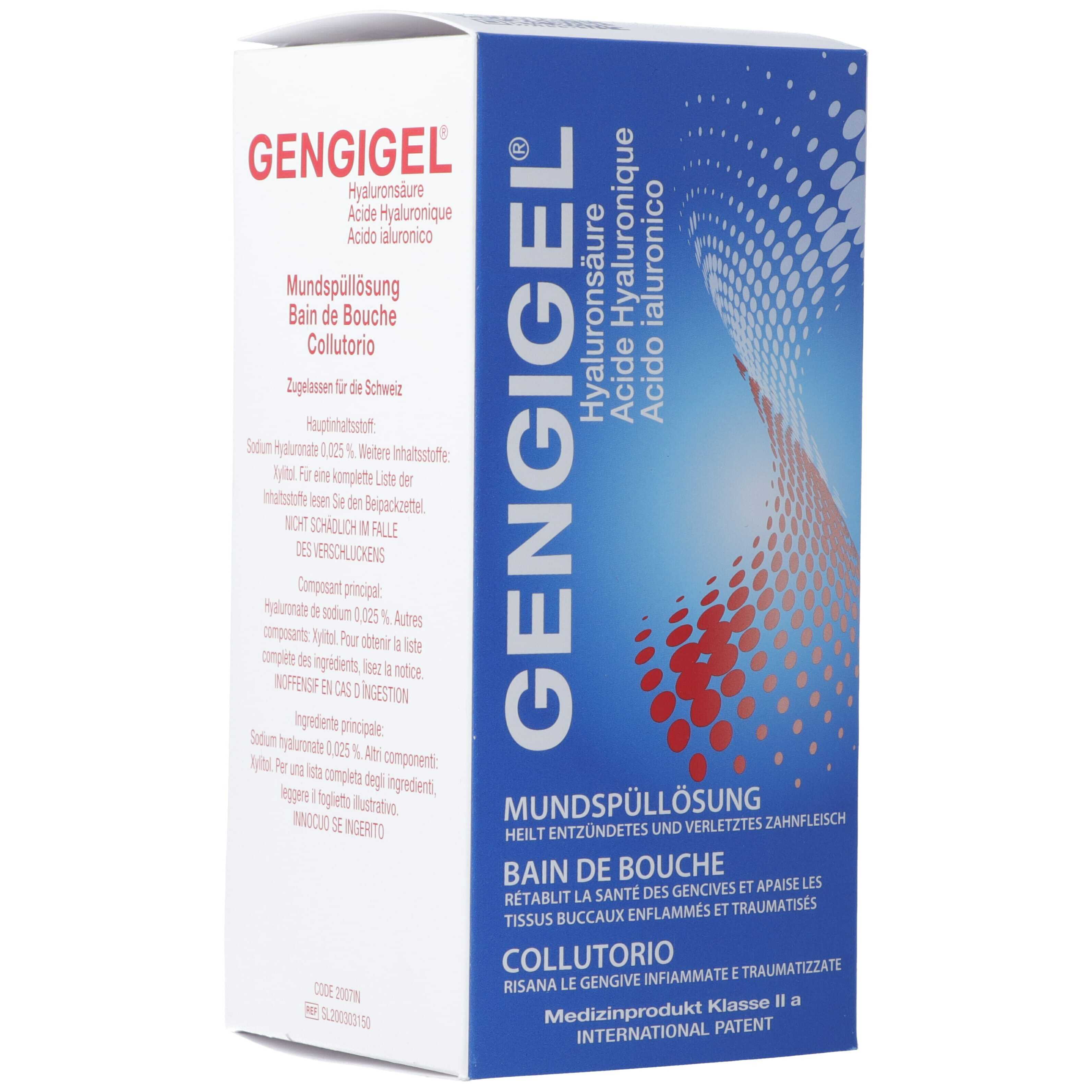 Gengigel® Hyaluronsäure Mundspülung für gesundes Zahnfleisch Die wirksame Kombination für gesundes Zahnfleisch • Schmerzlindernd und schnell heilend • Bei akuter Gingivitis und Parodontitis • Bei schmerzhaften Aphten, Mundgeschwüren und Lippenbläschen • Nach dem bleaching/Zahnaufhellen • Wiederherstellung von gesundem Zahnfleisch • Reduziert Blutungen • Haftet aufgrund der besonderen Formulierung des Produkts lange und gut auf der Schleimhaut • Kann täglich zur Vorbeugung im Rahmen der Mundhygiene angewendet werden • Ohne Verfärbungen Mundspülung: Mit 10 ml (im Dosierbecher abmessen) für 1 - 2 Minuten ausspülen, 2 - 4 mal am Tag wiederholen. Kann ohne jegliche Einschränkung von allen Patienten, auch von Kindern, Schwangeren, älteren Menschen und Diabetikern angewendet werden.