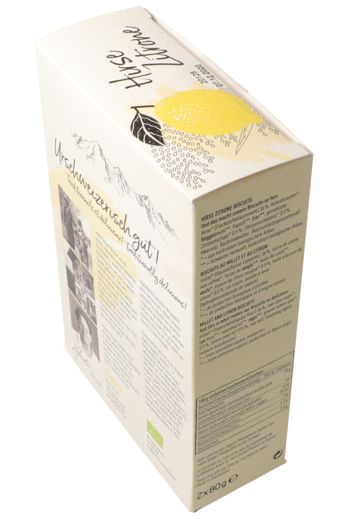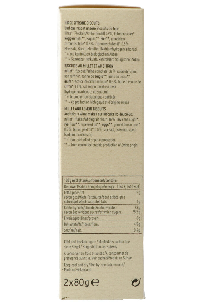 Hirse* (36%) (Hirseflocken*, Hirsevollkornmehl*), Rohrohrzucker*, ROGGENmehl*, Rapsöl*, Eier*, Zitronenschale* (0,5%), Zitronenschalenöl* (0,5%), Meersalz, Natriumhydrogencarbonat, *aus biologischer Landwirtschaft..