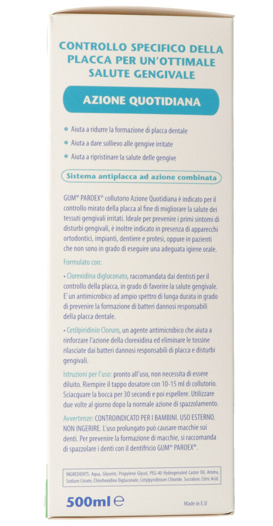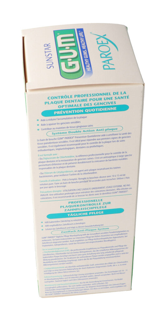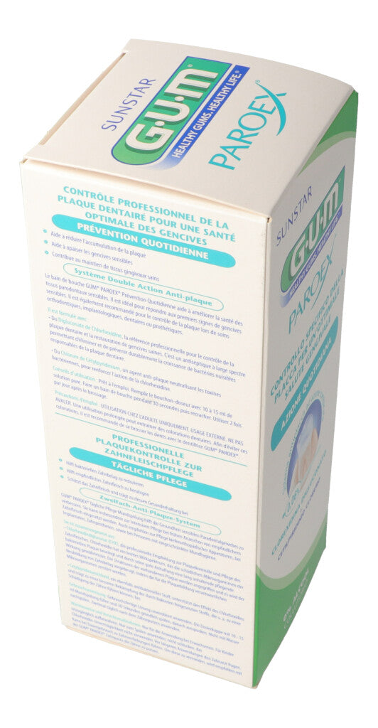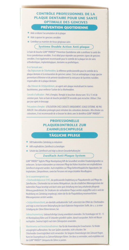 Nur für die Anwendung bei Erwachsenen. Nur zur äusseren Anwendung. Nicht verschlucken. Bei Chlorhexidin- Unverträglichkeit nicht verwenden. Vor längeren Anwendungen den Zahnarzt fragen. Kann bei Dauergebrauch zu Zahnverfärbungen führen. Um diese zu vermeiden, wird empfohlen mit der GUM PAROEX Zahnpasta die Zähne zu putzen.