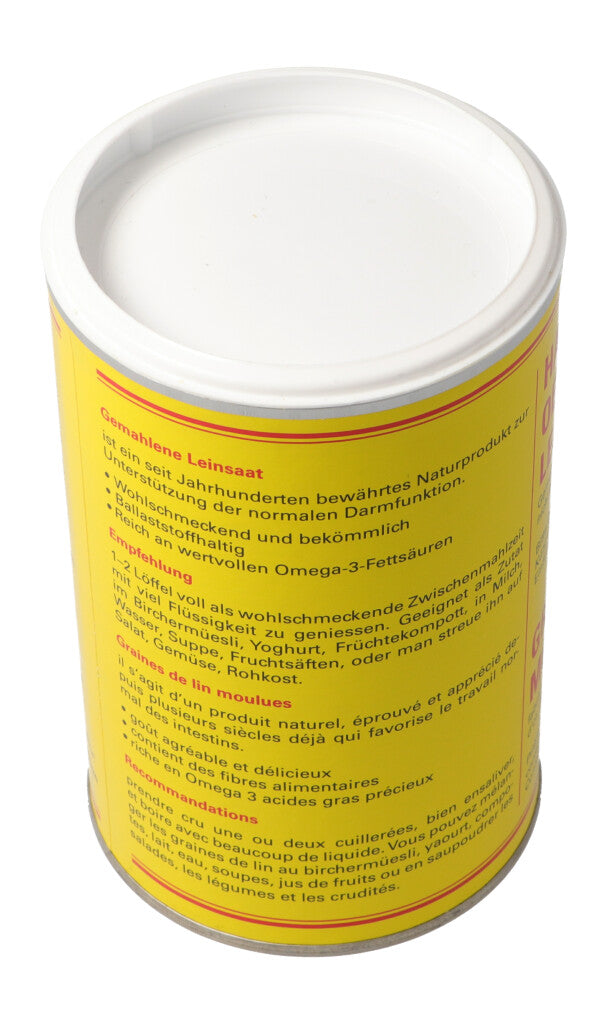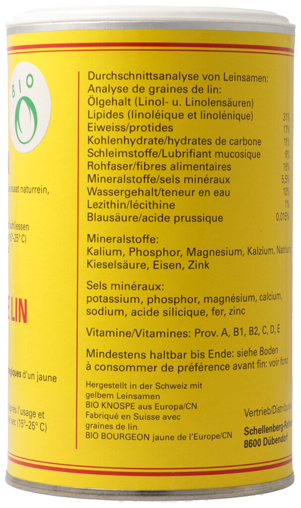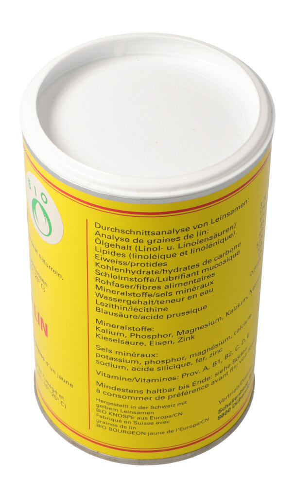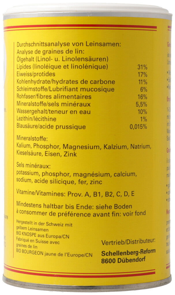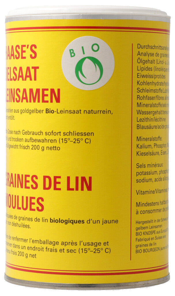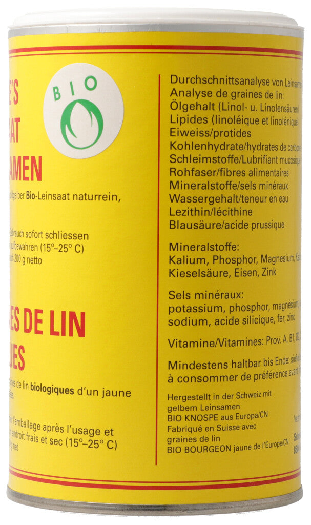 Gemahlen aus goldgelber Bio-Leinsaat naturrein, nicht entölt. Hergestellt in der Schweiz mit gelben Leinsamen Bio Knospe aus Europa/CN.