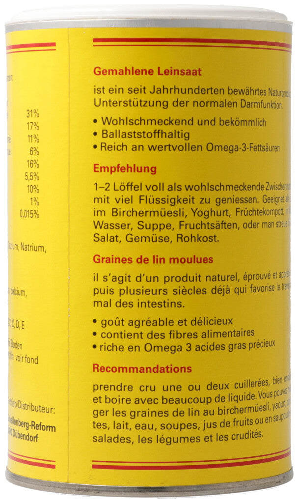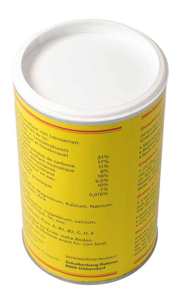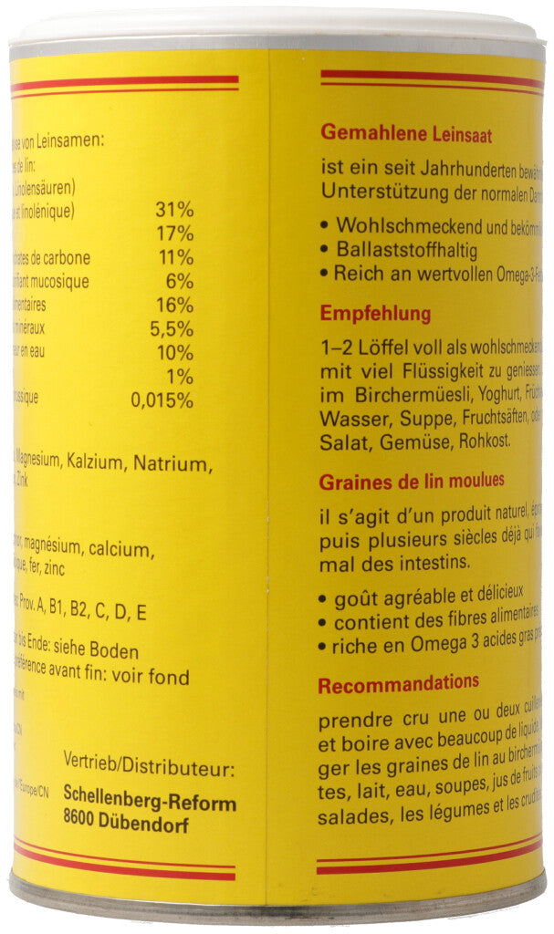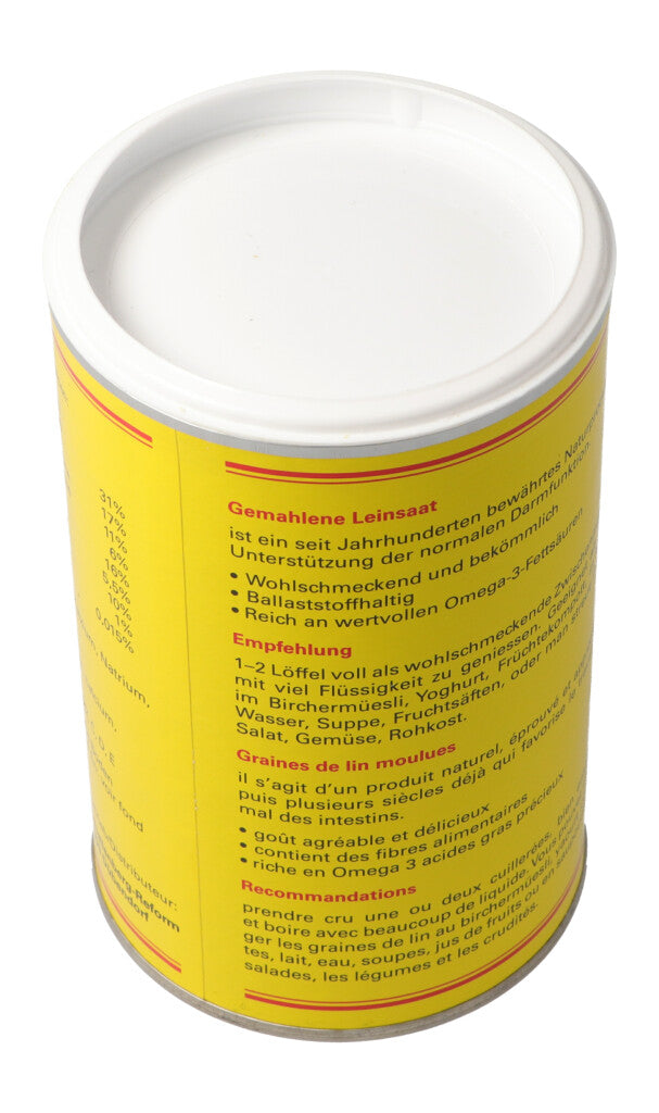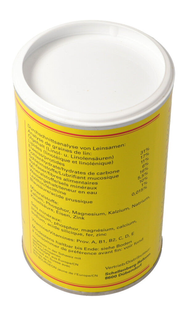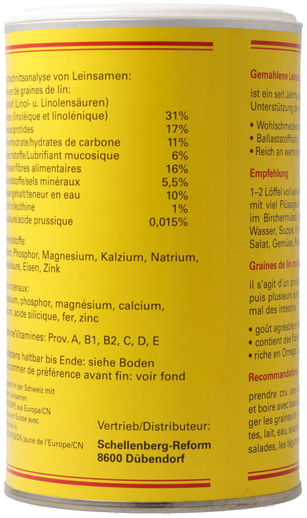 Gemahlen aus goldgelber Bio-Leinsaat naturrein, nicht entölt. Hergestellt in der Schweiz mit gelben Leinsamen Bio Knospe aus Europa/CN.