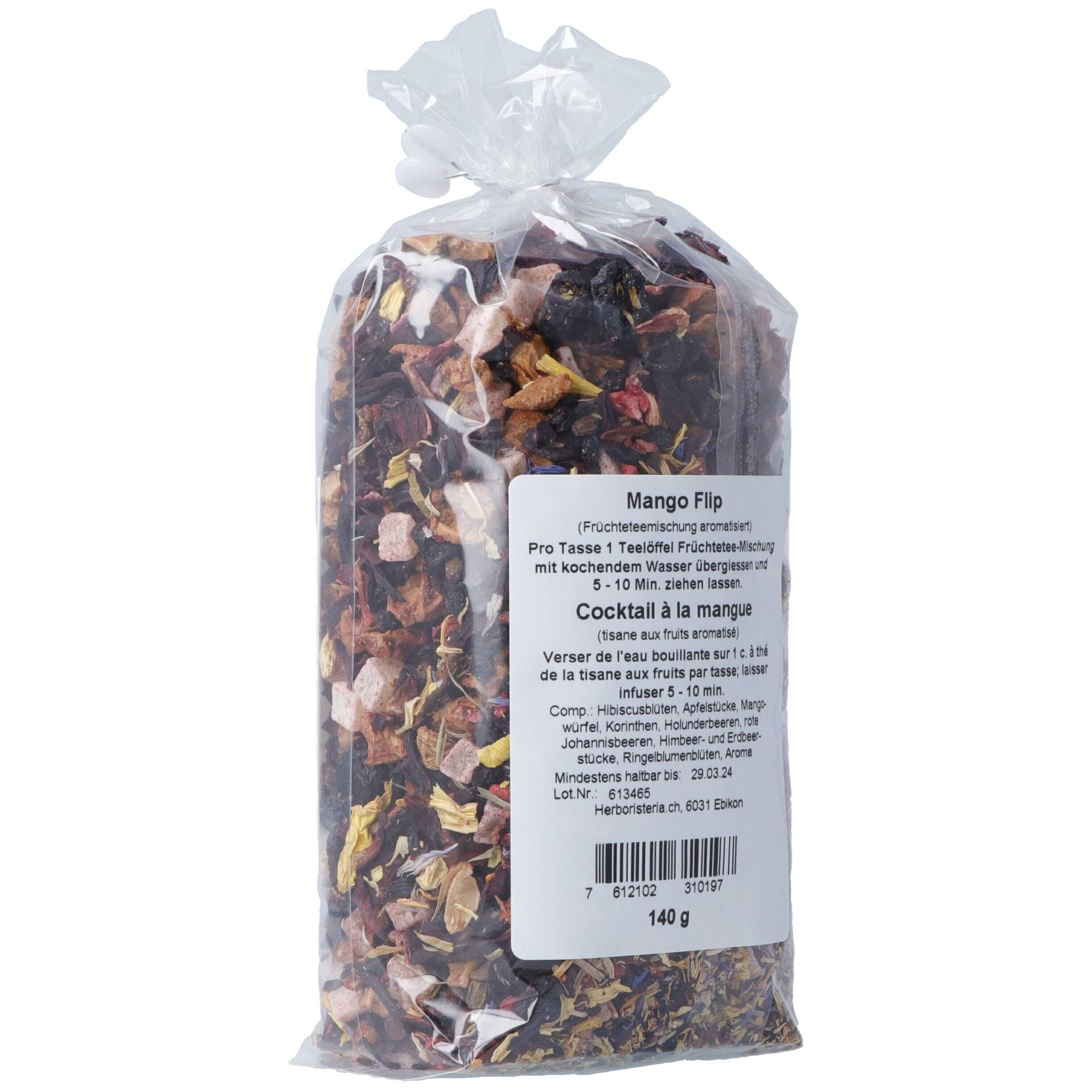 Hibiscusblüten, Apfelstücke, Mangowürfel, Korinthen, Holunderbeeren, rote Johannisbeeren, Himbeer- und Erdbeerstücke, Ringelblumenblüten, Aroma..