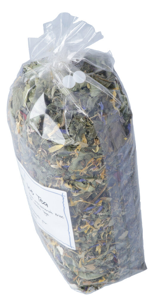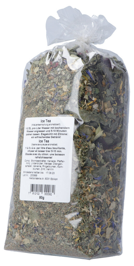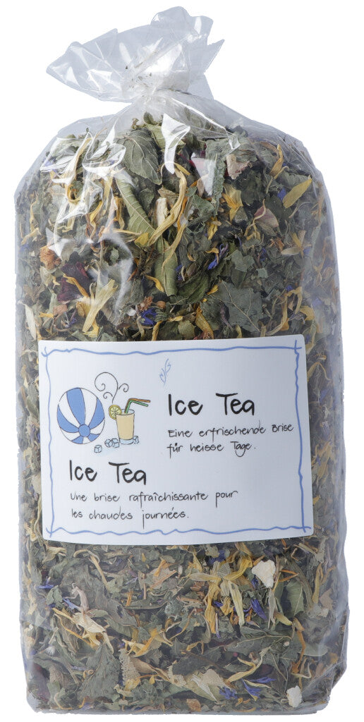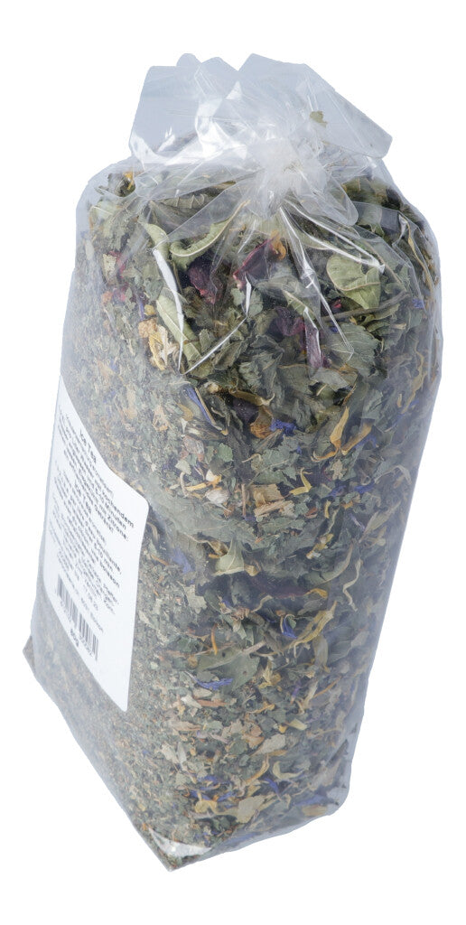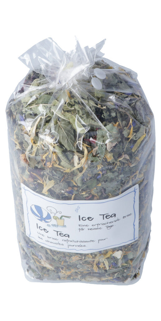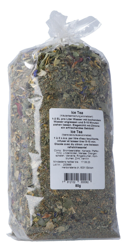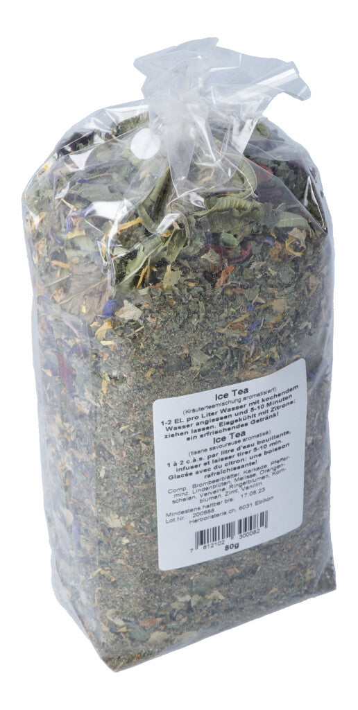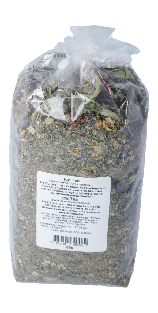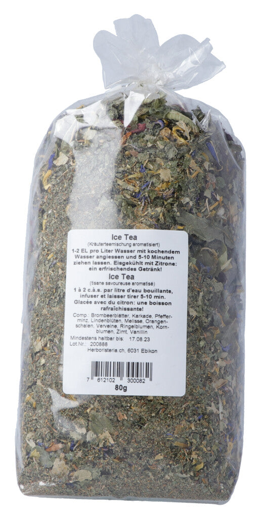 Brombeerblätter, Karkade, Pfefferminz, Lindenblüten, Melisse, Orangenschalen, Verveine, Ringelblumen, Kornblumen, Zimt, Vanillin..