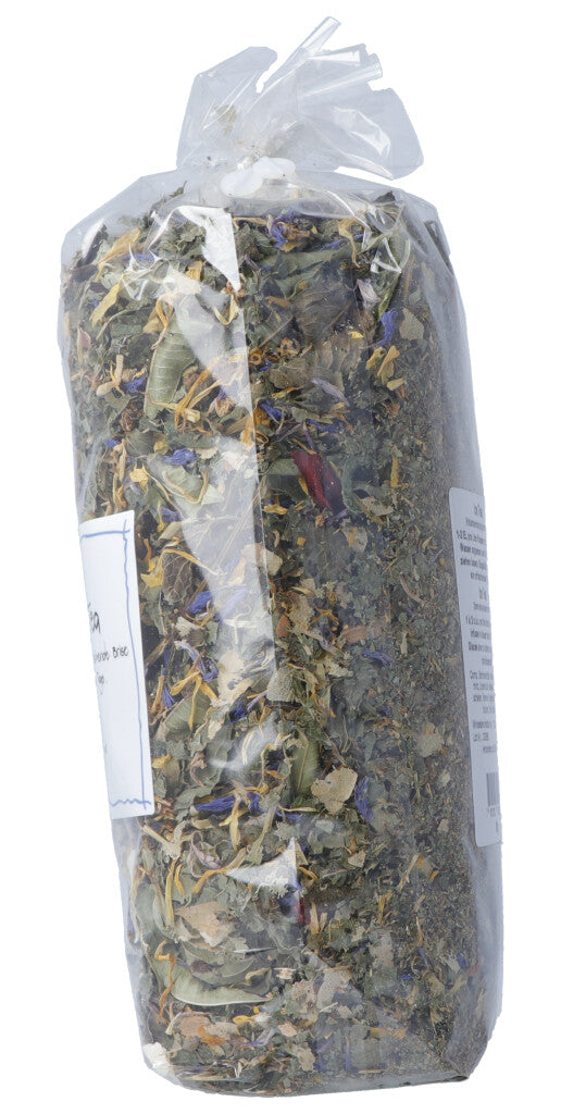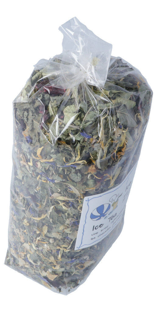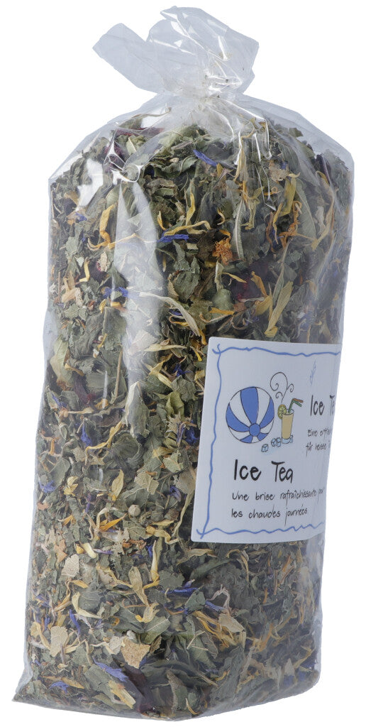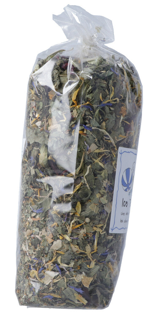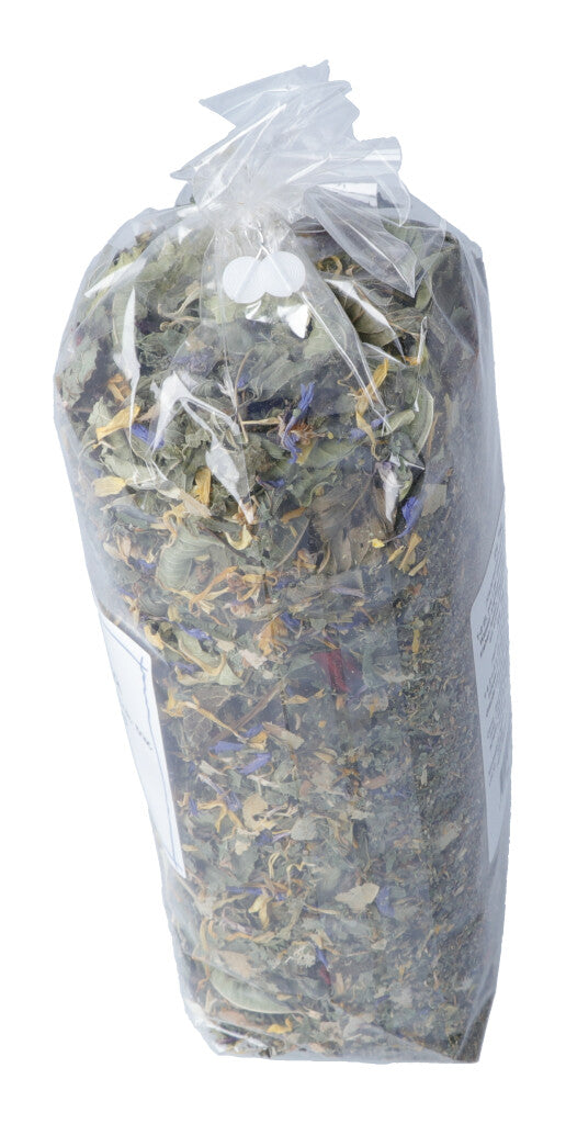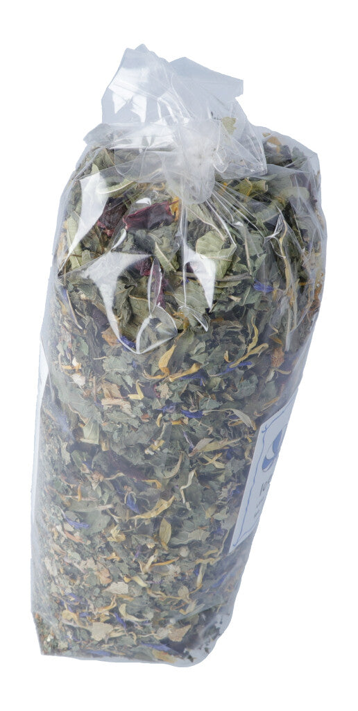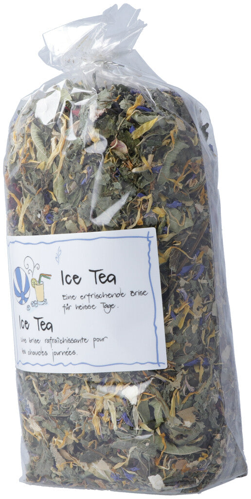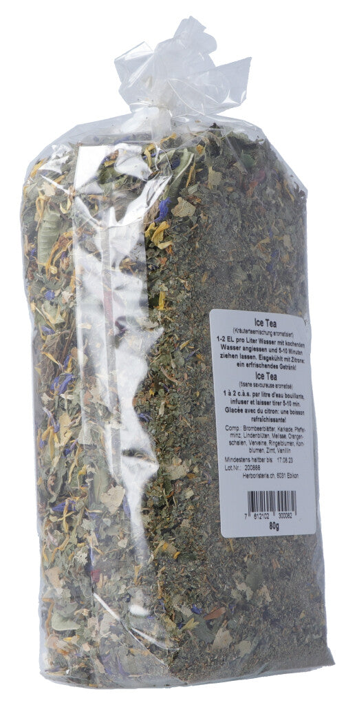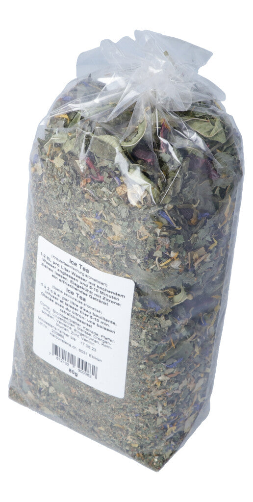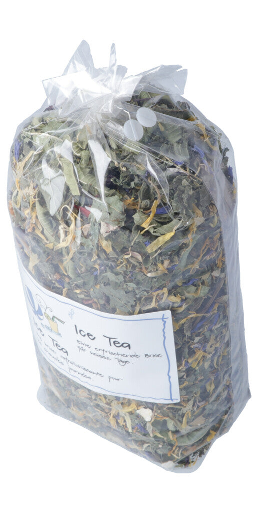 Brombeerblätter, Karkade, Pfefferminz, Lindenblüten, Melisse, Orangenschalen, Verveine, Ringelblumen, Kornblumen, Zimt, Vanillin..