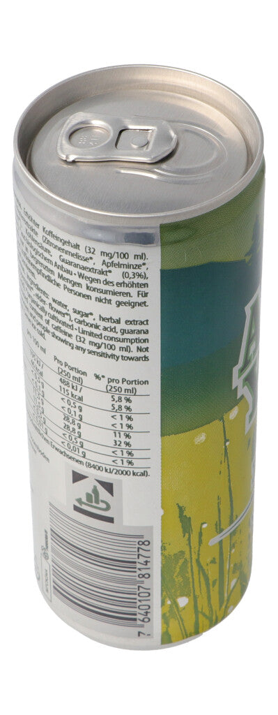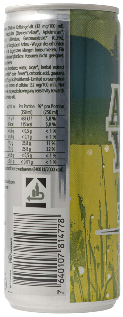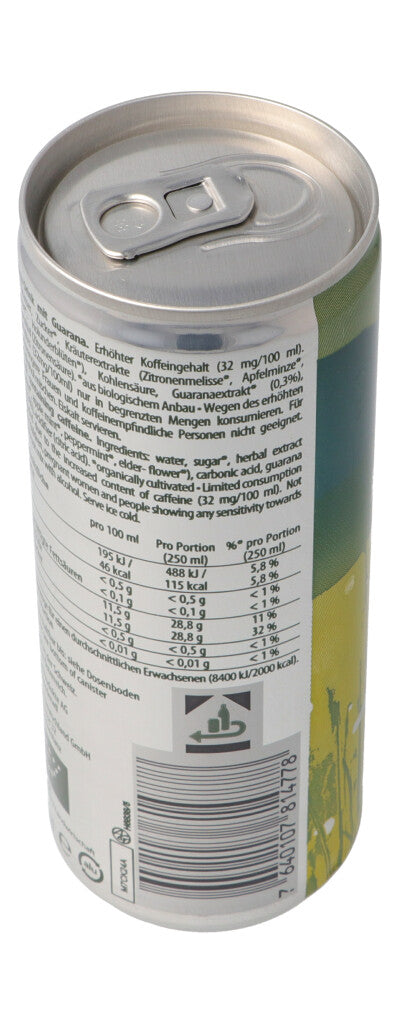 Wasser, Zucker*, Kräuterextrakte (Zitronenmelisse*, Apfelminze*, Pfefferminze*, Holunderblüten*), Kohlensäure, Guaranaextrakt* (0.3%), Säuerungsmittel (Ztronensäure).*aus biologischem Anbau.