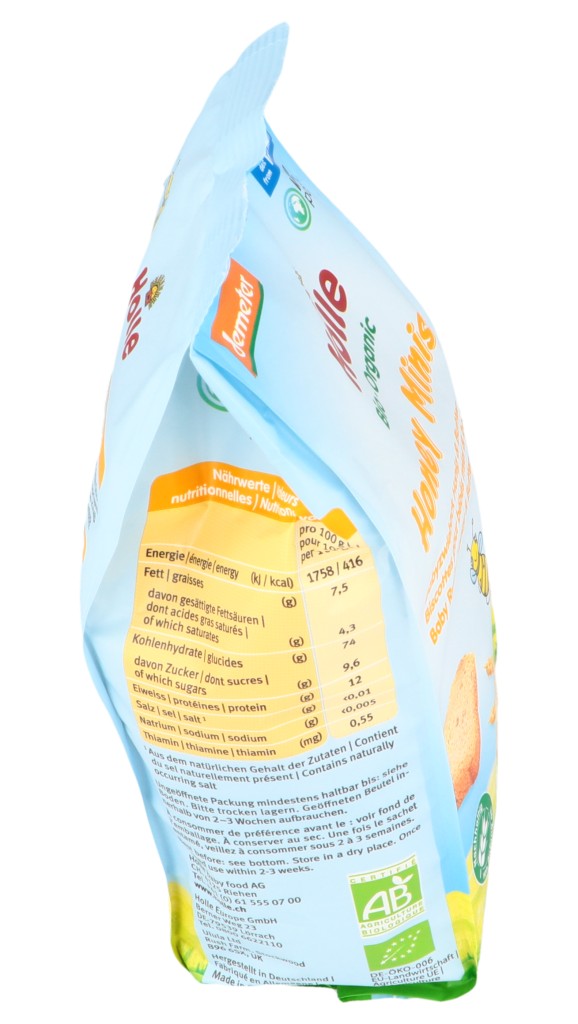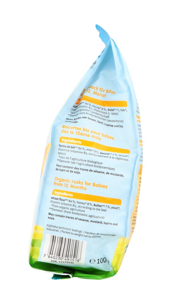 WEIZENMEHL** 84 %, Honig* 8 %, BUTTER** 7 %, Hefe*, Thiamin (Vitamin B1, vitaminiert lt. Gesetz) *aus biologischer Landwirtschaft **Demeter (aus biodynamischer Landwirtschaft) Kann Spuren von SEAM, SENF, LUPINE und SOJA enthalten. DE.