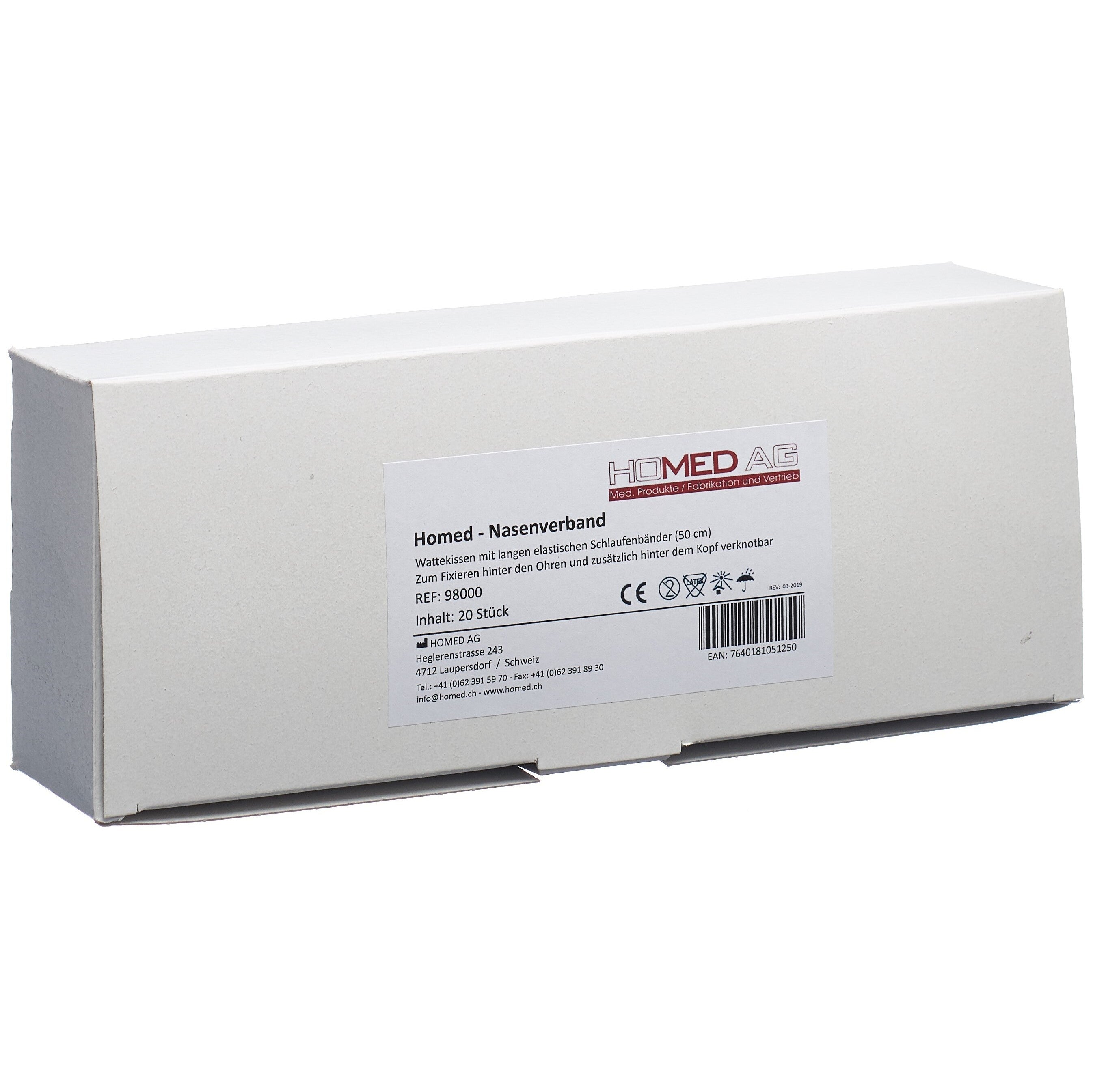 Der Nasenverband wird benötigt nach einer Nasenoperation. Er nimmt Wundsekret und Blut auf. Bei Erkältungskrankheiten kann der Wattestopfen mit ätherischen Ölen beträufelt werden. Der Verband ist mit einem Wundkissen und langen elastischen Schlaufenbänder ausgestattet, damit der Verband hinter den Ohren fixiert werden kann.