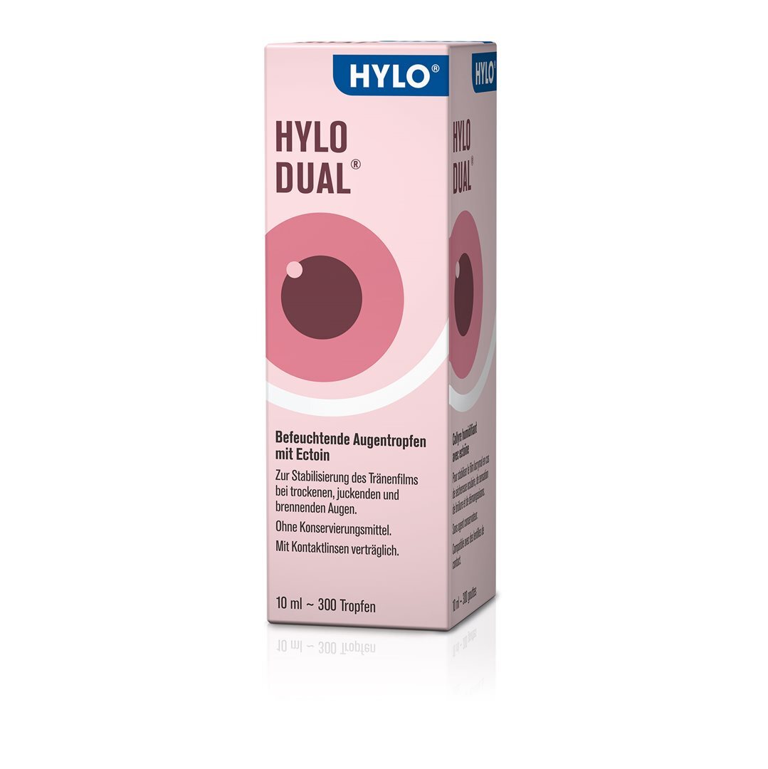Die Hylo-Dual Augentropfen einigen sich bei leicht bis mittelschwer trockenen Augen mit instabilem Tränenfilm. Dazu entzündliche und allergische Symptome. Die Tropfen mit Hyaluronsäure (0.05%) und Ectoin stabilisieren den Tränenfilm und lindern entzündliche sowie allergische Symptome.
