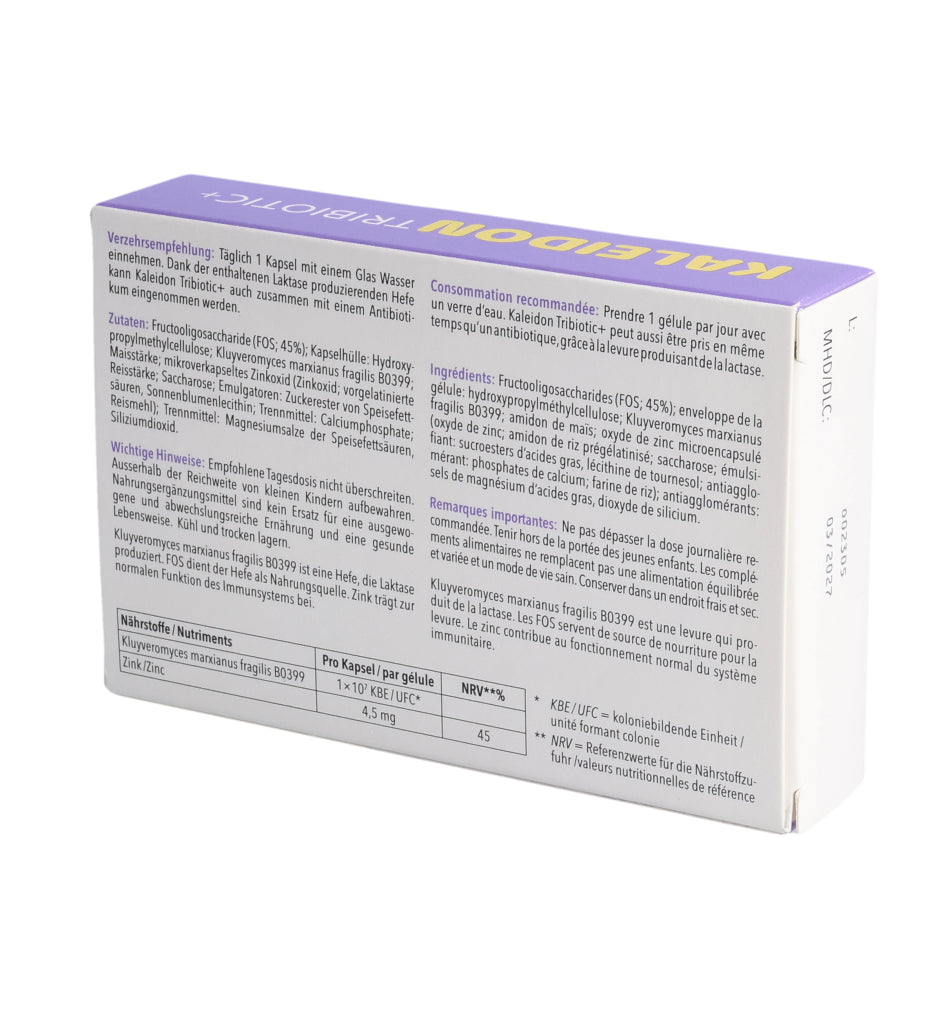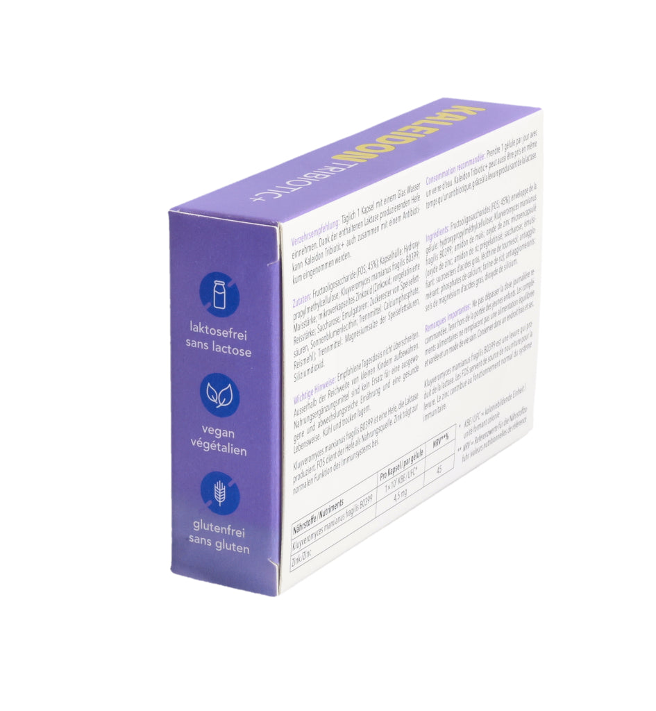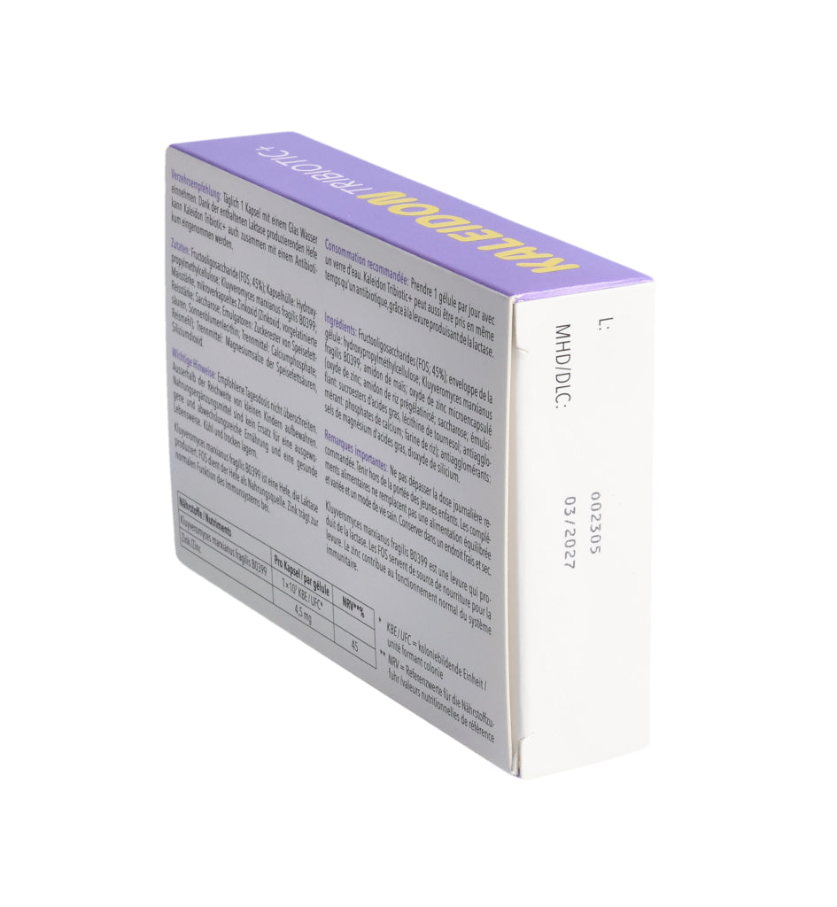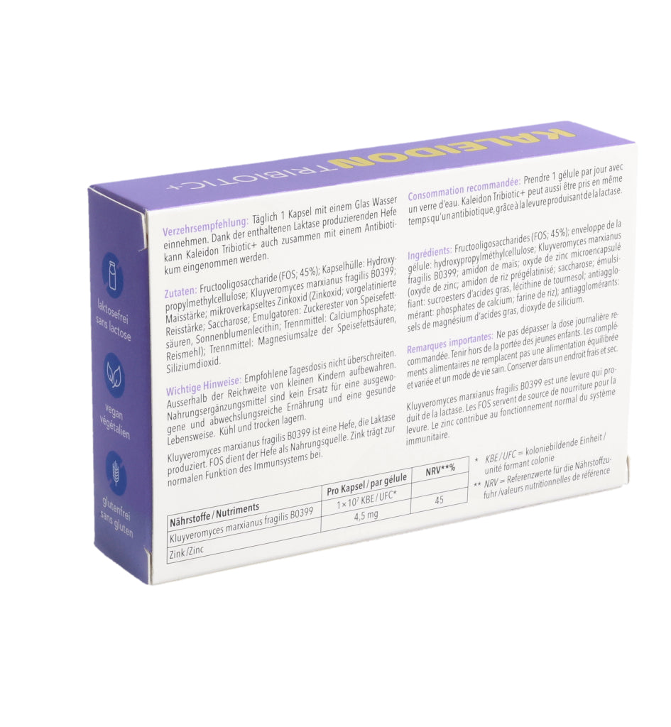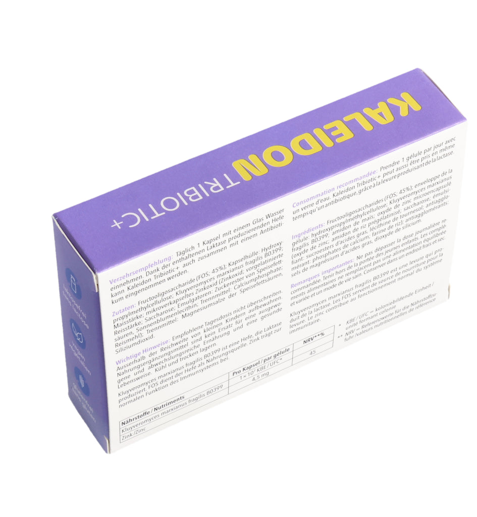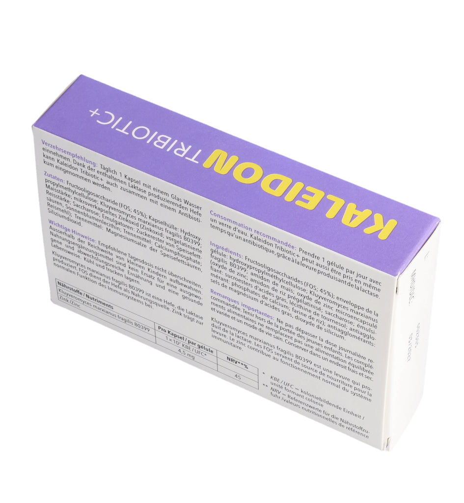 KALEIDON TRIBIOTIC+ enthält die Laktase produzierende Hefe Kluyveromyces marxianus fragilis B0399, die bei der Laktose-Verdauung hilft. Darüber hinaus erhöht diese einzigartige Hefe die Menge an guten Darmbakterien (Bifidobakterien).