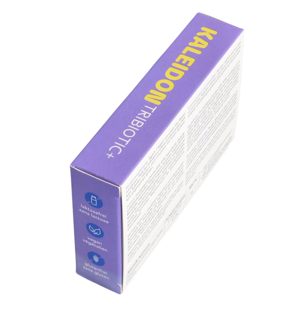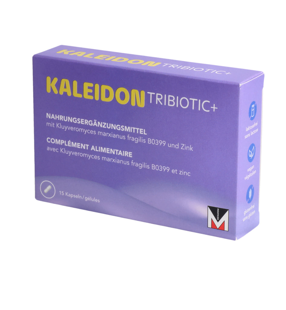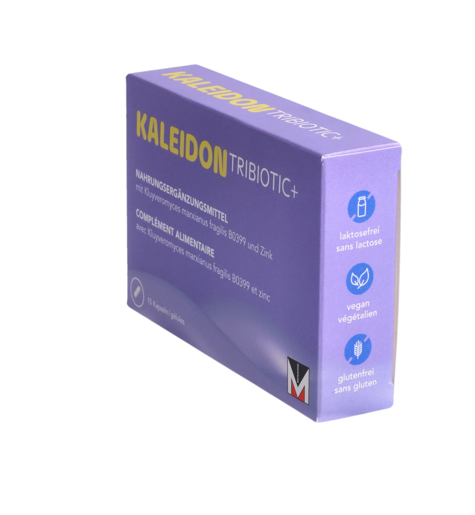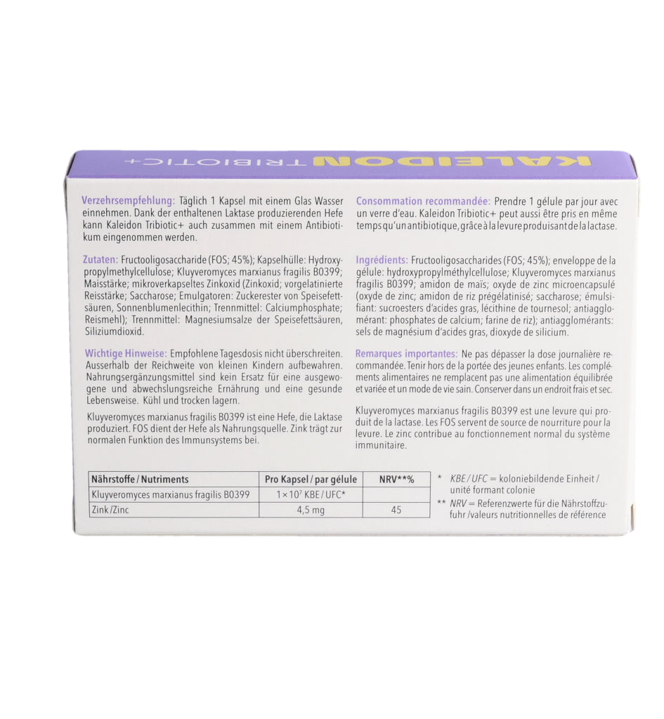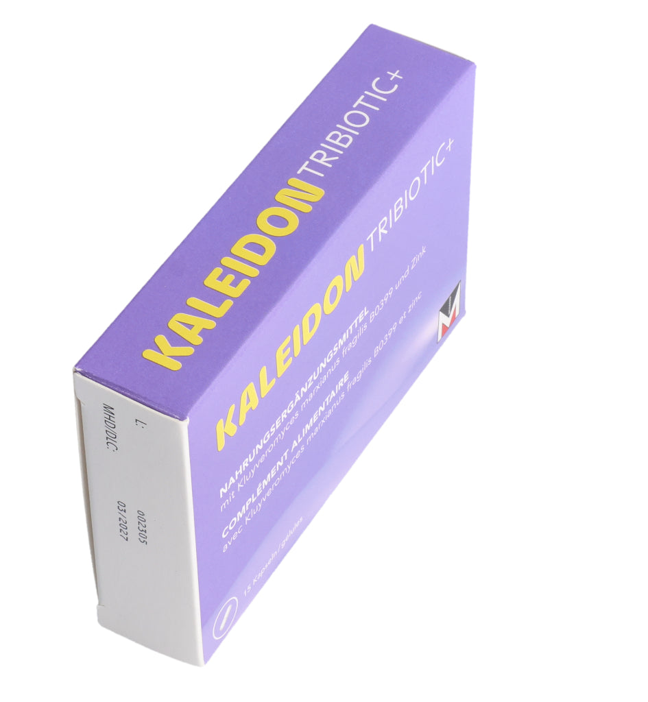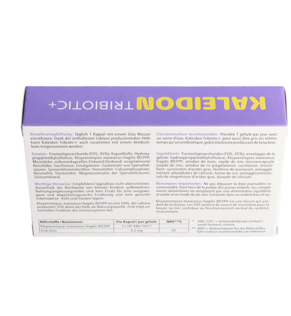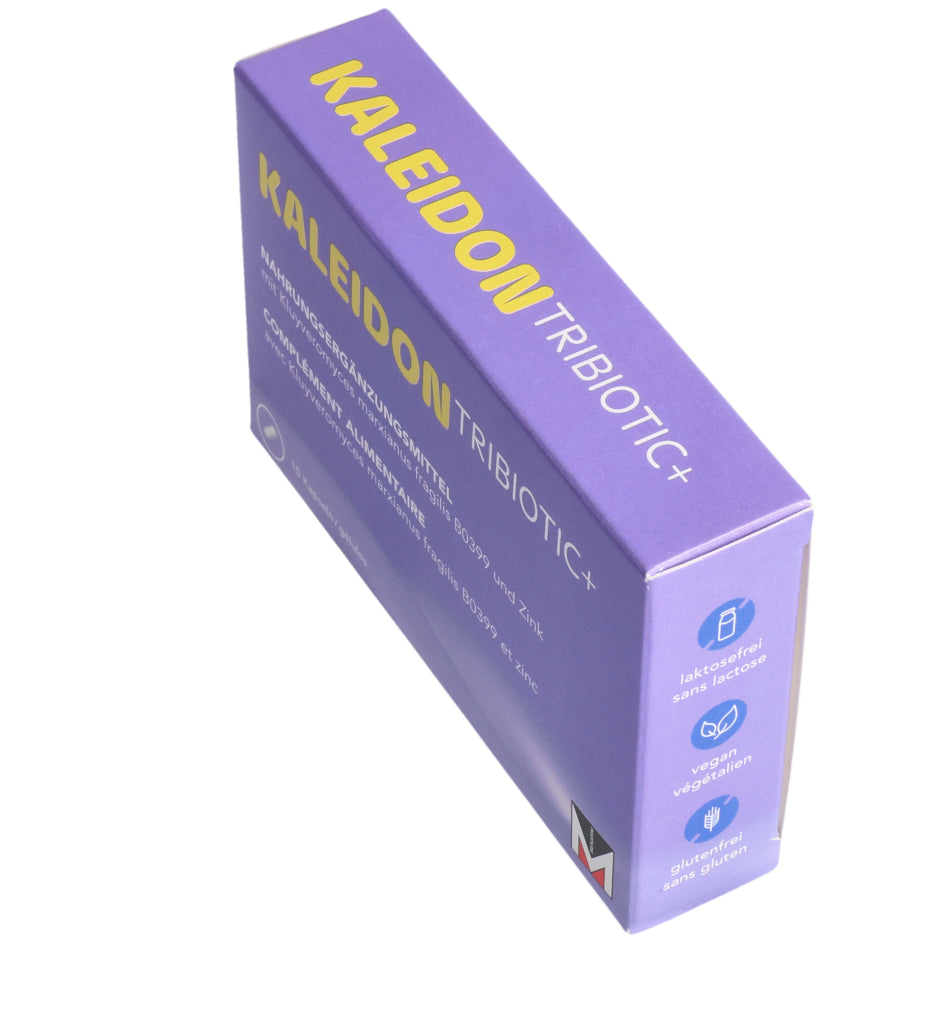 KALEIDON TRIBIOTIC+ enthält die Laktase produzierende Hefe Kluyveromyces marxianus fragilis B0399, die bei der Laktose-Verdauung hilft. Darüber hinaus erhöht diese einzigartige Hefe die Menge an guten Darmbakterien (Bifidobakterien).