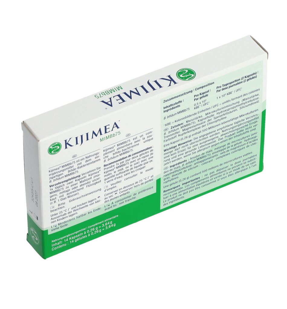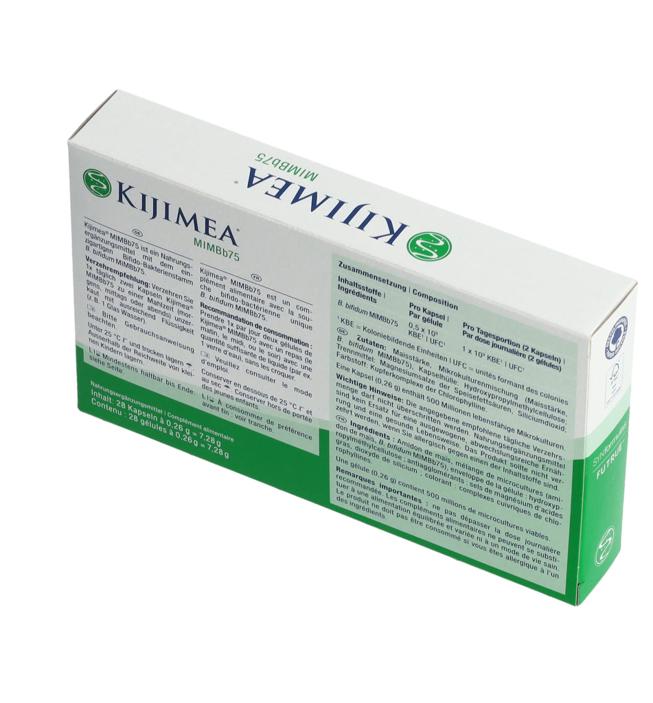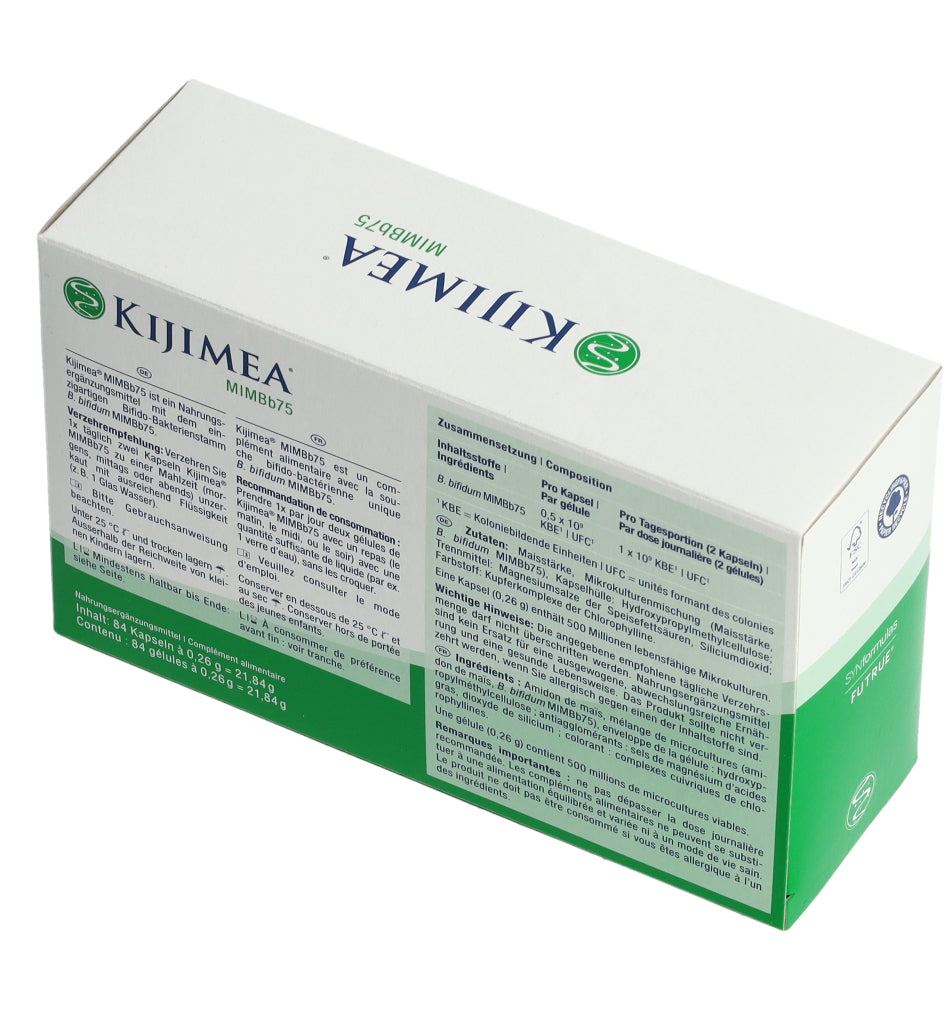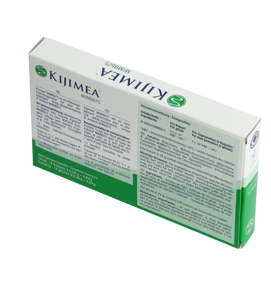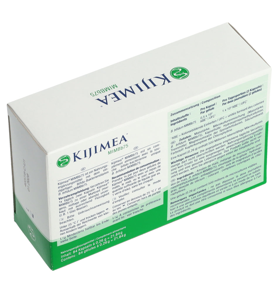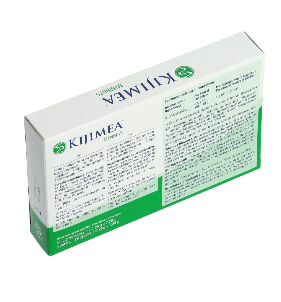 Verzehren Sie 1x täglich zwei Kapseln Kijimea® MIMBb75 zu einer Mahlzeit (morgens, mittags oder abends) unzerkaut mit ausreichend Flüssigkeit (z.B. 1 Glas Wasser).