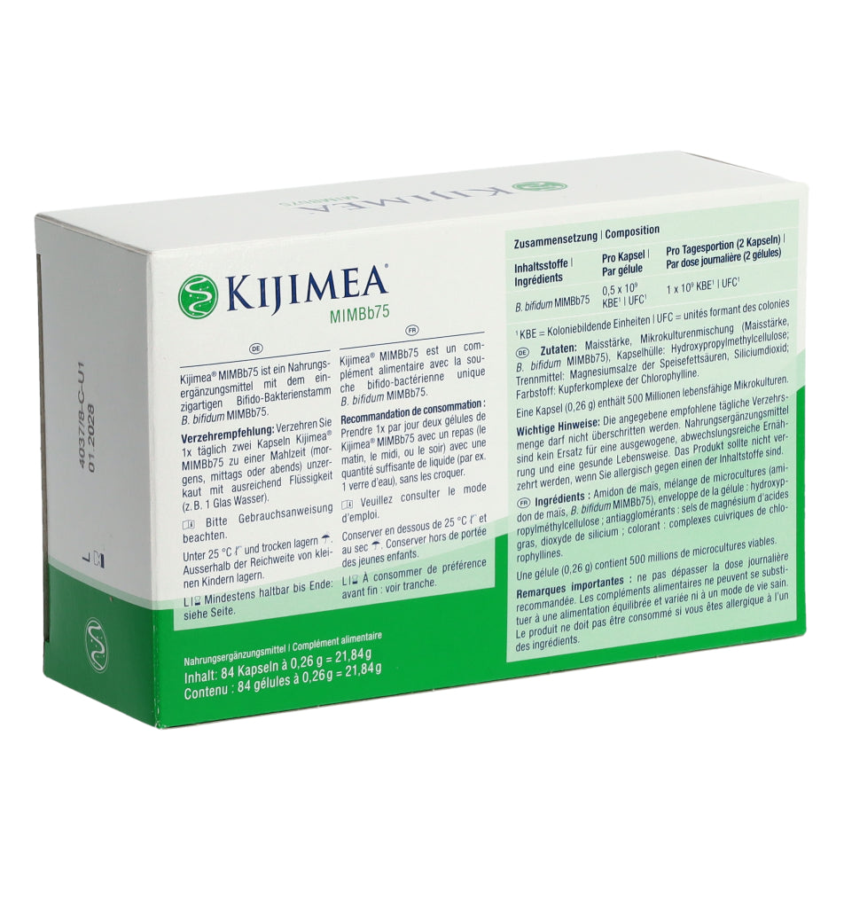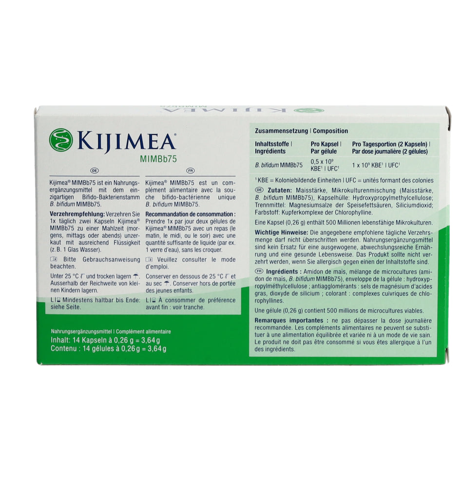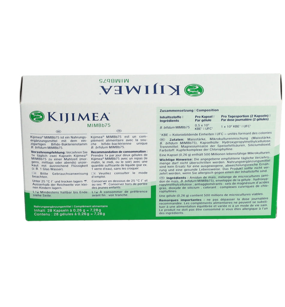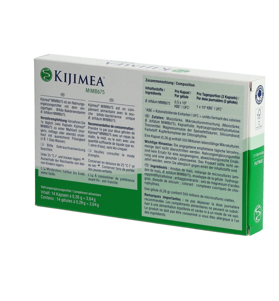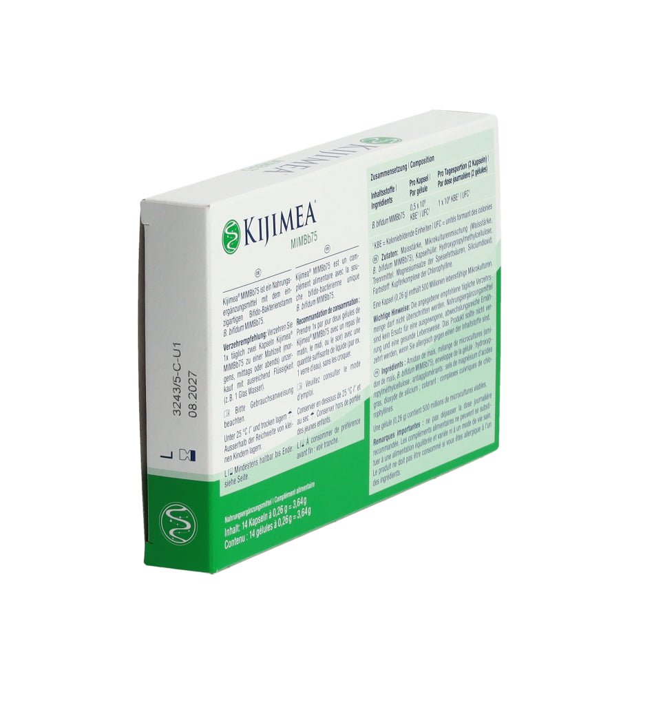 Verzehren Sie 1x täglich zwei Kapseln Kijimea® MIMBb75 zu einer Mahlzeit (morgens, mittags oder abends) unzerkaut mit ausreichend Flüssigkeit (z.B. 1 Glas Wasser).