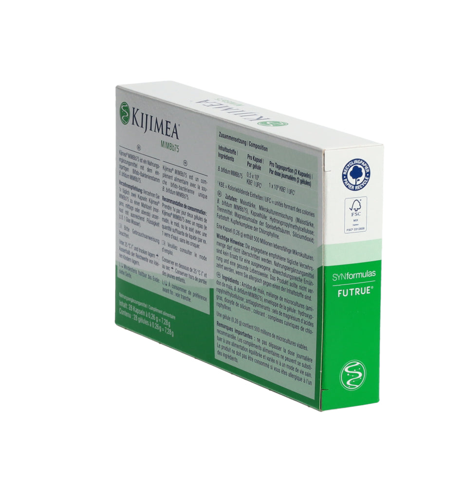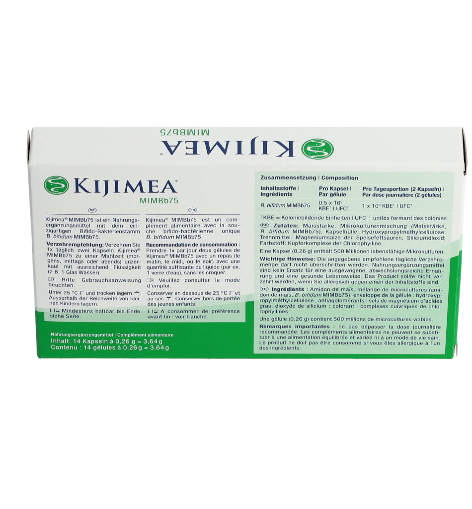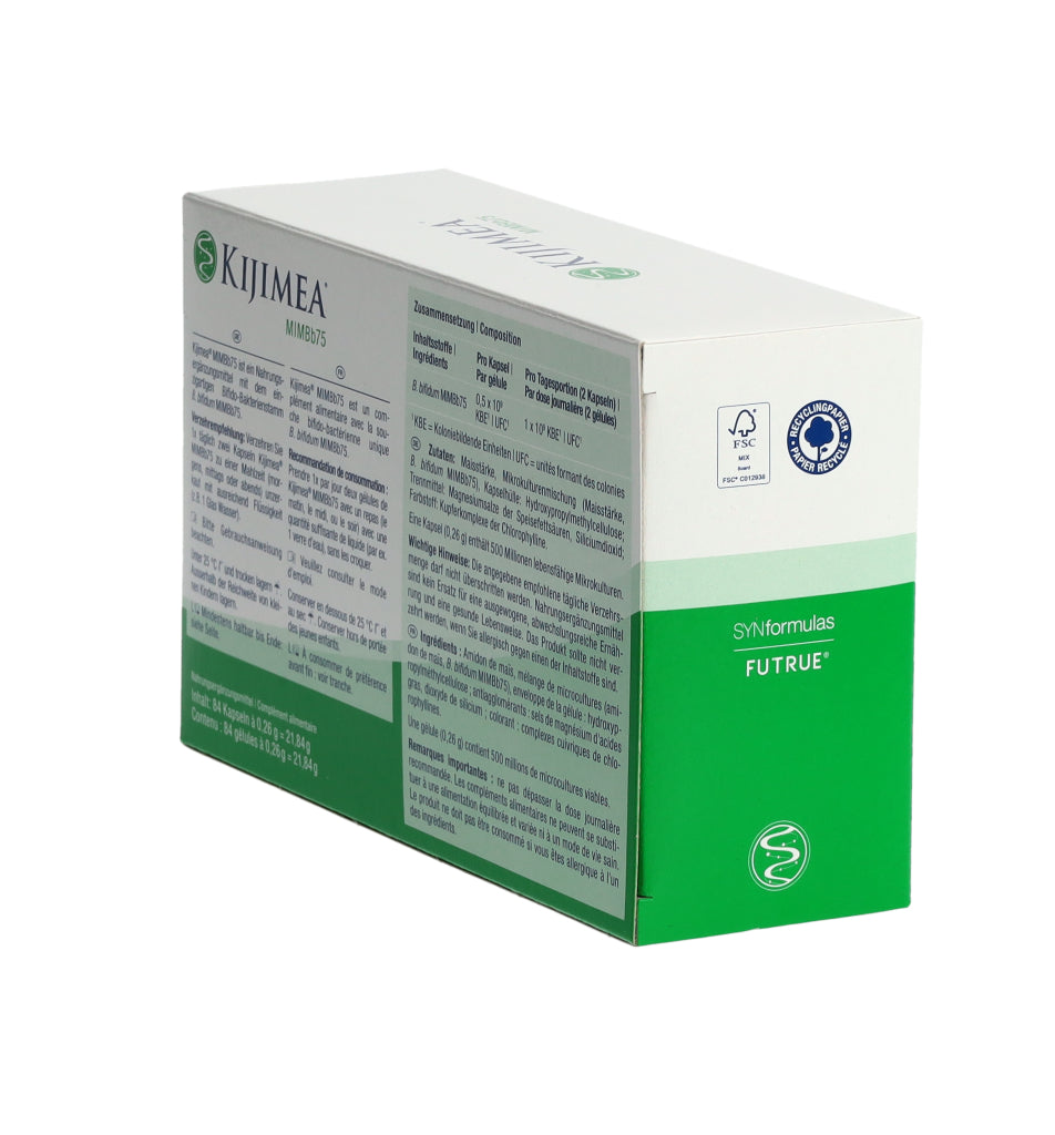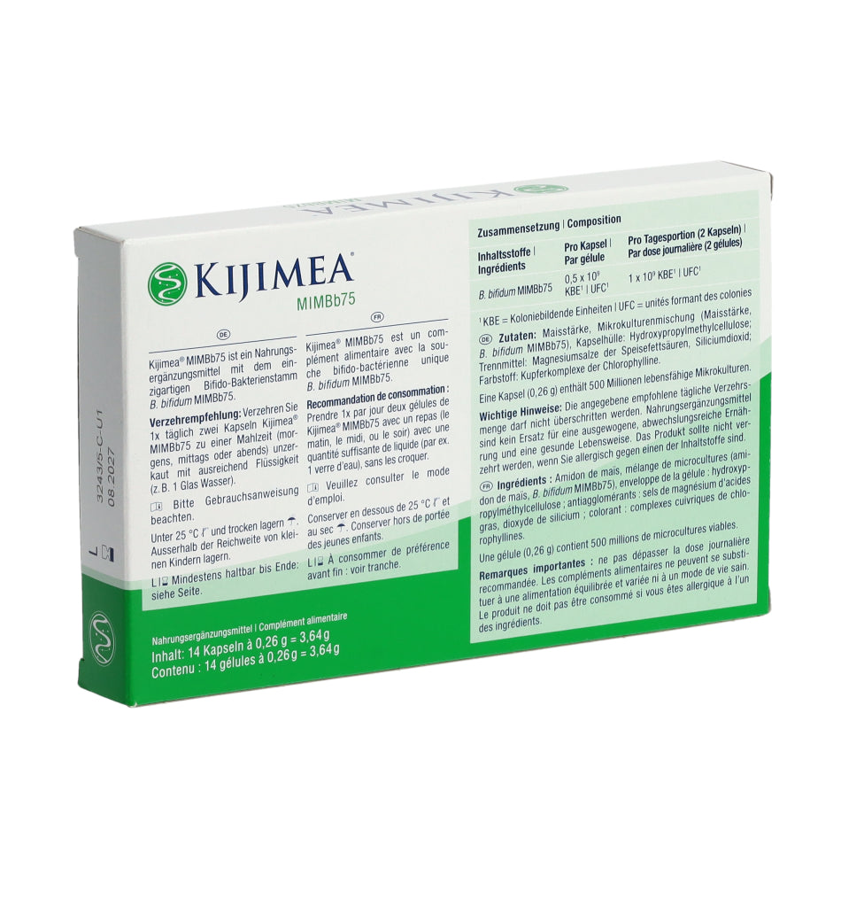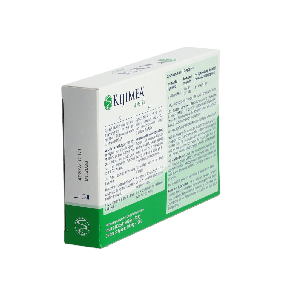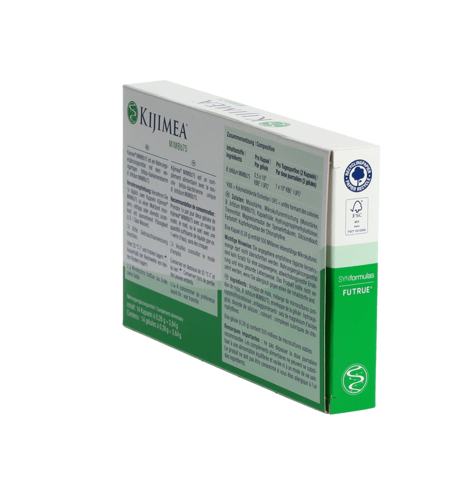 Verzehren Sie 1x täglich zwei Kapseln Kijimea® MIMBb75 zu einer Mahlzeit (morgens, mittags oder abends) unzerkaut mit ausreichend Flüssigkeit (z.B. 1 Glas Wasser).