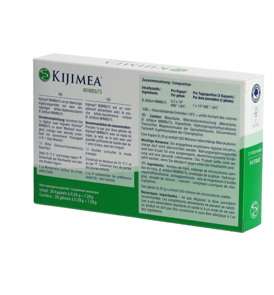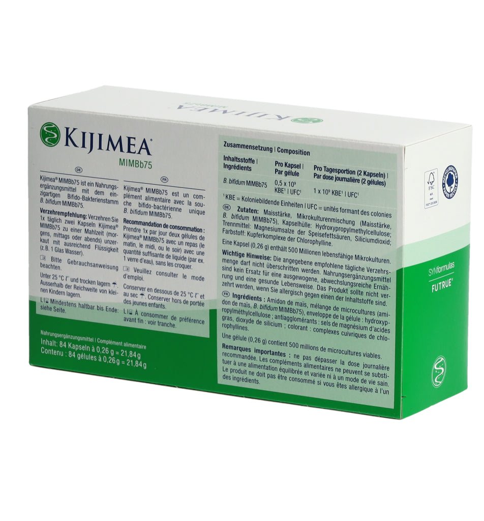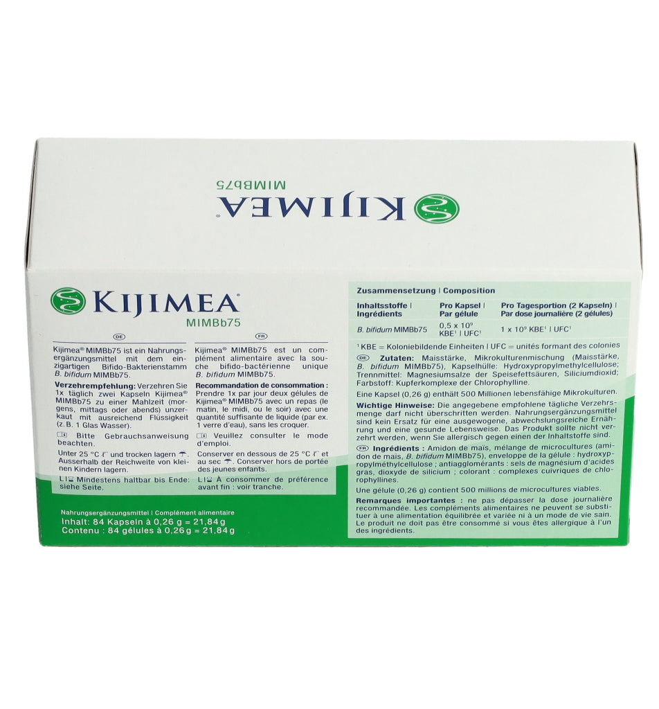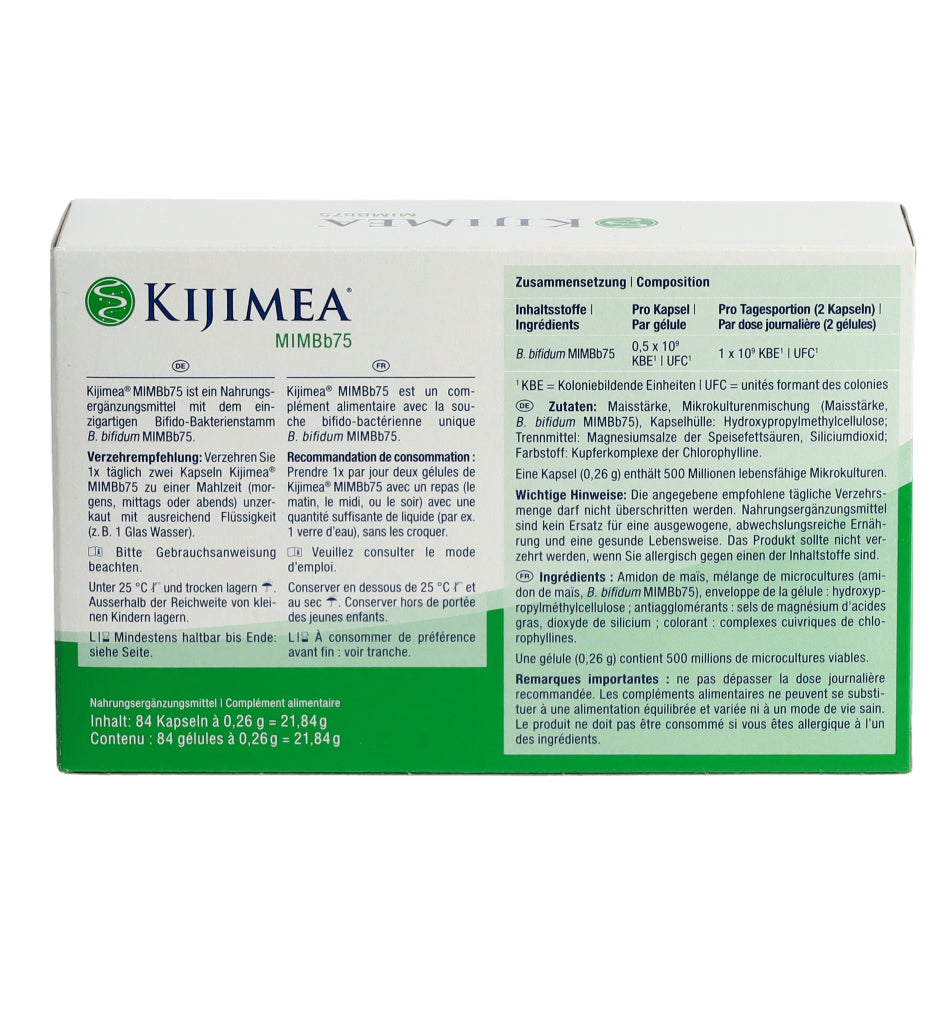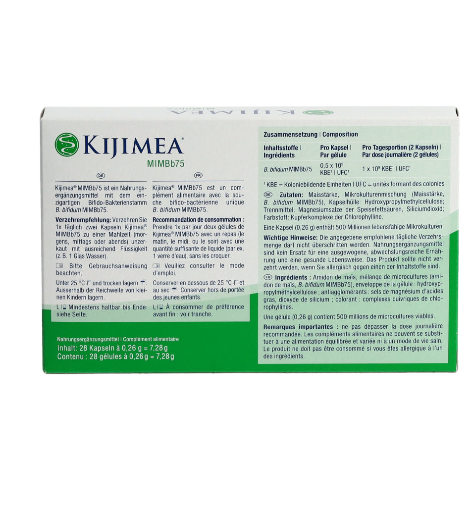 Maisstärke, Mikrokulturenmischung (Maisstärke, B. bifidum MIMBb75), Kapselhülle: Hydroxypropylmethylcellulose; Trennmittel: Magnesiumsalze der Speisefettsäuren, Siliciumdioxid; Farbstoff: Kupferkomplexe der Chlorophylline. Eine Kapsel enthält: B. bifidum MIMBb75: 0,5x109 KBE (KBE = Koloniebildende Einheiten).