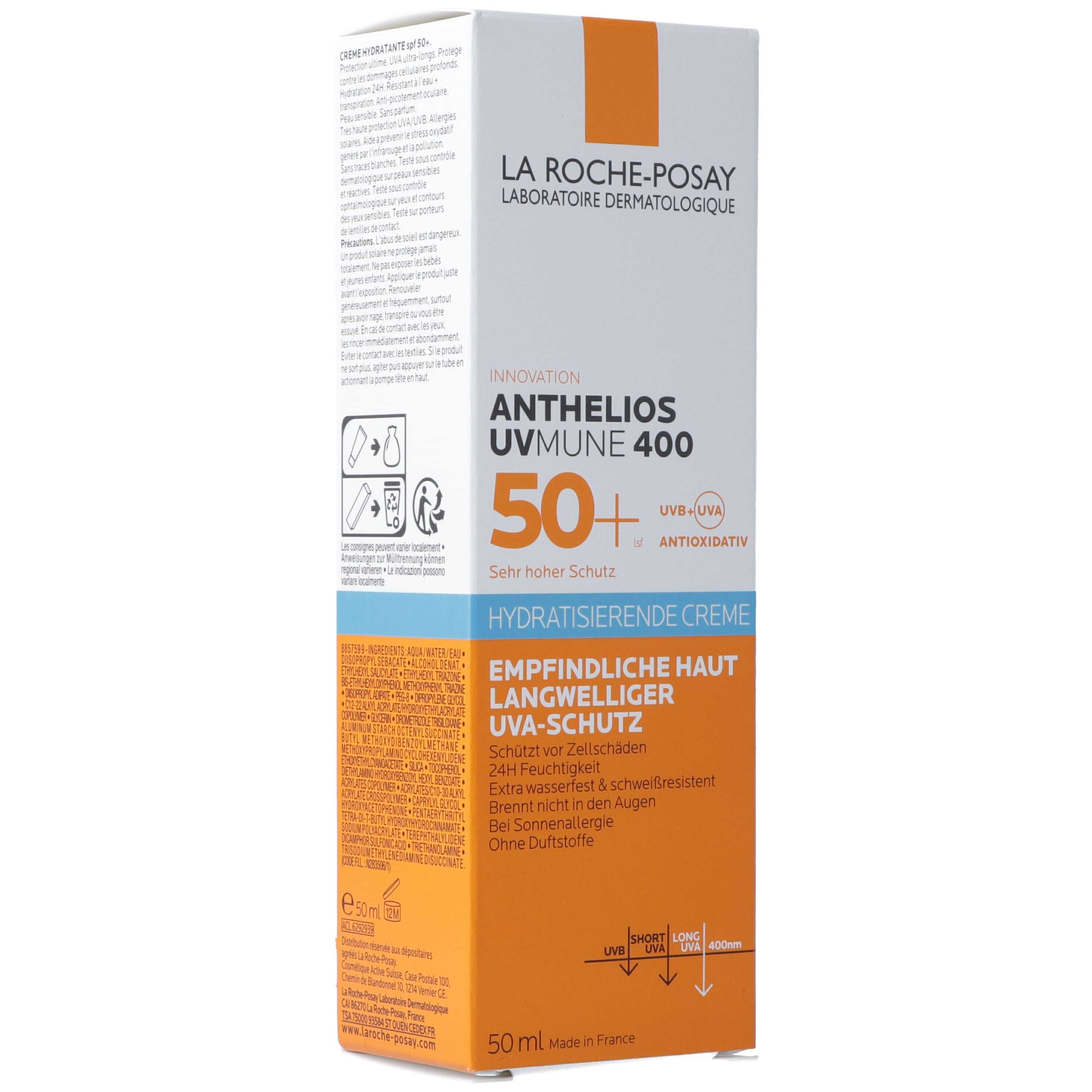 La Roche Posay Anthelios Hydratisierende Creme UVMune 400 LSF 50+ mit MEXORYL 400, der wirksamste Filter von La Roche Posay gegen schädliche ultra-lange UVA-Strahlen. Die innovative Sonnencreme für das Gesicht bietet einen hohen Schutz vor UVB-, UVA- und langen UVA-Strahlen, um tiefen Zellschäden entgegenzuwirken. Getestet an empfindlicher, reaktiver und zu Sonnenallergie neigender Haut. Geeignet für alle Haut- und Fototypen.