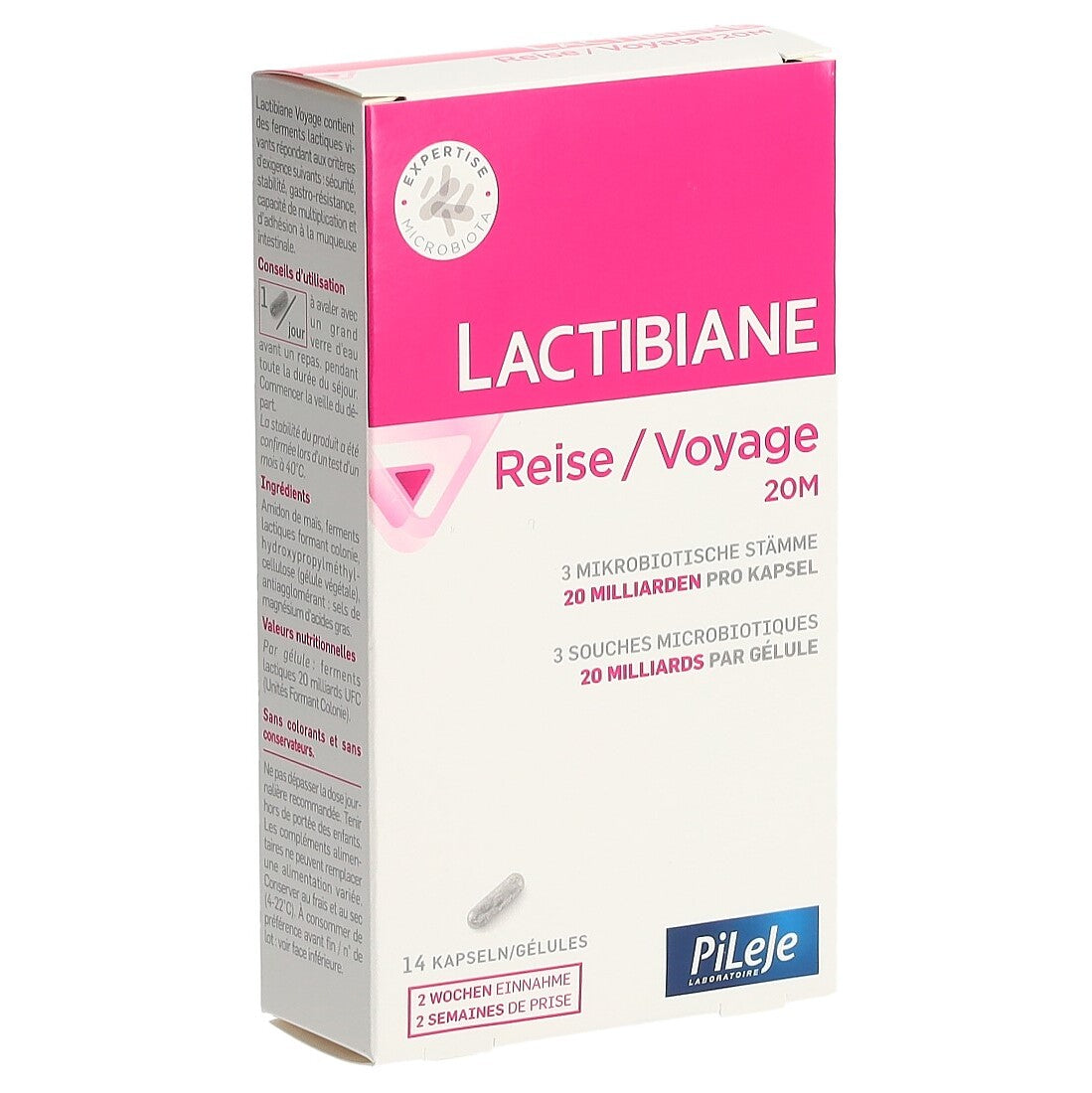 Gleichgewicht des Darmmikrobioms während Auslandreisen. Jede Dosis Lactibiane Reise 20M enthält 20 Milliarden lebende Milchsäurebakterien Lactobacillus acidophilus LA 201, Lactobacillus casei LA 205 und Lactobacillus plantarum LA 301.