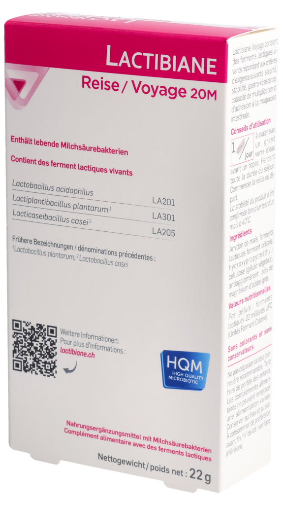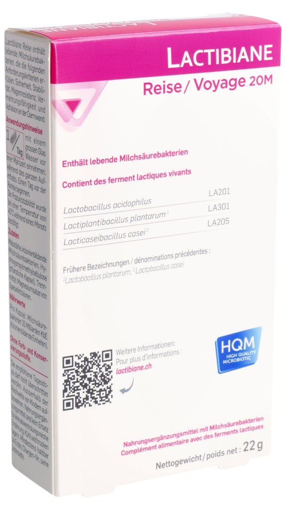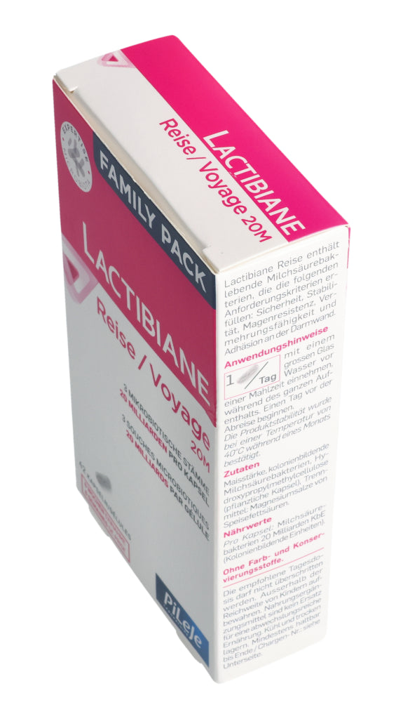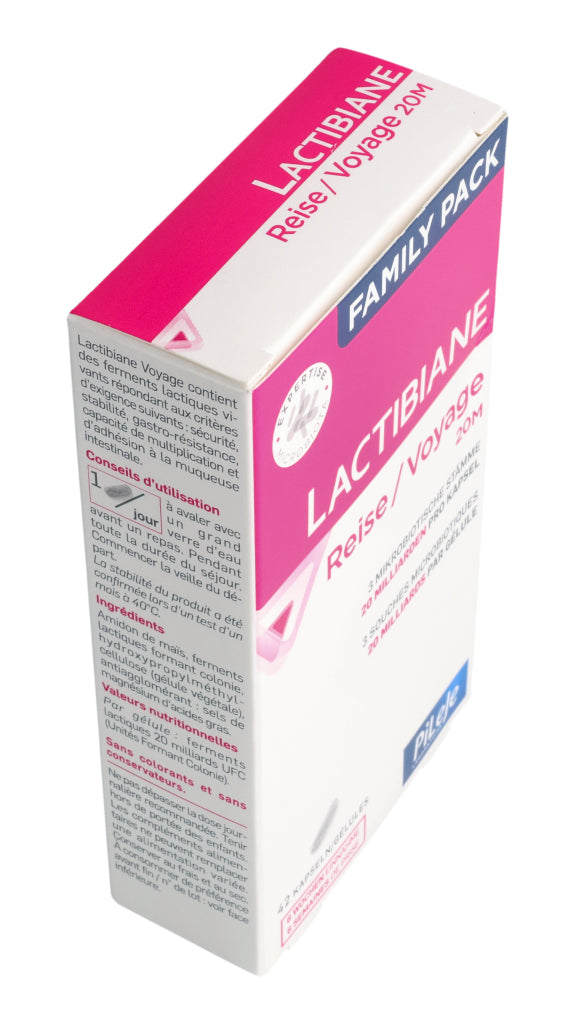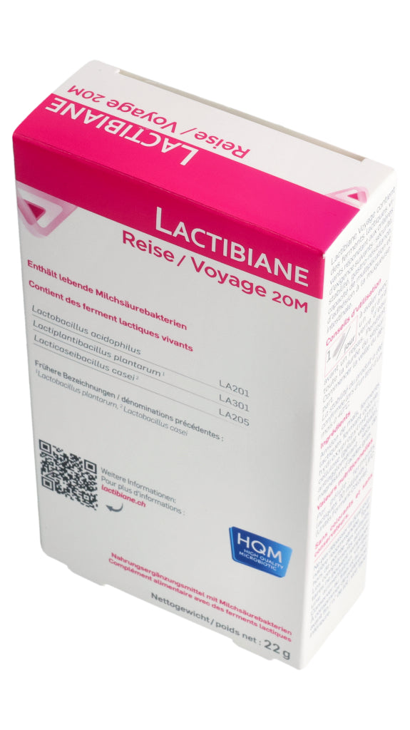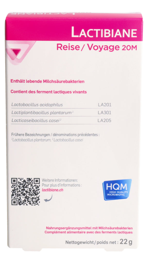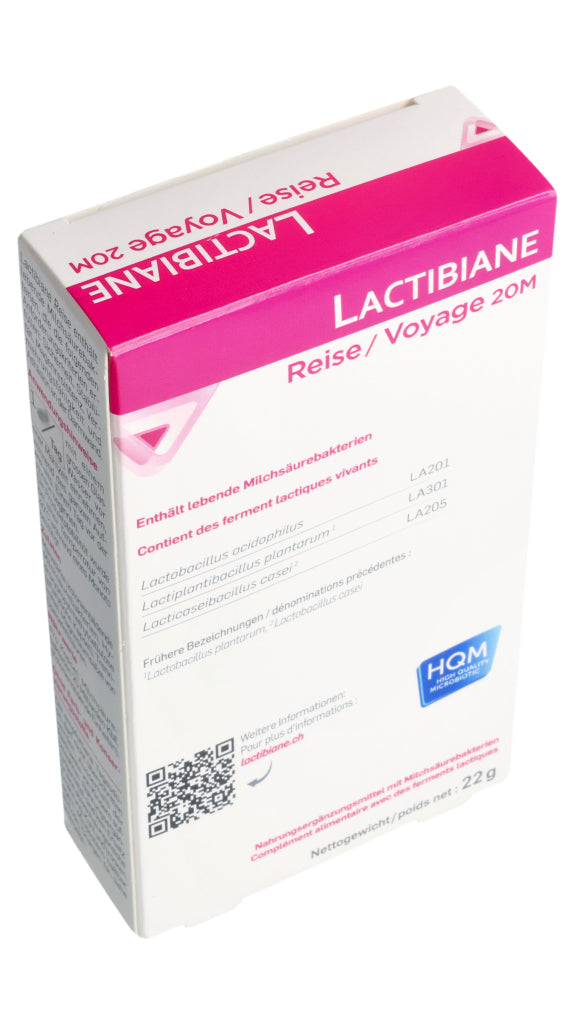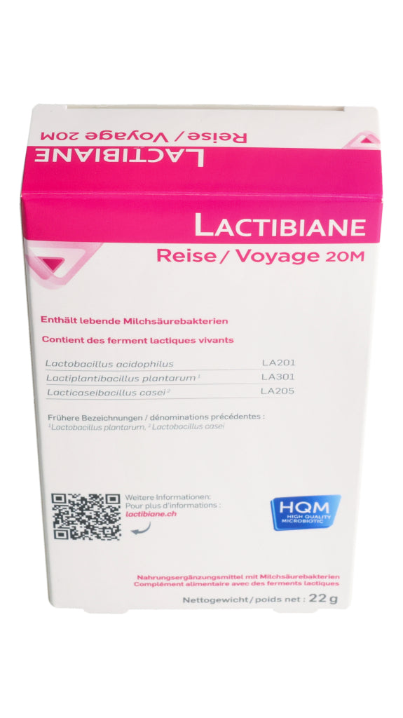 Gleichgewicht des Darmmikrobioms während Auslandreisen. Jede Dosis Lactibiane Reise 20M enthält 20 Milliarden lebende Milchsäurebakterien Lactobacillus acidophilus LA 201, Lactobacillus casei LA 205 und Lactobacillus plantarum LA 301.