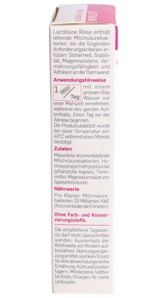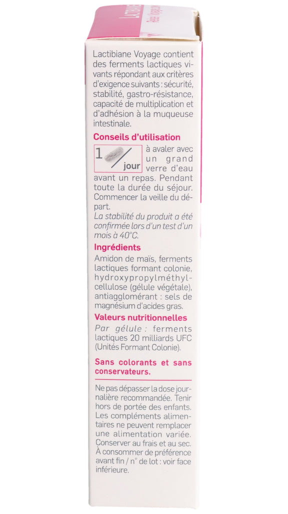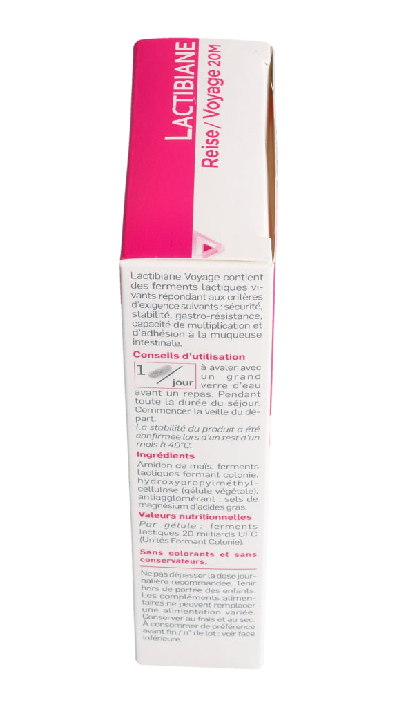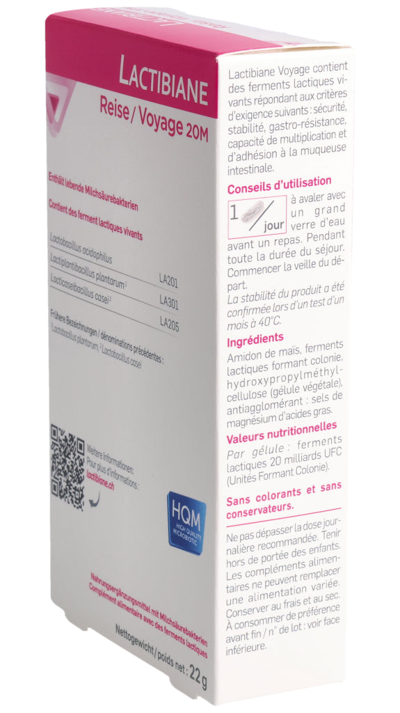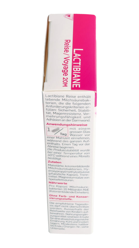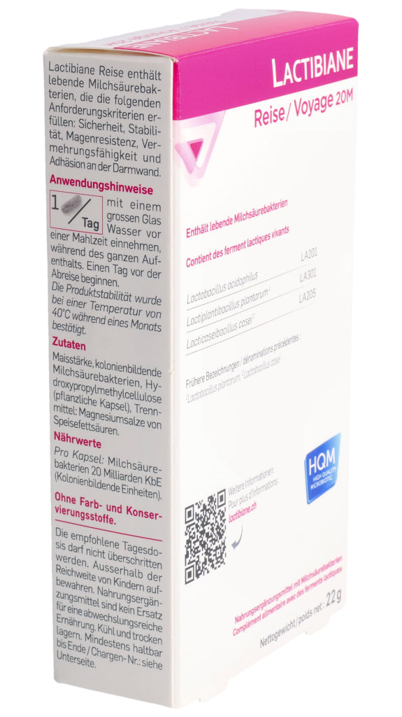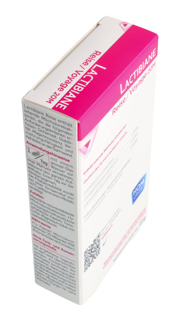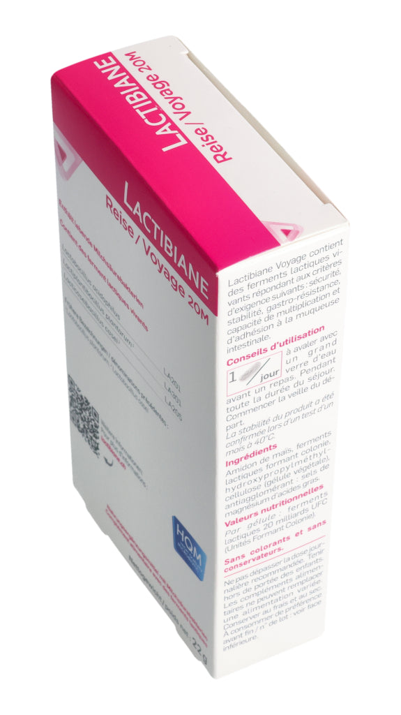 Gleichgewicht des Darmmikrobioms während Auslandreisen. Jede Dosis Lactibiane Reise 20M enthält 20 Milliarden lebende Milchsäurebakterien Lactobacillus acidophilus LA 201, Lactobacillus casei LA 205 und Lactobacillus plantarum LA 301.