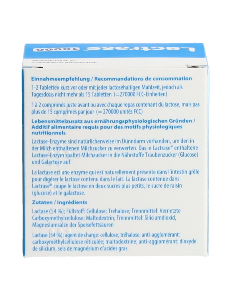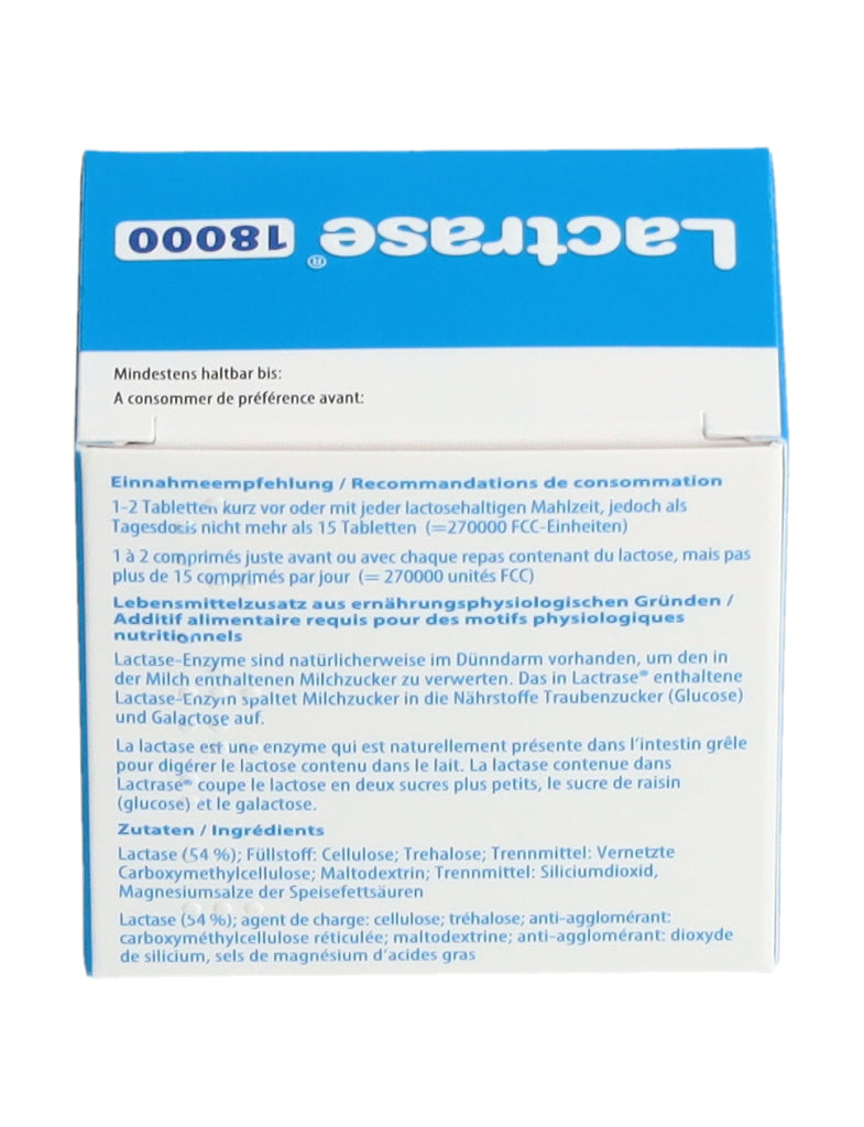 Lactase (54%); Füllstoff: Cellulose; Trehalose; Trennmittel: Vernetzte Carboxymethylcellulose; Maltodextrin; Trennmittel: Siliciumdioxid, Magnesiumsalze der Speisefettsäuren..