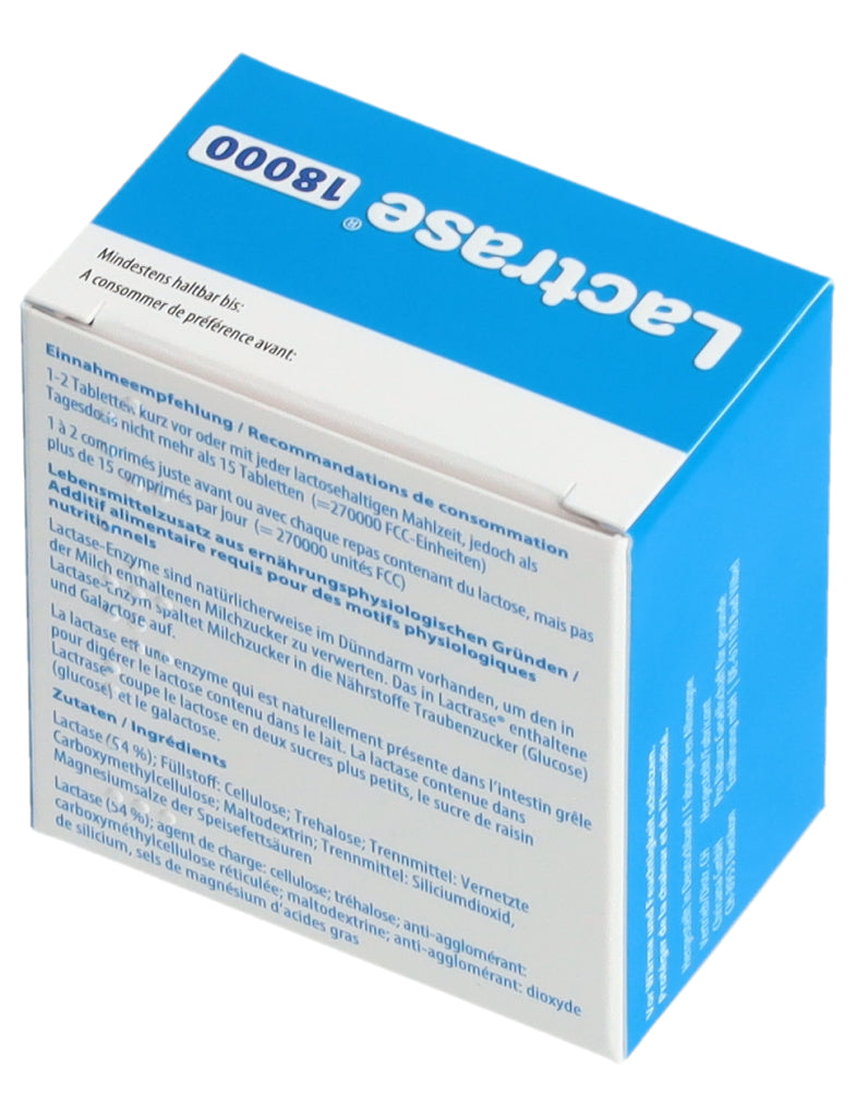 1-2 Tabletten kurz vor oder mit jeder laktosehaltigen Mahlzeit, jedoch als Tagesdosis nicht mehr als 15 Tabletten (=270000 FCC-Einheiten).