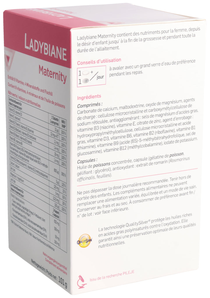 Tabletten: Calciumcarbonat, Maltodextrin, Magnesiumoxid, Füllstoffe: mikrokristalline Cellulose und vernetzte Natriumcarboxymethylcellulose, Trennmittel: Magnesiumsalze von Fettsäuren, Vitamin B3 (Niacin), Vitamin E, Zinkcitrat, Überzugsmittel: Hydroxypropylmethylcellulose, mikrokristalline Cellulose und Fettsäuren, Vitamin D3, Vitamin B6, Vitamin B2 (Riboflavin), Vitamin B1 (Thiamin), Vitamin B9 ((6S)-5-Methyltetrahydrofolsäure, Glucosaminsalz), Vitamin B12 (Methylcobalamin), Kaliumjodat. Kapseln: Konzentriertes Fischöl, Kapsel (Fischgelatine, Geliermittel: Glycerol), Antioxidationsmittel: Rosmarinextrakt (Rosmarinus officinalis, Blätter). Für 1 Tablette: Vitamin D3 : 10 μg 200 %* Vitamin E: 12 mg α-ET 100 %* Vitamin B1 (Thiamine): 1.1 mg 100%* Vitamin B2 (Riboflavine): 1.4 mg 100%* Vitamin B3 (Niacine): 16 mg 100%* Vitamin B6: 1.4 mg 100%* VitamineB9 (Folsäure), (6S)-5-Methyltetrahydrofolsäure, Glucosaminsalz : 600 μg 300%° Vitamine B12(Methylcobalamin): 3 μg 120%* Calcium: 120mg 15% * Zinc: 5 mg 50%* Magnesium: 112.5 mg 30%* Iod: 150 μg 100 %* *VNR : Valeurs Nutritionnelles de Référence Für 1 Kapsel: Fischöl : 625mg > Davon mehrfach ungesättigte Omega 3- Fettsäuren : 356mg Eicosapentaensäure (EPA): 56mg Docosahexaensäure (DHA): 250mg.