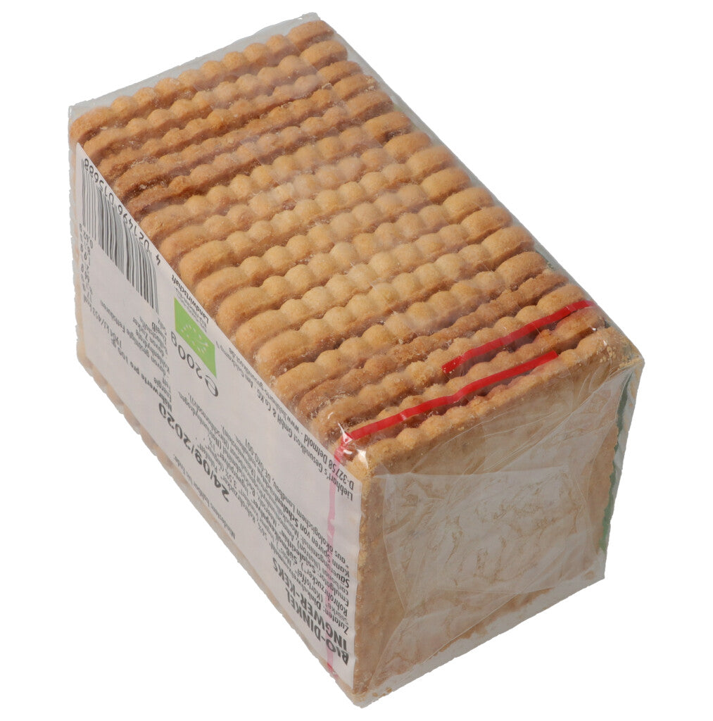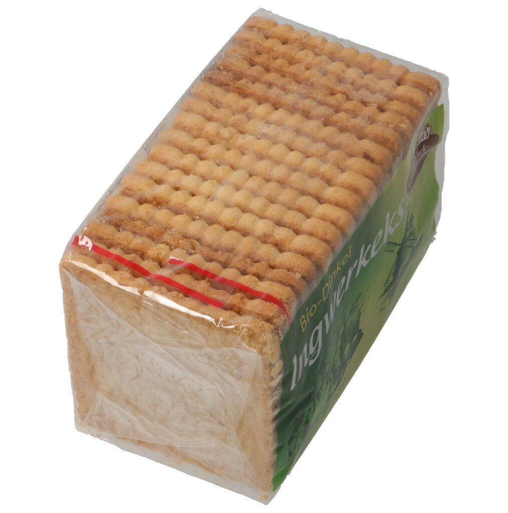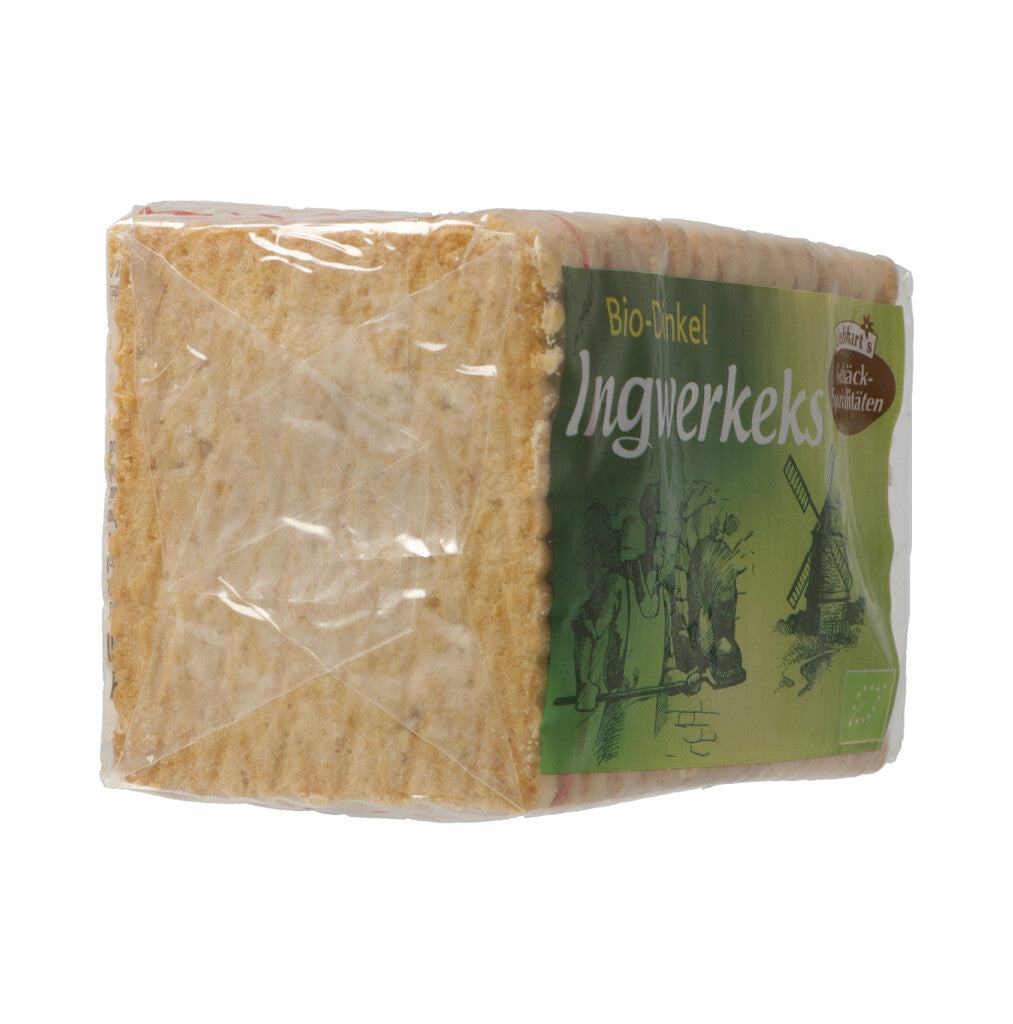 DINKELMEHL* 56%, Rohrohrzucker*, Palmfett*, Kartoffelstärke*, Ingwer kandiert* 3.5% (Ingwer*, Rohrohrzucker*), SÜSSMOLKENPULVER*, Backtriebmittel: Maisstärke*, Weinstein, Natriumhydrogencarbonat (Natron), Ammoniumhydrogencarbonat (Hirschhornsalz), Ingwerp.