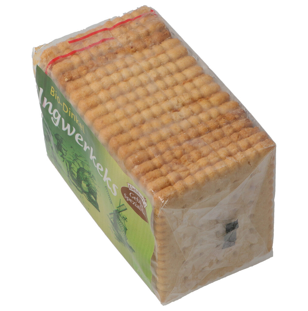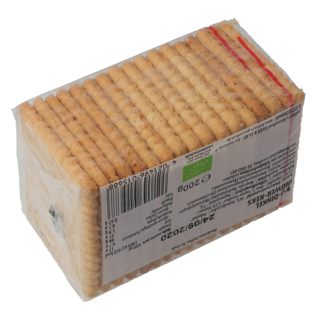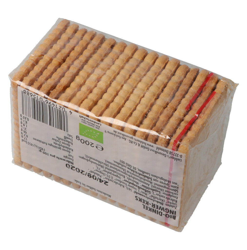 DINKELMEHL* 56%, Rohrohrzucker*, Palmfett*, Kartoffelstärke*, Ingwer kandiert* 3.5% (Ingwer*, Rohrohrzucker*), SÜSSMOLKENPULVER*, Backtriebmittel: Maisstärke*, Weinstein, Natriumhydrogencarbonat (Natron), Ammoniumhydrogencarbonat (Hirschhornsalz), Ingwerp.