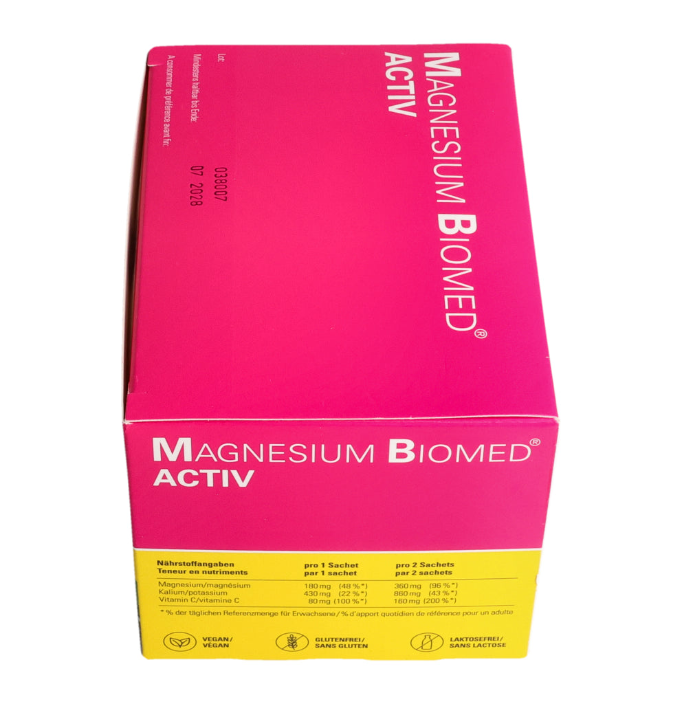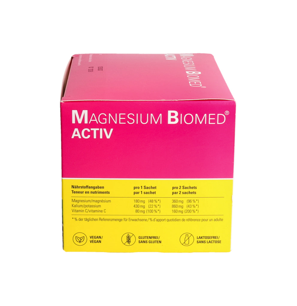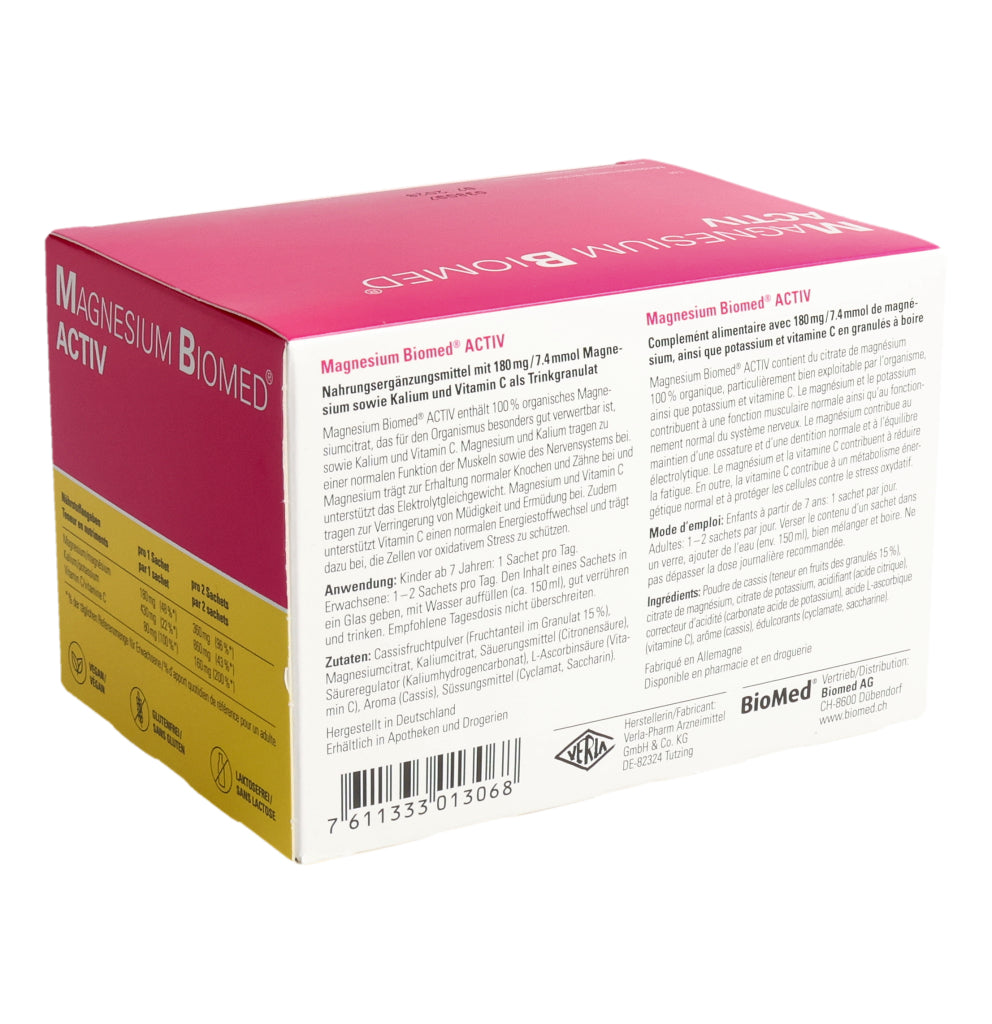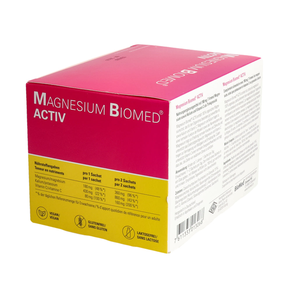 Magnesium Biomed® ACTIV enthält 100 % organisches Magnesiumcitrat, das für den Organismus besonders gut verwertbar ist. Vor allem Sportler:innen, Personen in Stresssituationen, Kinder im Wachstum und ältere Personen haben einen erhöhten Magnesiumbedarf. Magnesium und Kalium tragen zu einer normalen Funktion der Muskeln sowie des Nervensystems bei. Magnesium trägt zur Erhaltung normaler Knochen und Zähne bei und unterstützt das Elektrolytgleichgewicht. Magnesium und Vitamin C tragen zur Verringerung von Müdigkeit und Ermüdung bei. Zudem unterstützt Vitamin C einen normalen Energiestoffwechsel und trägt dazu bei, die Zellen vor oxidativem Stress zu schützen.