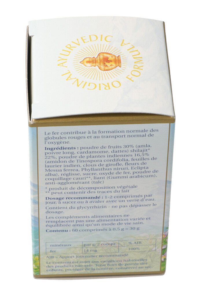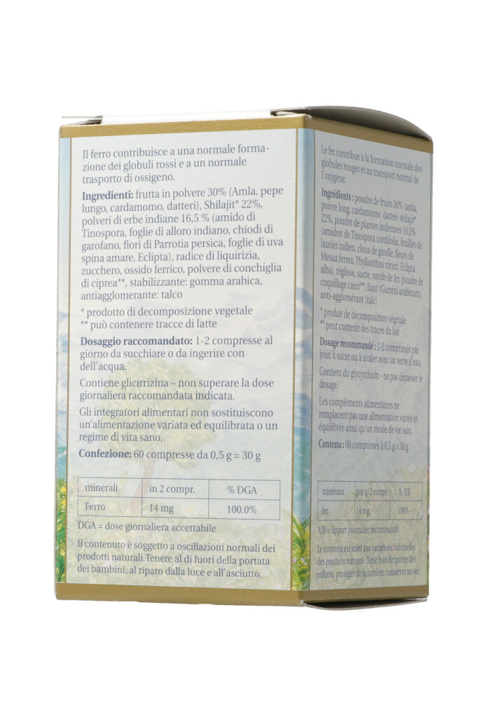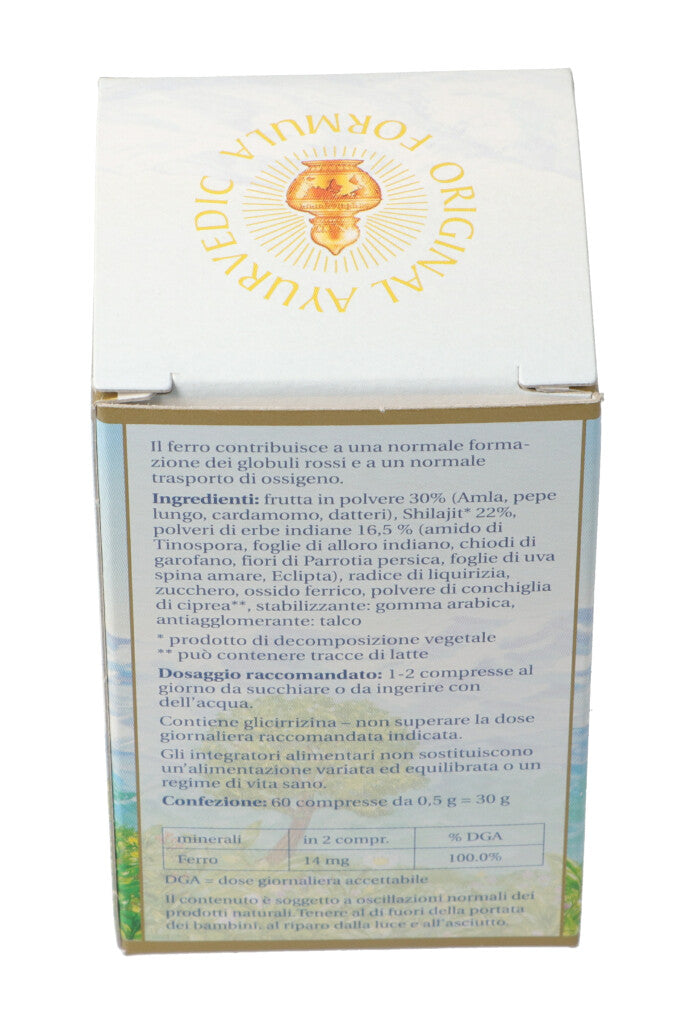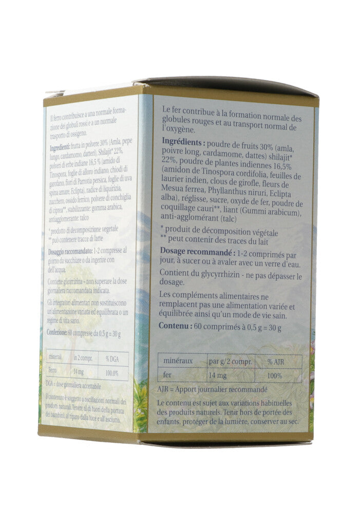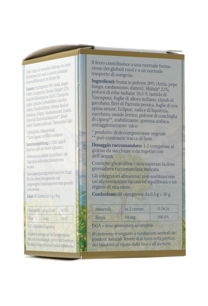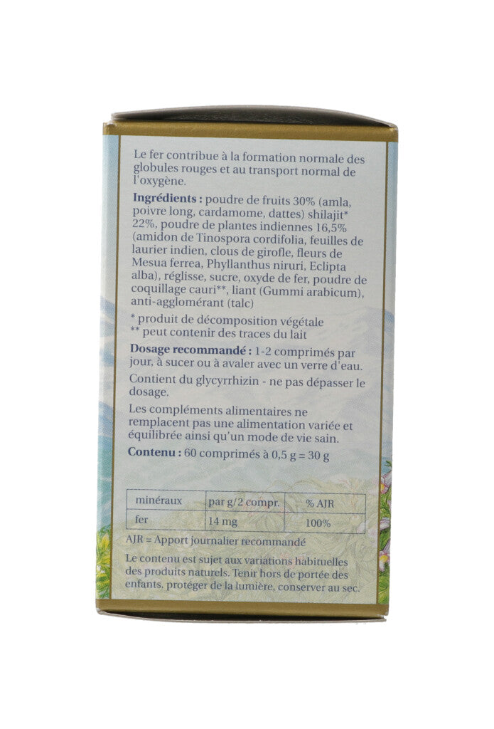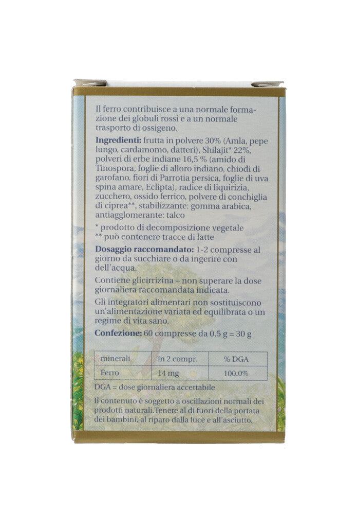 Fruchtpulver 30% (Amla, langer Pfeffer, Cardamom, Datteln) Shilajit* 22%, indische Kräuterpulver 16,5% (Tinospora- stärke, indische Lorbeerblätter, Gewürz- nelken, Eisenholzblüten, bitteres Stachel- beerkraut, Eclipta), Süssholzwurzel, Zucker, Eisenoxid, Kaurimuschelpulver**, Binde- mittel (Gummi arabicum), Trennmittel(Talk) pflanzliches Abbauprodukt ** kann Spuren von Milch enthalten..