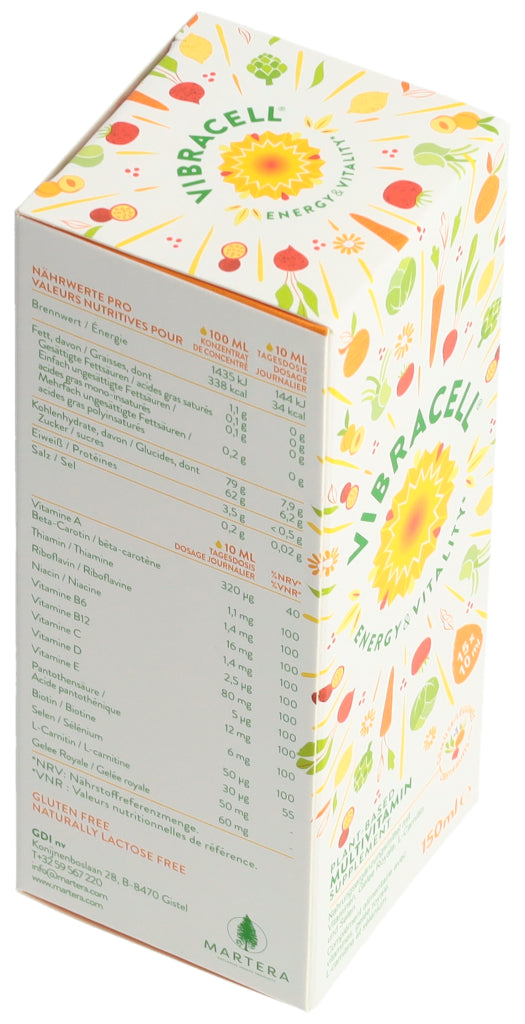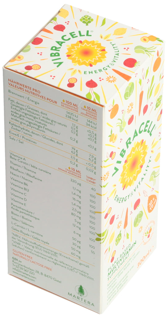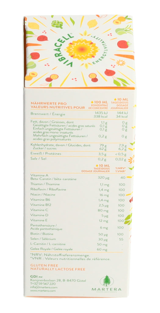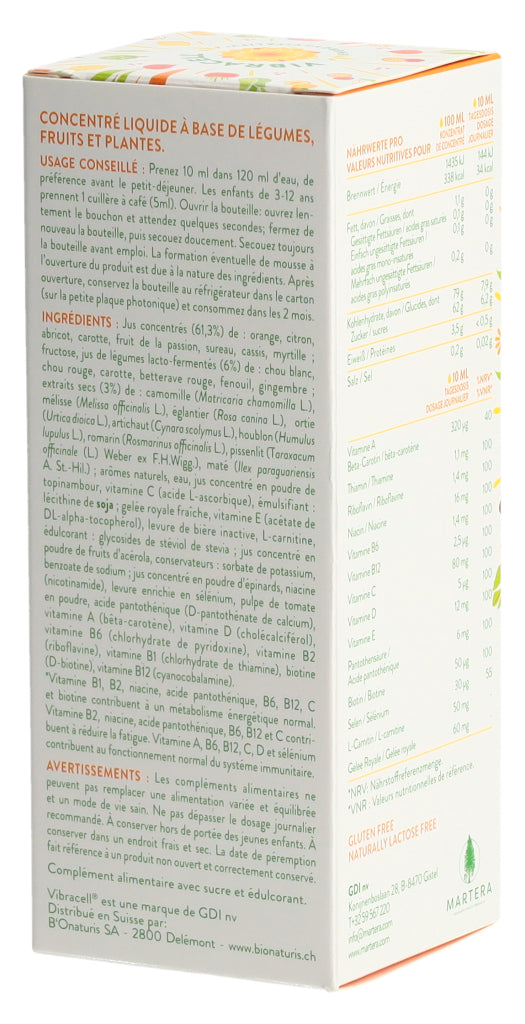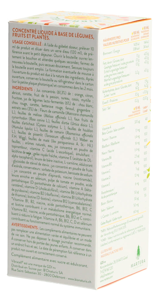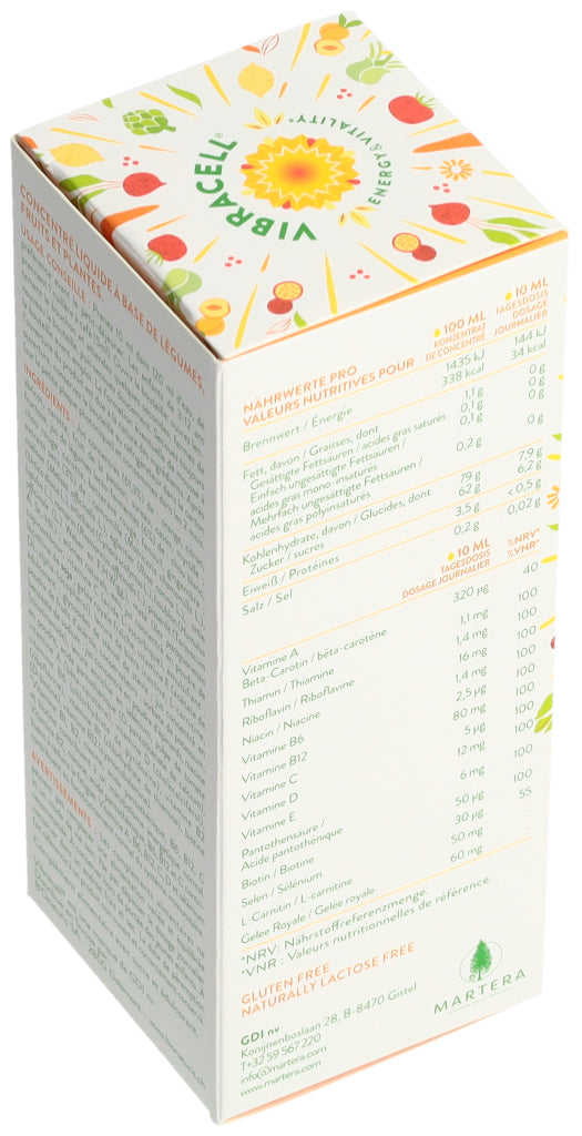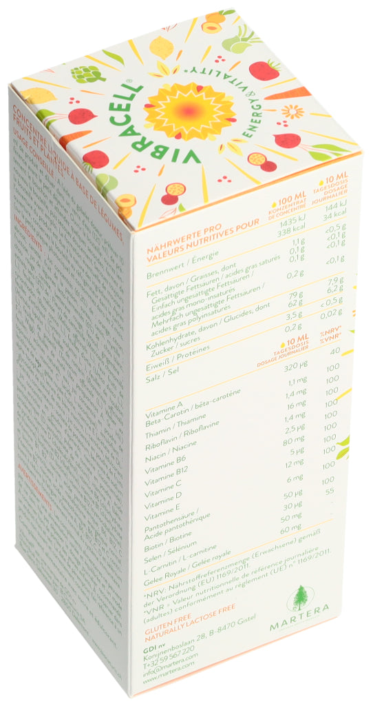 Martera Vibracell ist ein natürliches Nahrungsergänzungsmittel aus Konzentrat von Gemüsen, Früchten, Kräutern und Pflanzen, welche vorwiegend aus biologischem Anbau stammen. Die enthaltenen Nährstoffe und Vitamine unterstützen das natürliche Immunsystem und steigern das körperliche Wohlbefinden. Der Saft ist angenehm im Geschmack, frei von Konservierungsmittel und chemischen Zusätzen.