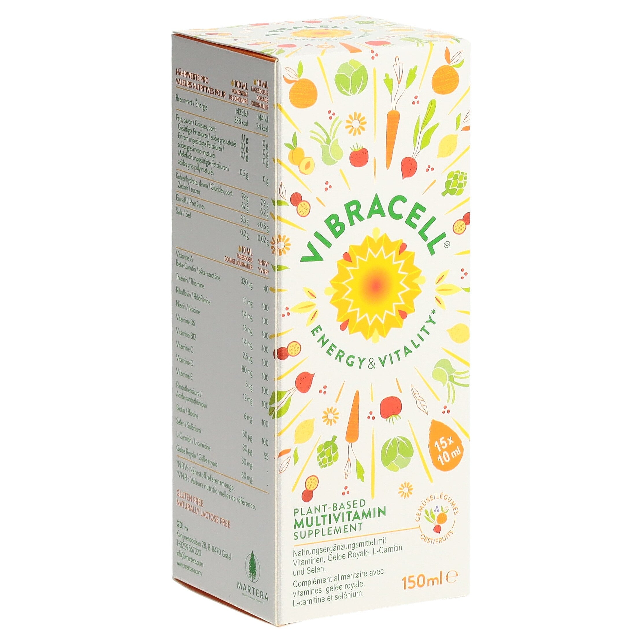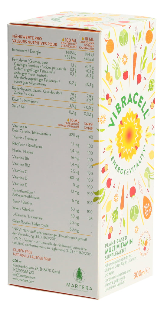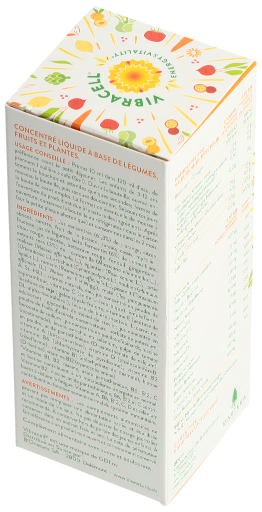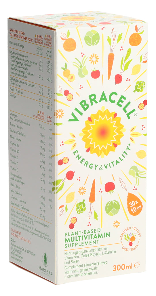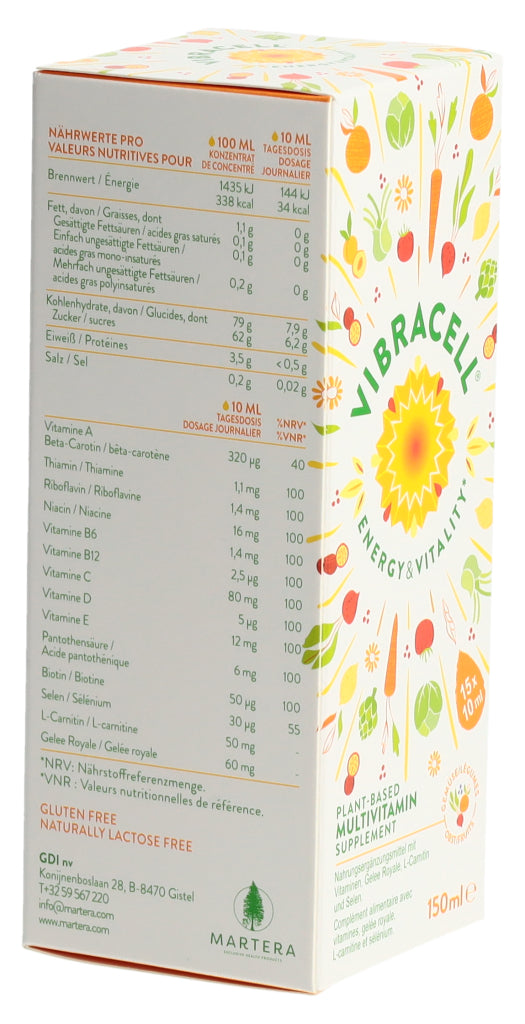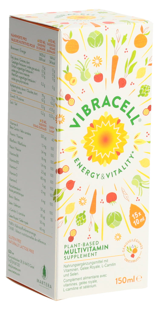 Martera Vibracell ist ein natürliches Nahrungsergänzungsmittel aus Konzentrat von Gemüsen, Früchten, Kräutern und Pflanzen, welche vorwiegend aus biologischem Anbau stammen. Die enthaltenen Nährstoffe und Vitamine unterstützen das natürliche Immunsystem und steigern das körperliche Wohlbefinden. Der Saft ist angenehm im Geschmack, frei von Konservierungsmittel und chemischen Zusätzen.