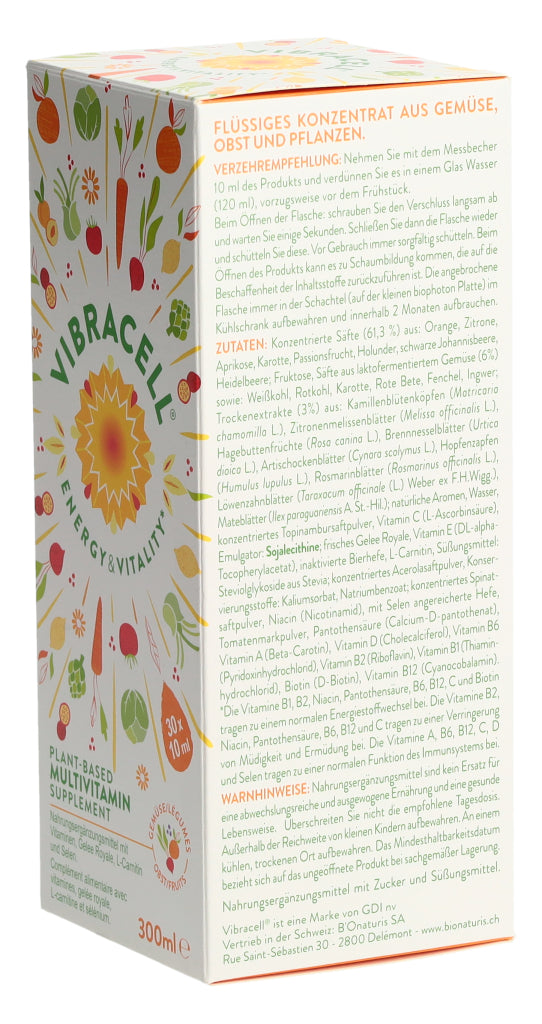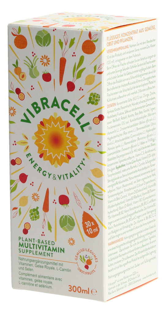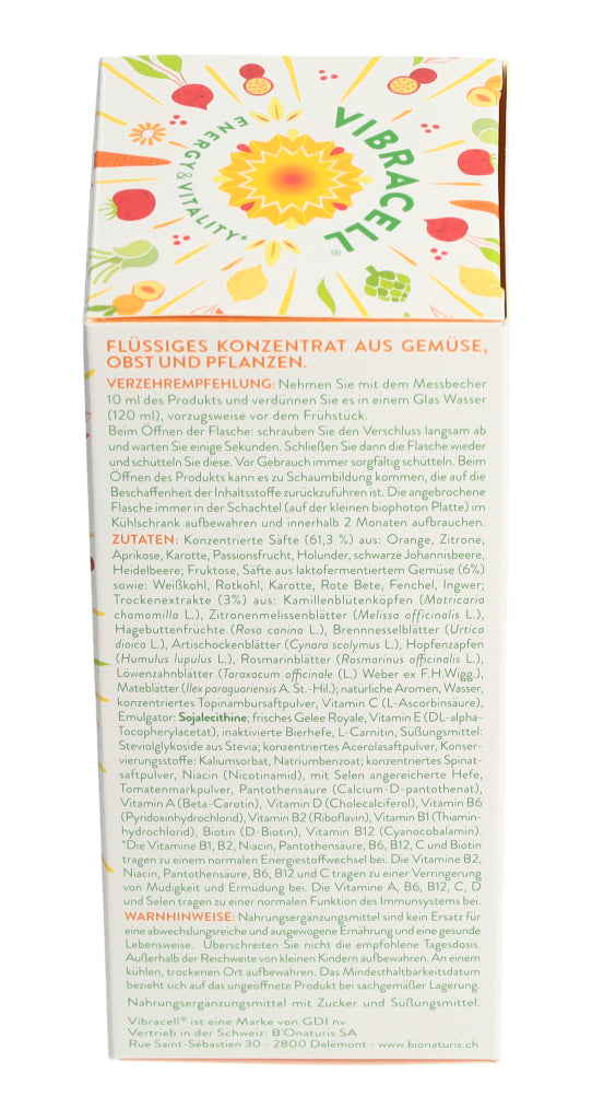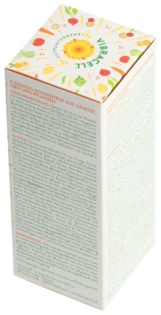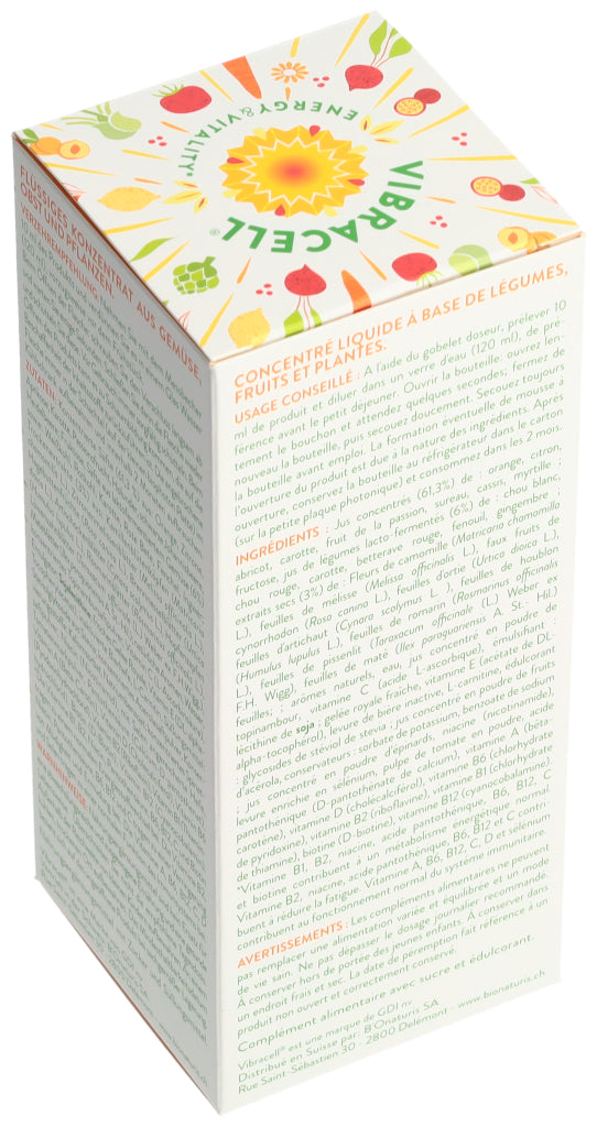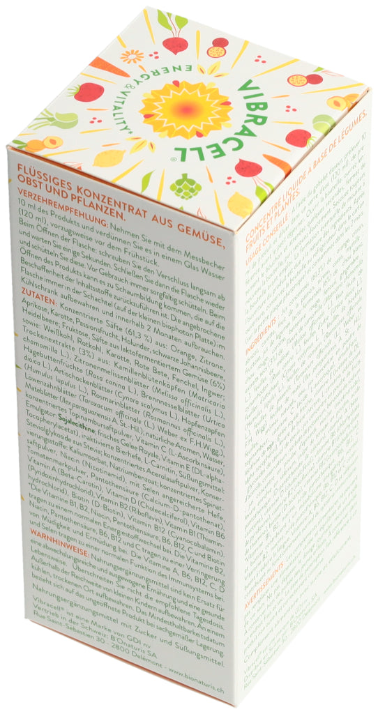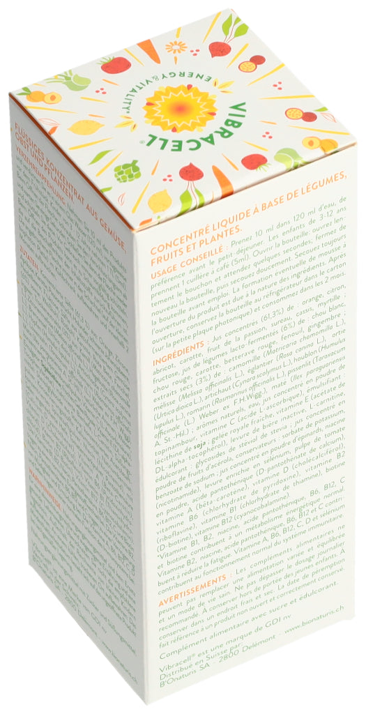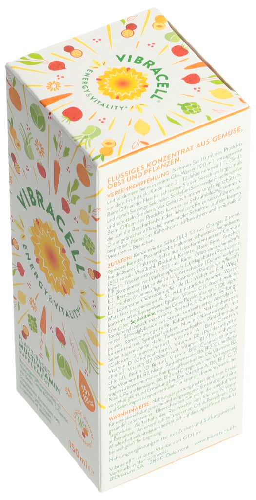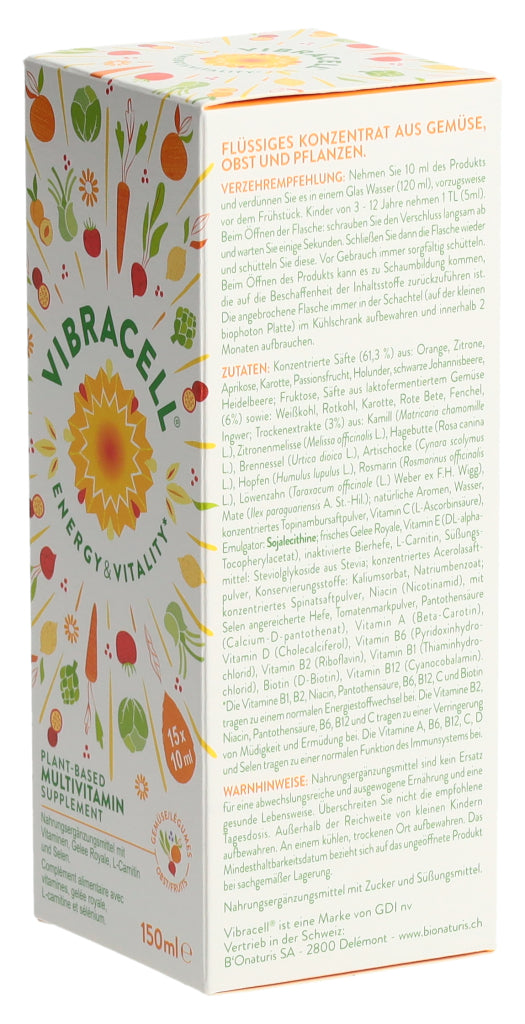 Die angebrochene Flasche immer in der Schachtel im Kühlschrank aufbewahren und innerhalb von 2 Monaten aufbrauchen. Die angegebene empfohlene tägliche Verzehrempfehlung darf nicht überschritten werden. Vibracell sollte nicht als Ersatz für eine abwechslungsreiche und ausgewogene Ernährung und einen gesunden Lebensstil verwendet werden. Das Produkt ist ausserhalb der Reichweite von kleinen Kindern zu lagern. Bei gleichzeitiger Anwendung von Antikoagulanzien, wenden Sie sich an Ihren Arzt. Bei Patienten mit Schilddrüsenunterfunktion oder unter Schilddrüsenbehandlung, wenden Sie sich an Ihren Arzt. Hergestellt in Belgien.