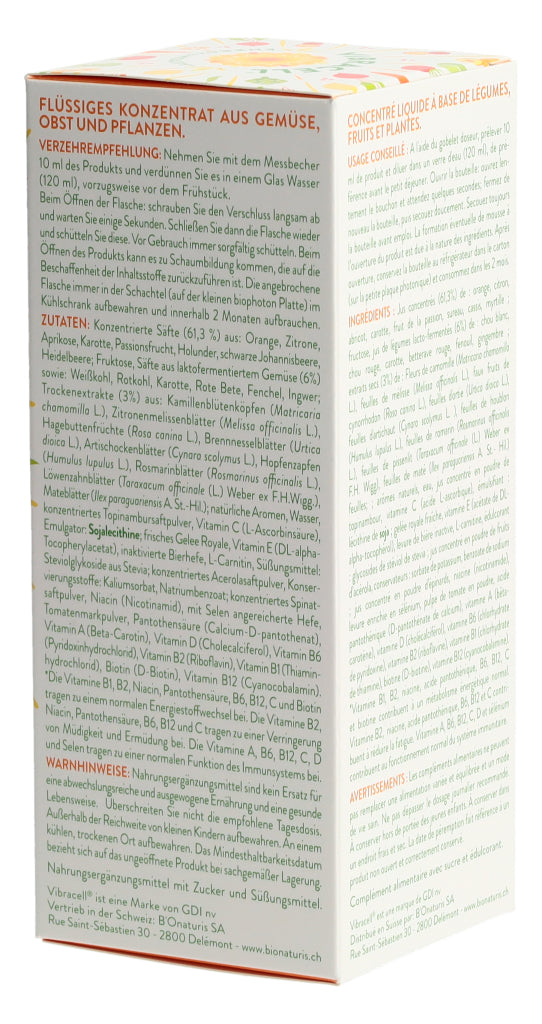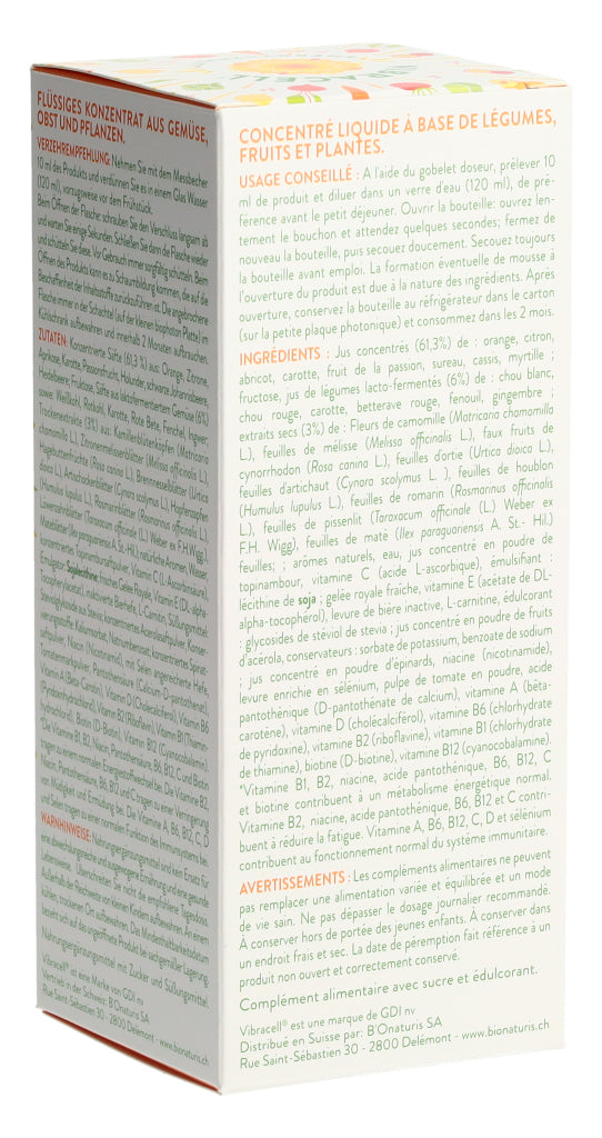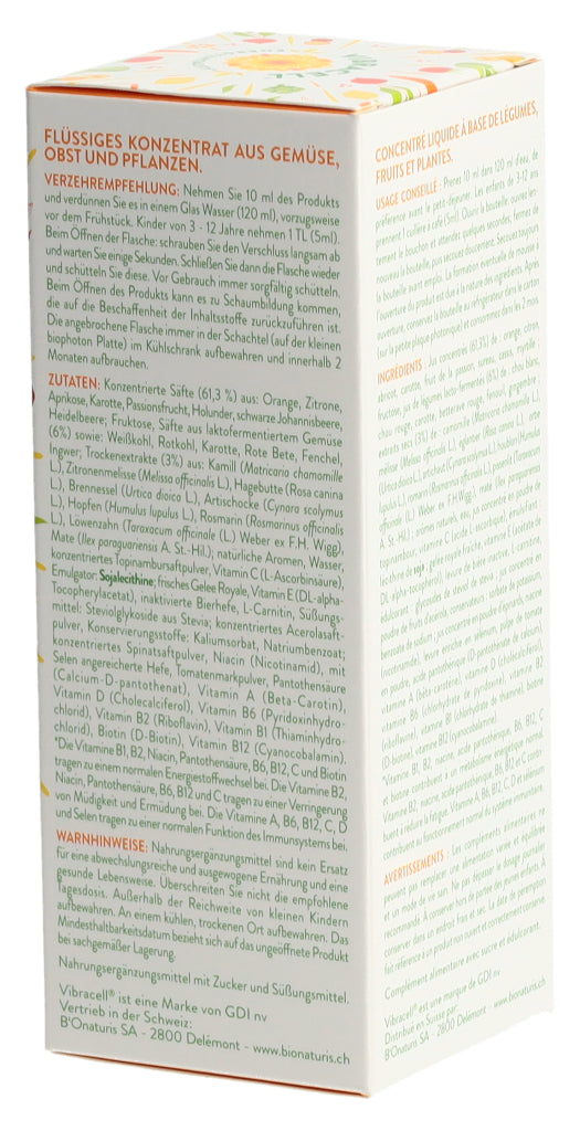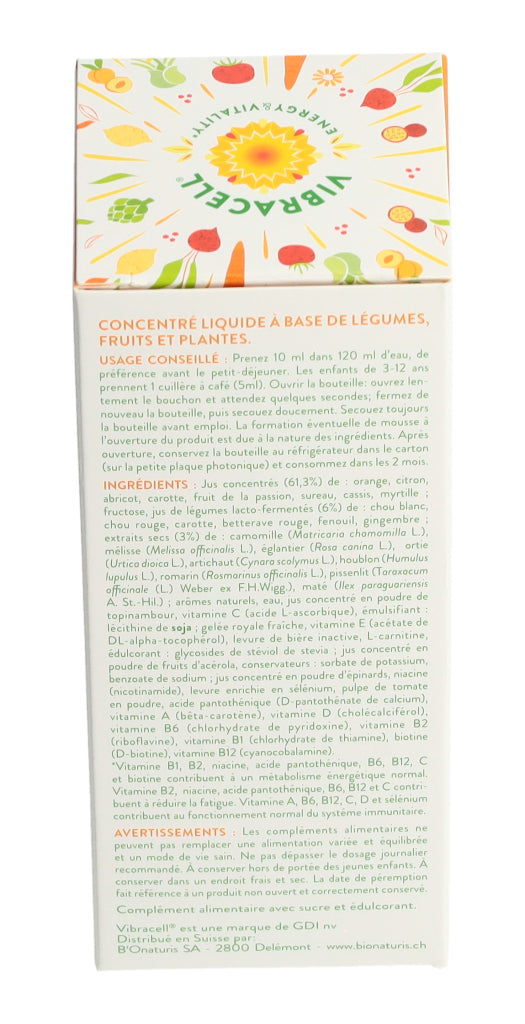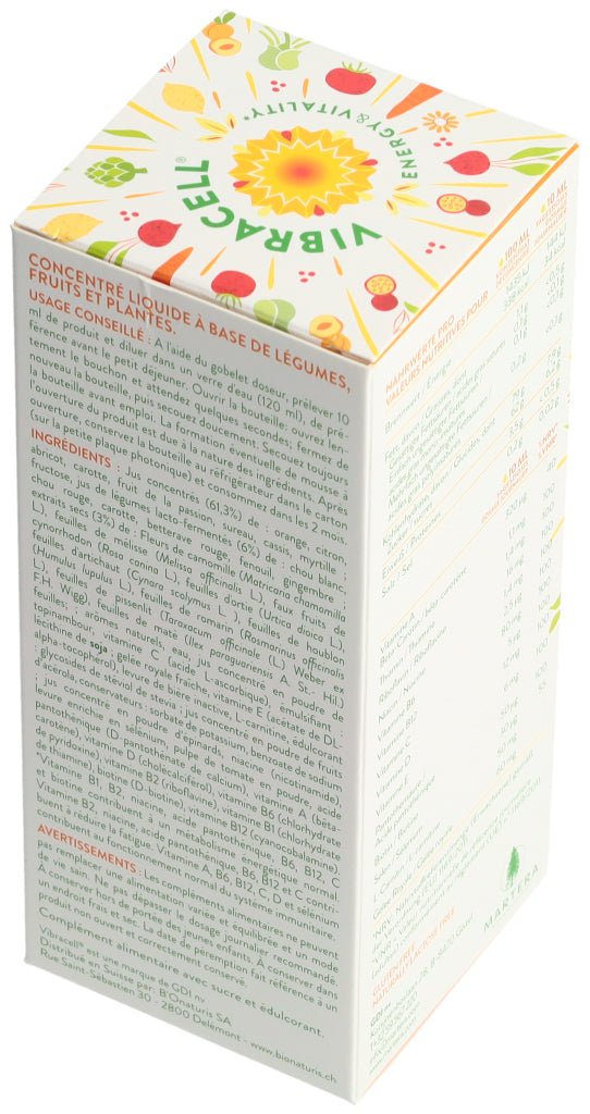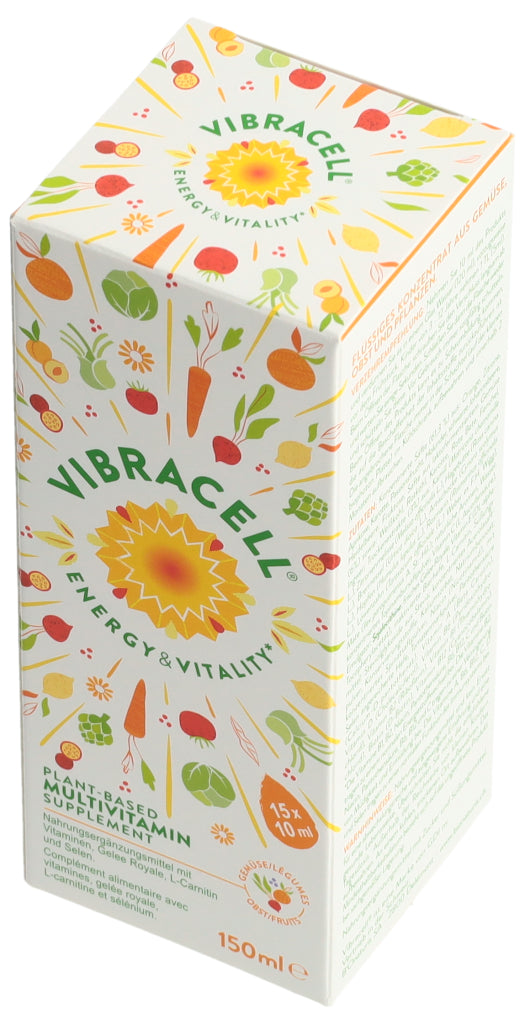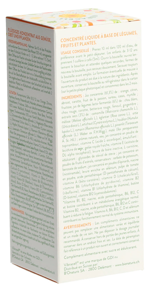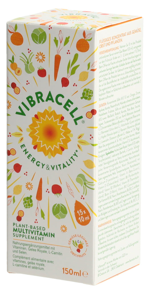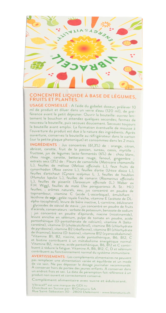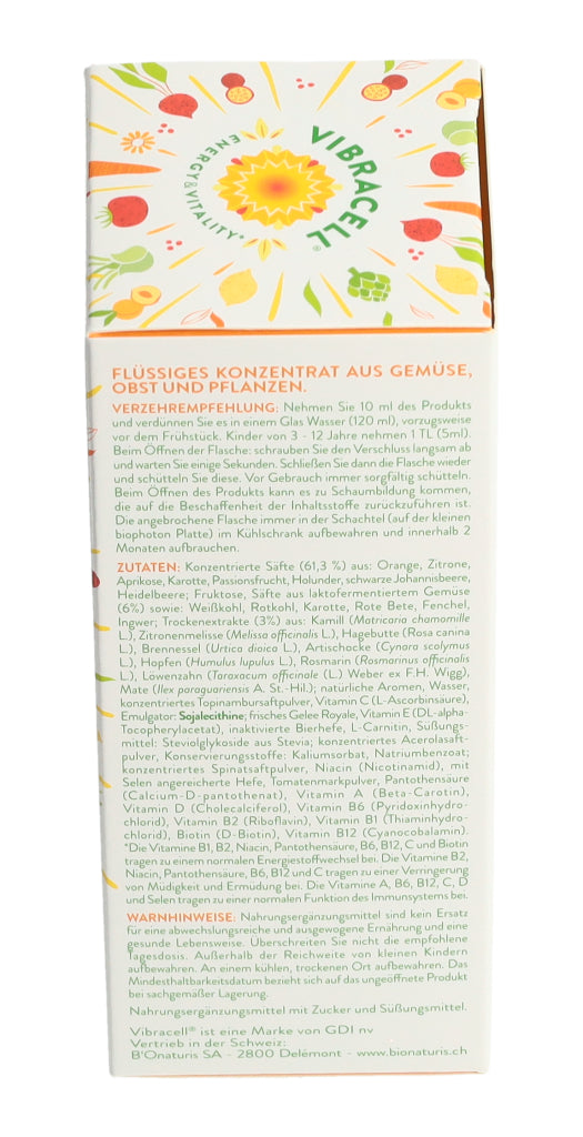 Die angebrochene Flasche immer in der Schachtel im Kühlschrank aufbewahren und innerhalb von 2 Monaten aufbrauchen. Die angegebene empfohlene tägliche Verzehrempfehlung darf nicht überschritten werden. Vibracell sollte nicht als Ersatz für eine abwechslungsreiche und ausgewogene Ernährung und einen gesunden Lebensstil verwendet werden. Das Produkt ist ausserhalb der Reichweite von kleinen Kindern zu lagern. Bei gleichzeitiger Anwendung von Antikoagulanzien, wenden Sie sich an Ihren Arzt. Bei Patienten mit Schilddrüsenunterfunktion oder unter Schilddrüsenbehandlung, wenden Sie sich an Ihren Arzt. Hergestellt in Belgien.