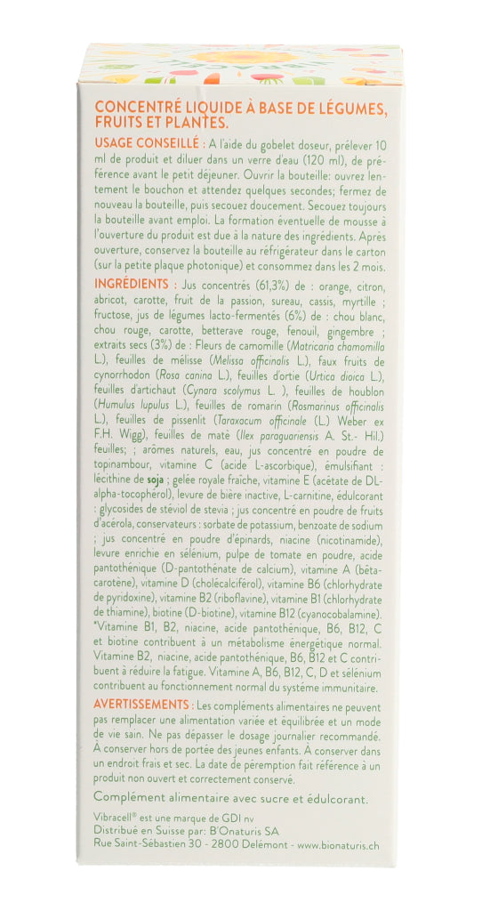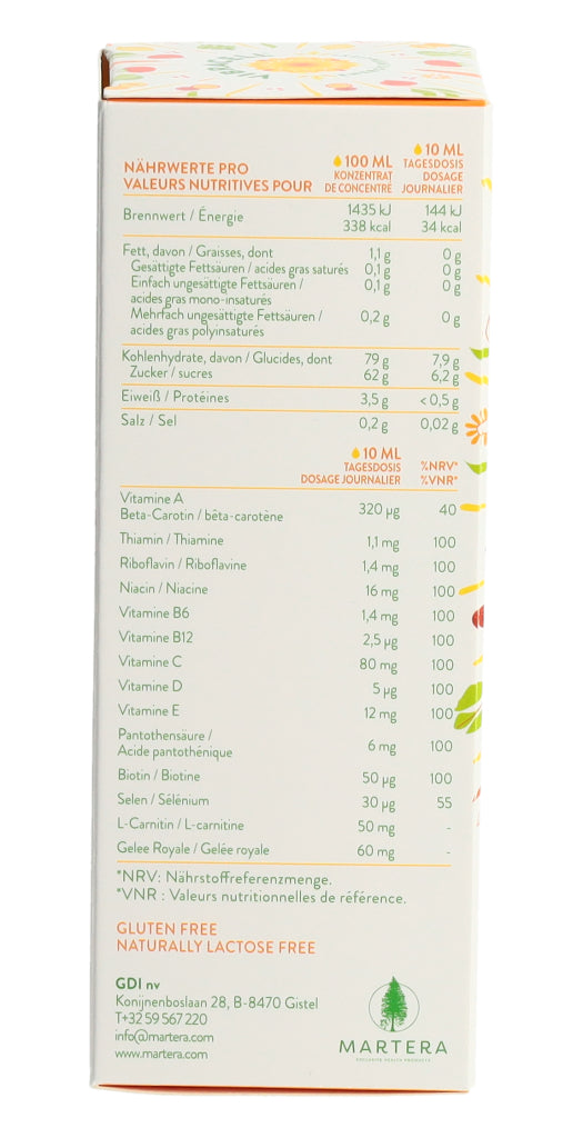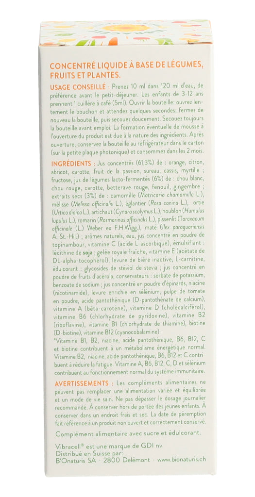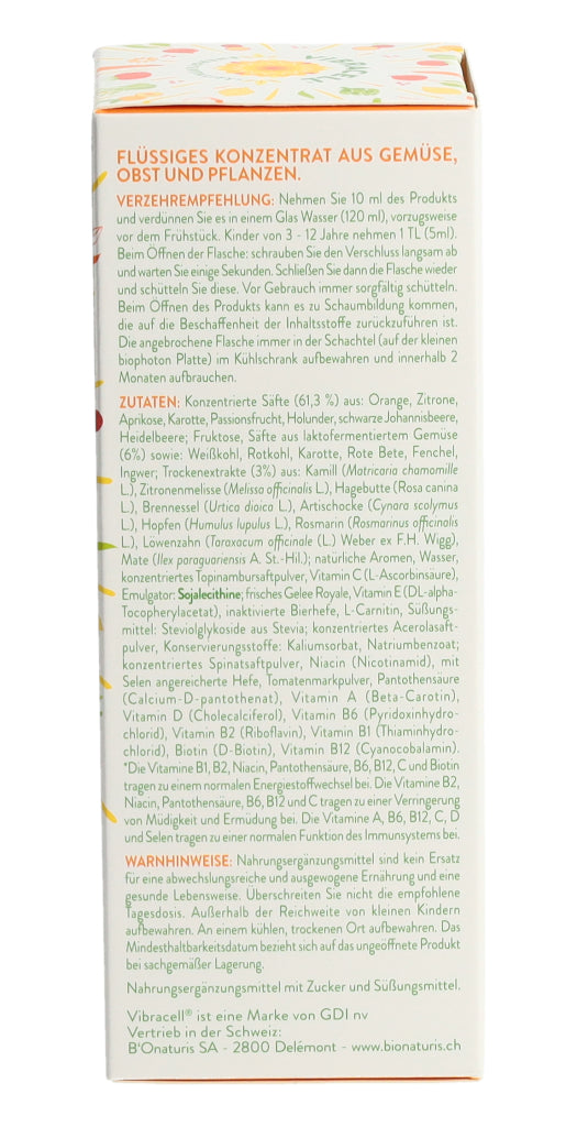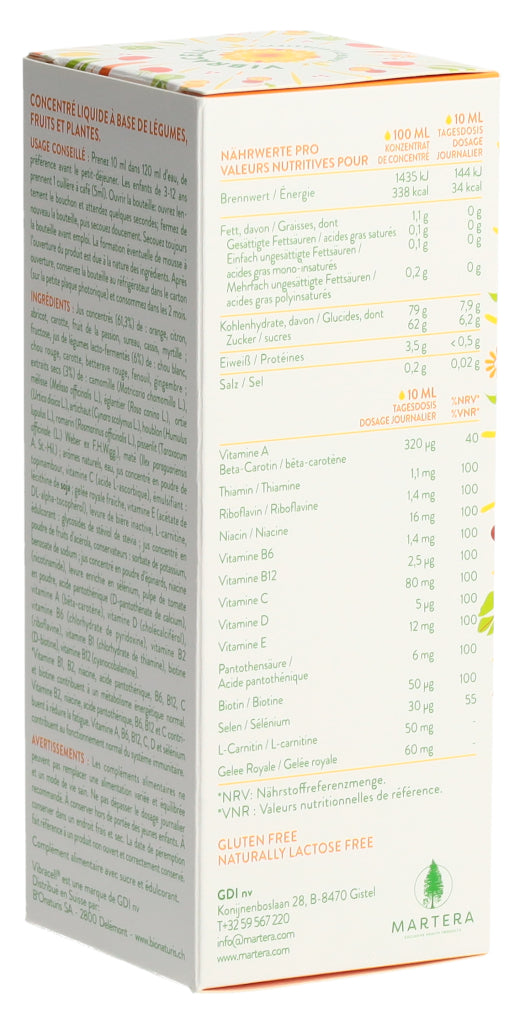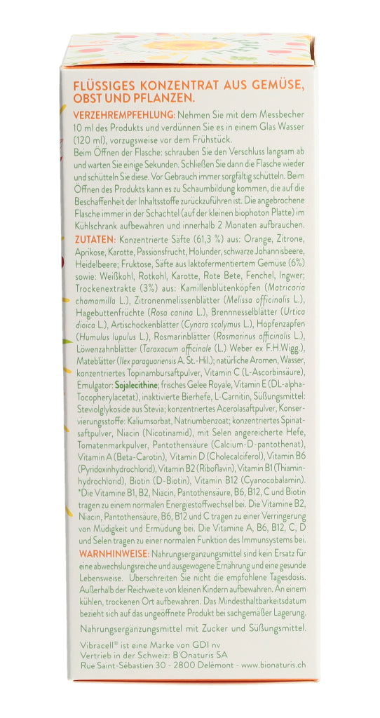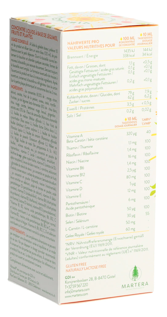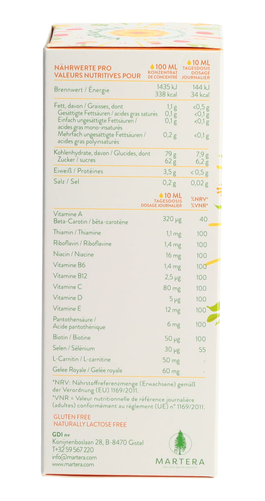Fruchtsaftkonzentrat aus Orange, Passionfrucht und Zitrone; Konzentrat aus milchsäuren fermentierten Säften aus Rote Bete, Karotten, Pastinake, Gurke, Zwiebeln, Paprika und Sauerkraut; Tomatenmark, Saftkonzentrat aus Holunderbeere, Johannisbeere und Heidelbeere; Fruktose; Planzenextrakte (3%): Kamille (Matricaria chamomilla), Melisse (Melissa officinalis), Hagebutten (Rosa Canina), Hopfen (Humulus lupulus), Artischocke (Cynara scolymus), Brennnsessel (Urtica dioica), Rosmarin (Rosmarinus officinalis), Löwenzahn (Taraxacum officinale) und Matetee (Iles paraguariensis); Hagebuttenkernöl; Topinambur Saftkonzentrat; natürliches Aroma; Vitamin C (L-Ascorbinsäure); frische Gelée Royale; inaktive Bierhefe; L-Carnitin; Emulgator Sojalecithin; Acerola Konzentrat, Vitamin E (DL-α-Tocopherylacetat); Brokkoli (Brassica oleracea) Extrakt; Vitamin B3 (Nicotinamid); Selenhefe; Vitamin B5 (Calcium-D-Pantothenat); Coenzym Q10; Beta-Carotin; Vitamin B6 (Pyridoxinhydrochlorid); Vitamin B1 (Thiaminhydrochlorid); Vitamin B2 (Riboflavin); Vitamin A (Retinylacetat); Folsäure (Pteroylmonoglutaminsäure); D-Biotin; Vitamin D3 (Cholecalciferol); Vitamin B12 (Cyanocobalamin). Nährwerte pro 10ml: L-Carnitin 50mg Coenzym Q10 5mg Gelée Royale 60mg.