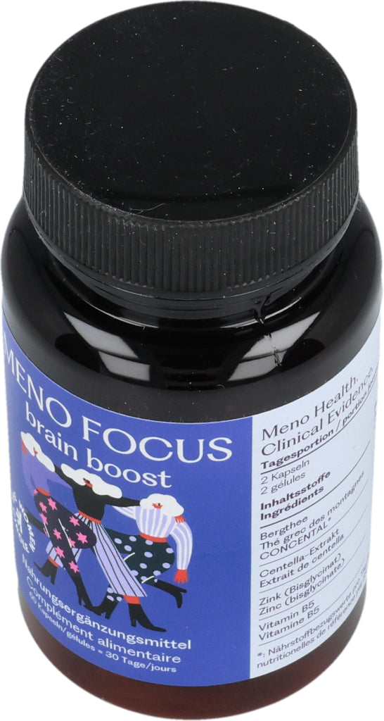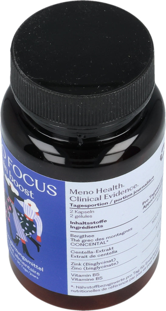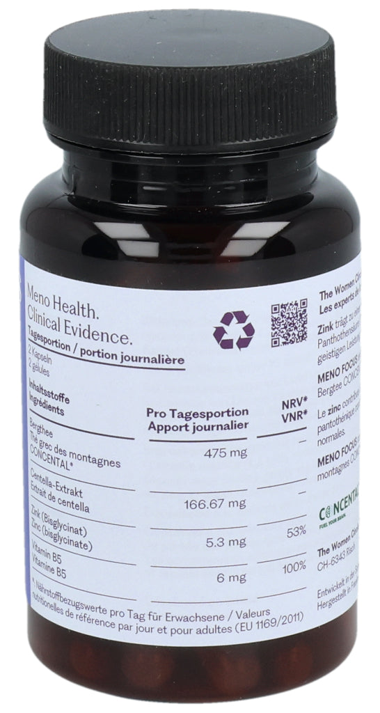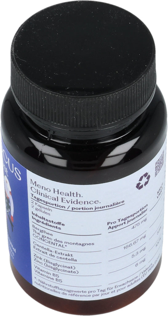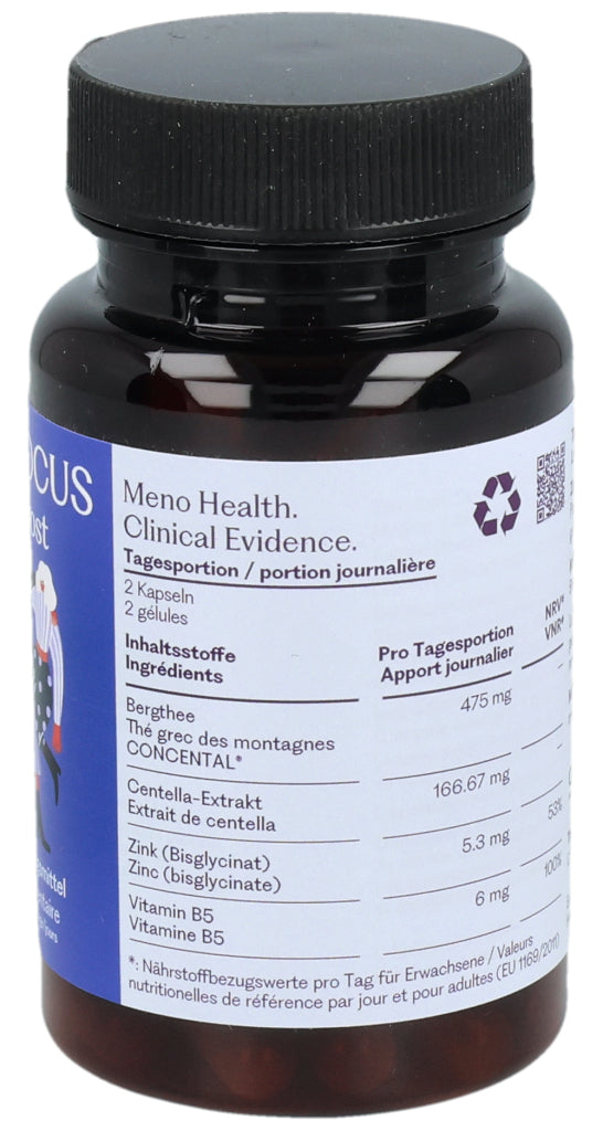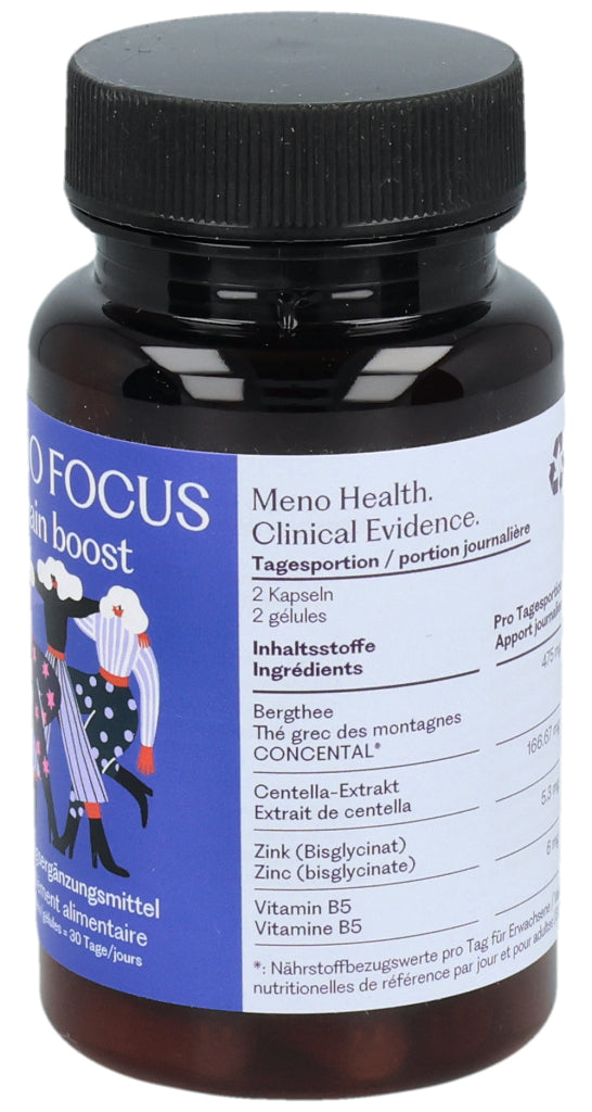 MENO FOCUS enthält zwei innovative Pflanzenextrakte: griechischer Bergtee und Gotu-Kola-Extrakt. Die Formulierung enthält auch Zink und Vitamin B5.