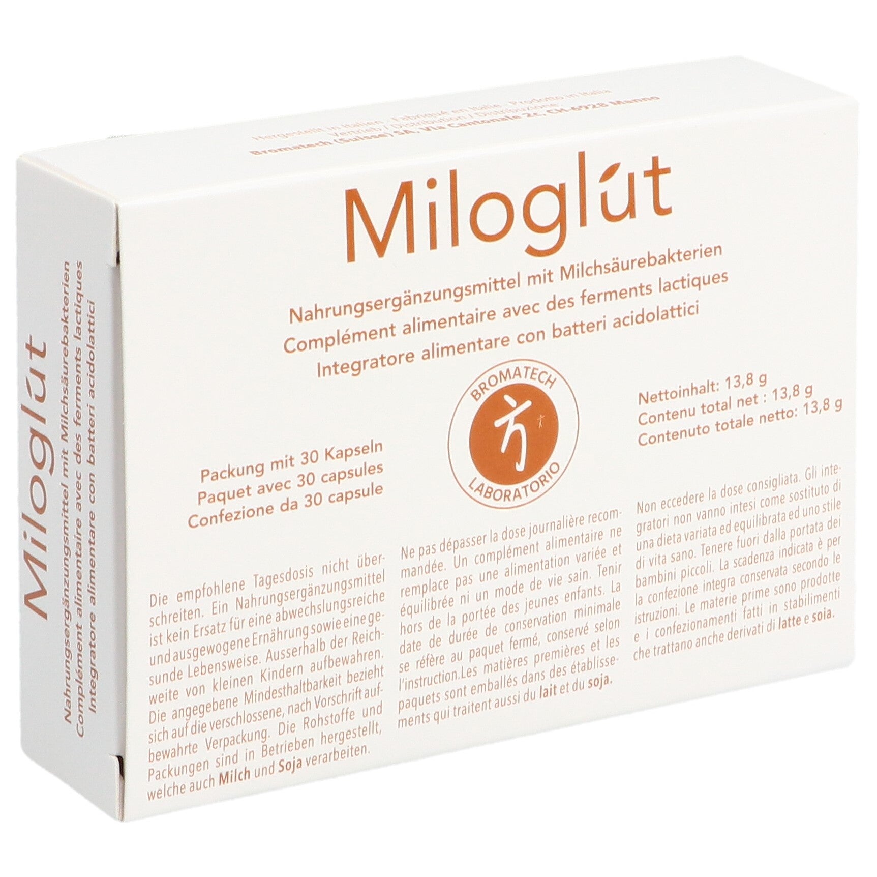 Milchsäurebakterien (Lactobacillus fermentum LF31, Lactobacillus acidophilus LA14, Lactobacillus acidophilus LBH23®); Maisstärke; Hydroxypropylmethylcellulose (Kapselhülle); Maltodextrin aus Mais; Prolyloligopeptidase; Füllstoff mikrokristalline Cellulose (Cellulose-Gel); Trennmittel: Speisefettsäuren, Magnesiumsalze der Speisefettsäuren. Pro 2 Kapseln: 109 KBE (koloniebildende Einheiten) Milchsäurebakterien.