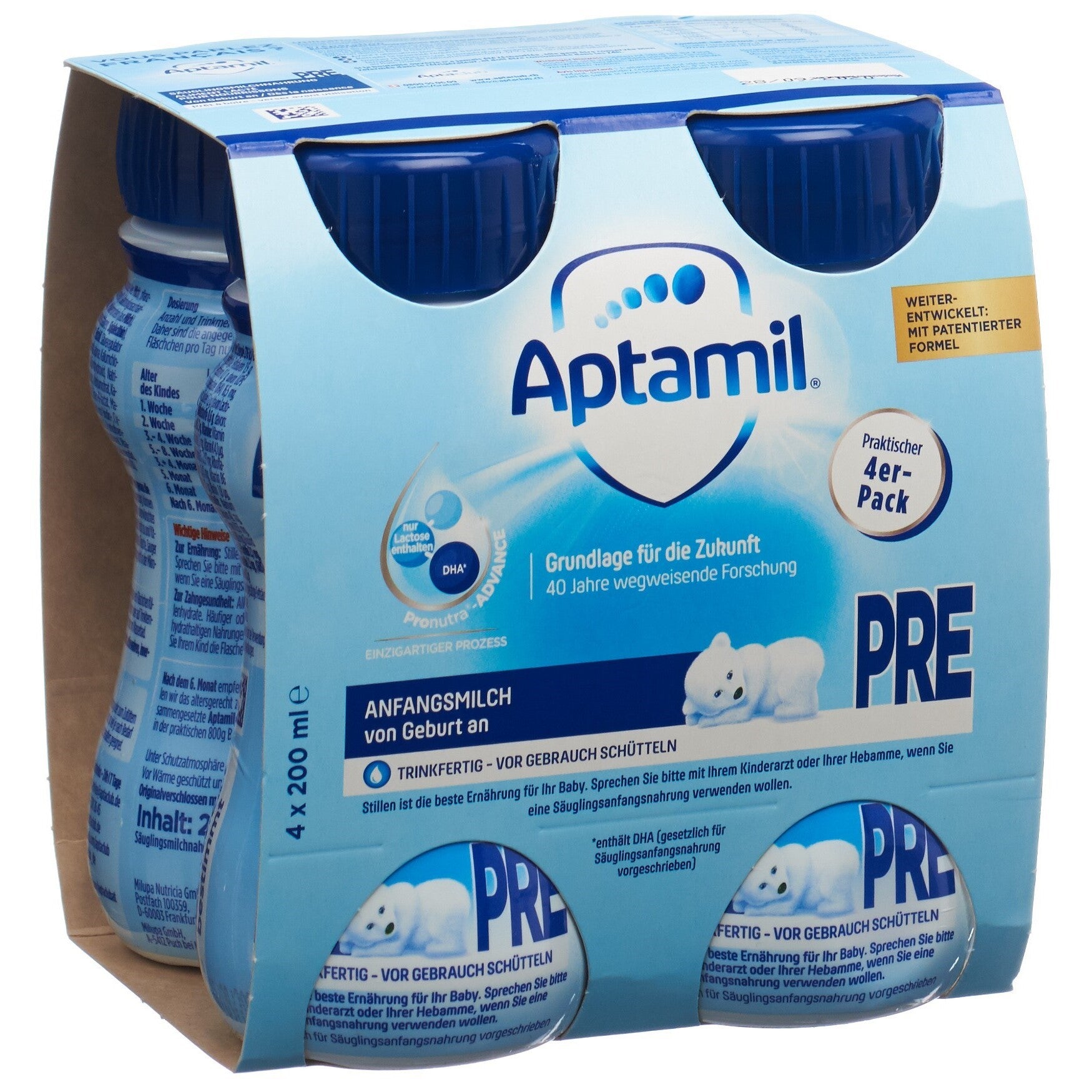 Zubereitung: Beachten Sie bei der Zubereitung von Aptamil® Pre genau die Gebrauchsanweisung. Unsachgemässe Zubereitung und Lagerung kann zu gesundheitlichen Beeinträchtigungen durch Wachstum unerwünschter Keime führen. Bereiten Sie die Nahrung vor jeder Mahlzeit frisch zu und füttern Sie diese sofort. Nahrungsreste nicht wiederverwenden. Flasche, Sauger und Ring gründlich reinigen. Erwärmen Sie Milchnahrung nicht in der Mikrowelle (Überhitzungsgefahr). 1. Vor Gebrauch kräftig schütteln. 2. Benötigte Trinkmenge in ein Fläschchen füllen. 3. Mahlzeit wahlweise bei Zimmertemperatur füttern oder auf Trinktemperatur (ca. 37°C) erwärmen, z.B. im Flaschenwärmer oder im Wasserbad. Angebrochene, nicht erwärmte Flasche verschlossen im Kühlschrank (≤4°C) aufbewahren, innerhalb von 24h aufbrauchen. Dosierung: Anzahl und Trinkmenge pro Fläschchen variieren individuell. Daher sind die angegebenen Trinkmengen und die Anzahl der Fläschchen pro Tag nur empfohlene Richtwerte. Alter des Kindes 1. Woche 5-7 Flaschenmahlzeiten pro Tag, 70 ml trinkfertige Nahrung; 2. Woche 6 Flaschenmahlzeiten pro Tag, 100 ml trinkfertige Nahrung; 3.-4. Woche 5-6 Flaschenmahlzeiten pro Tag, 130 ml Trinkfertige Nahrung; 5.-8. Woche 5 Flaschenmahlzeiten pro Tag, 170 ml Trinkfertige Nahrung; 3.+4. Monat 4-5 Flaschenmahlzeiten pro Tag, 200 ml Trinkfertige Nahrung; 5. Monat 4 Flaschenmahlzeiten pro Tag; 230 ml Trinkfertige Nahrung; 6. Monat 3 Flaschenmahlzeiten pro Tag, 230 ml Trinkfertige Nahrung; Nach 6. Monat 1-3 Flaschenmahlzeiten pro Tag, 230 ml Trinkfertige Nahrung.